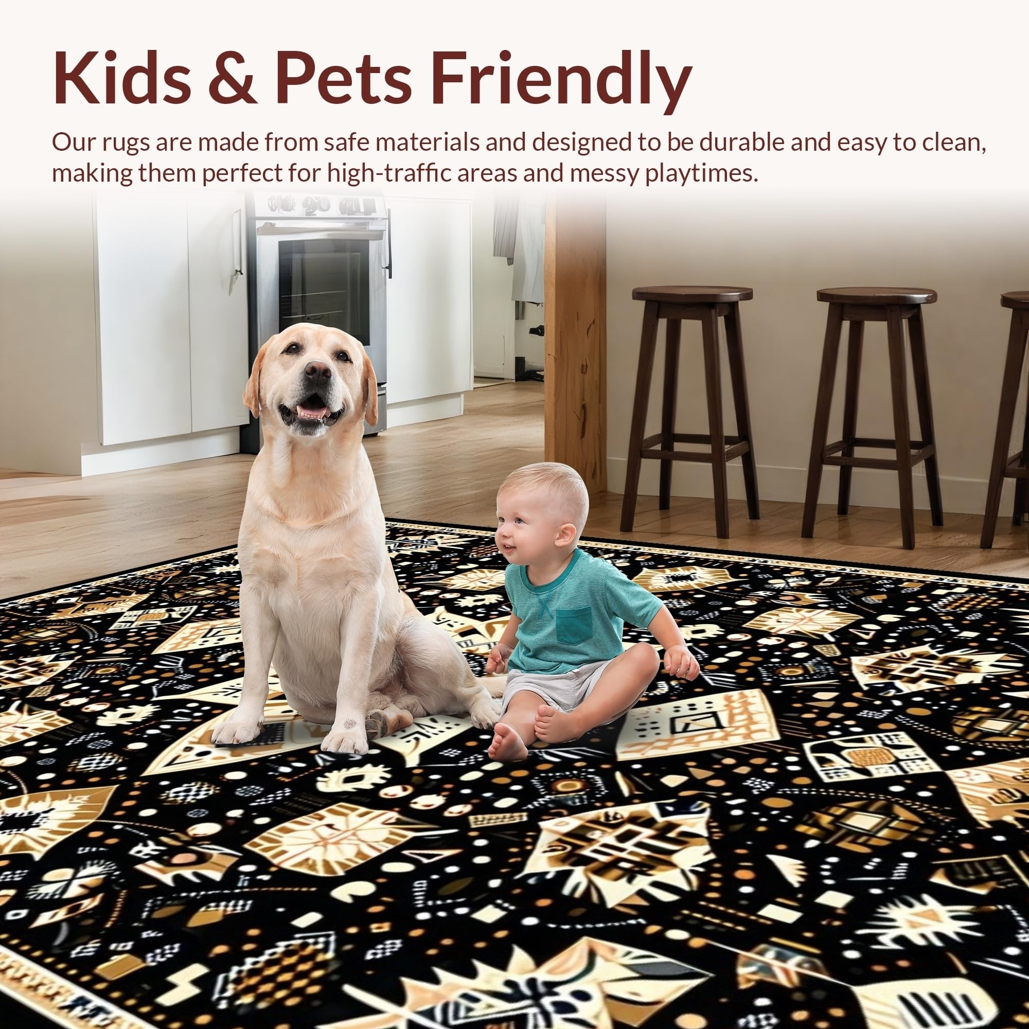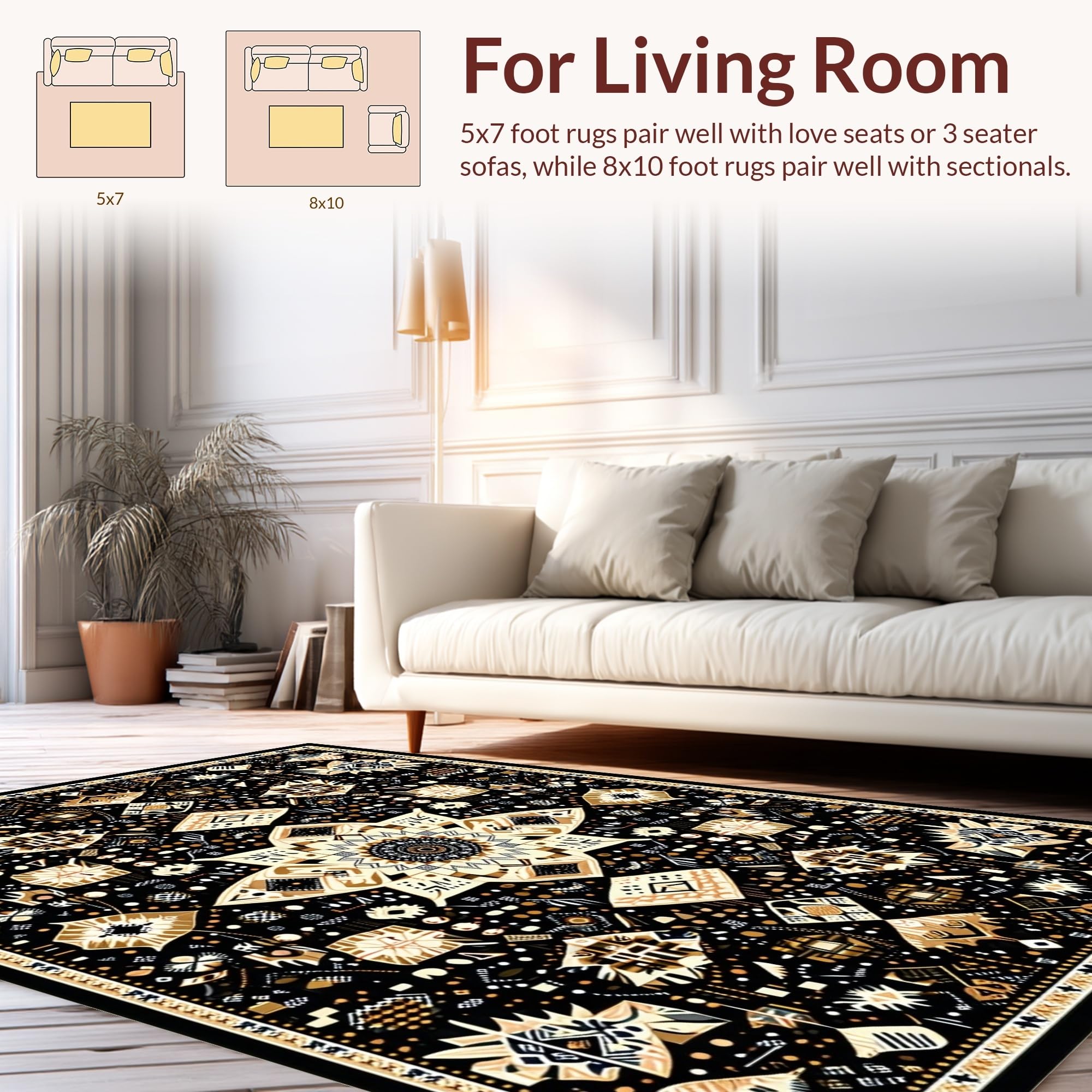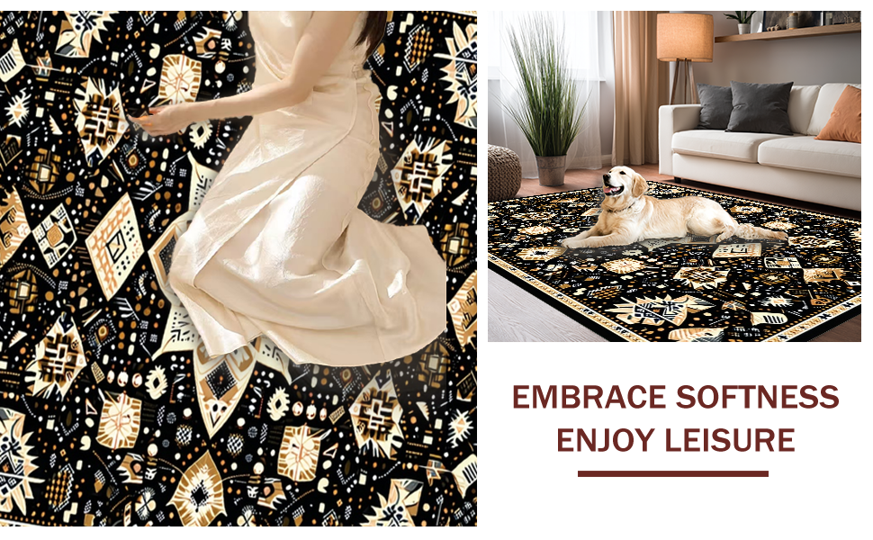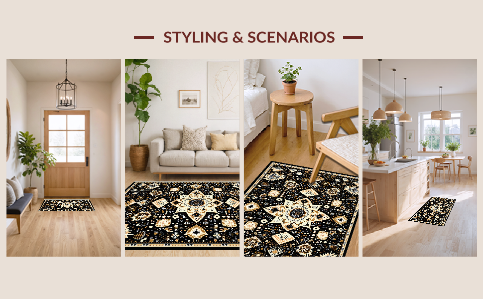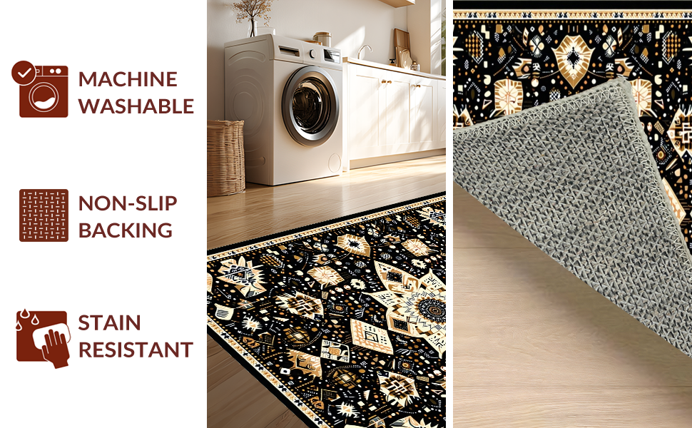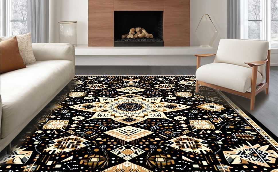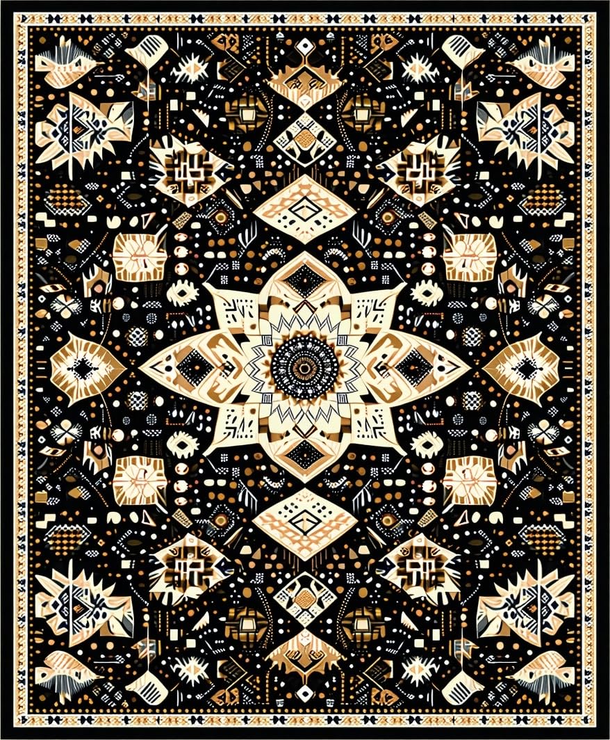 Ultra Soft Area Rug, Non Slip, Stain Resistant, Washable Area Rugs for Living Room, Bedroom, Eclectic Medallion Patterned Aesthetic(Black) Overview: