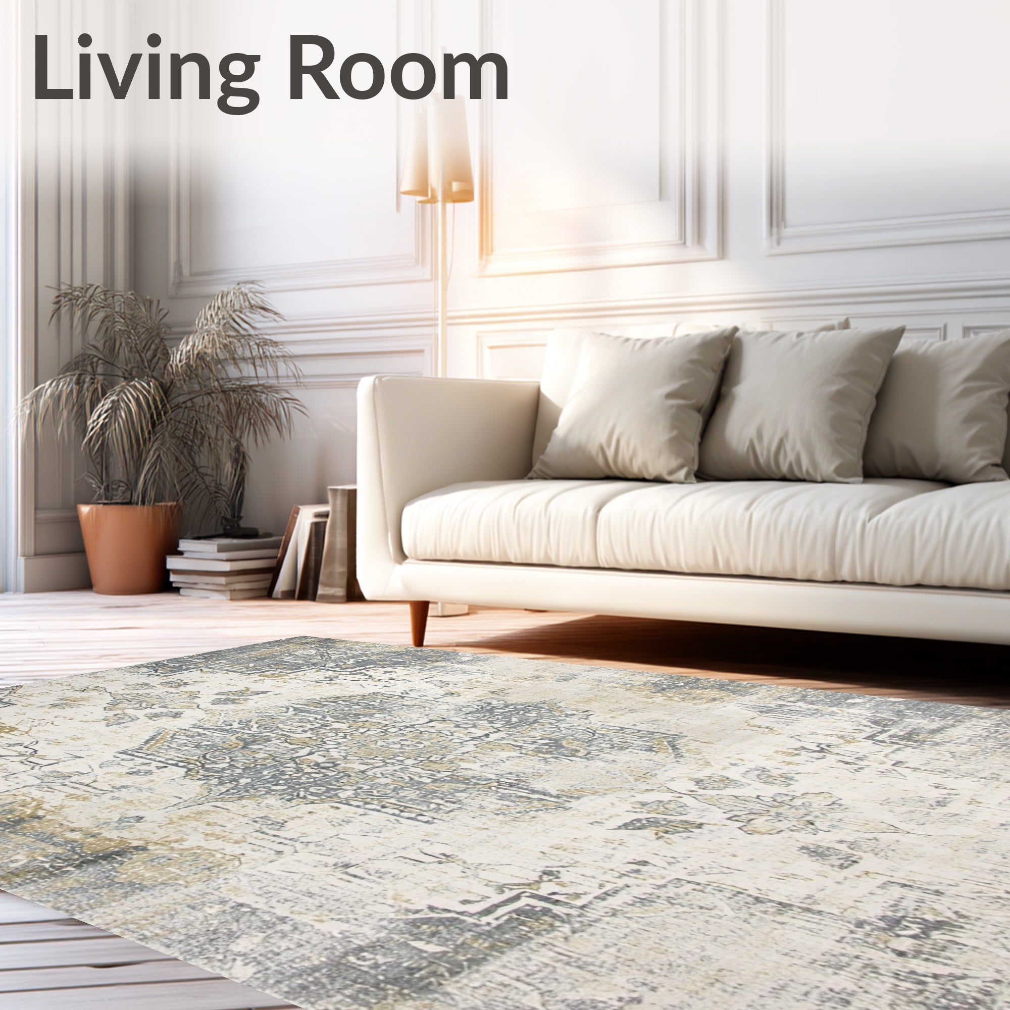 Ultra Soft Area Rug, Non Slip, Stain Resistant, Washable Area Rugs for Living Room, Bedroom, Elegant Beige and Grey Abstract Medallion with Worn Vintage Charm(Beige) Overview: