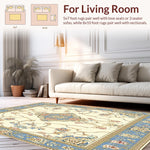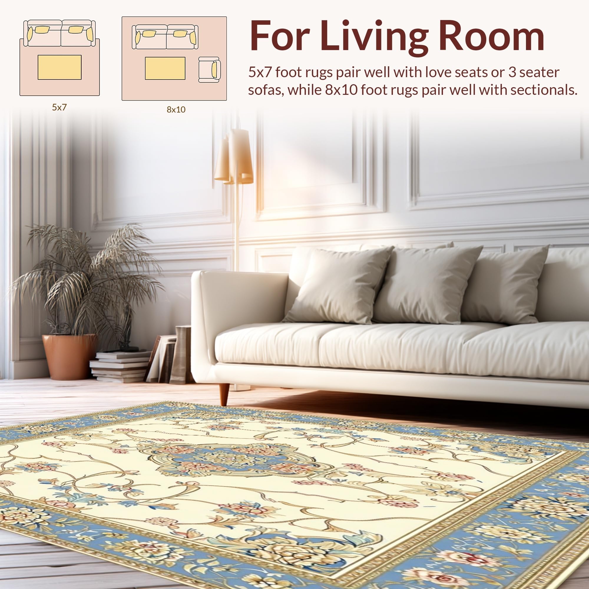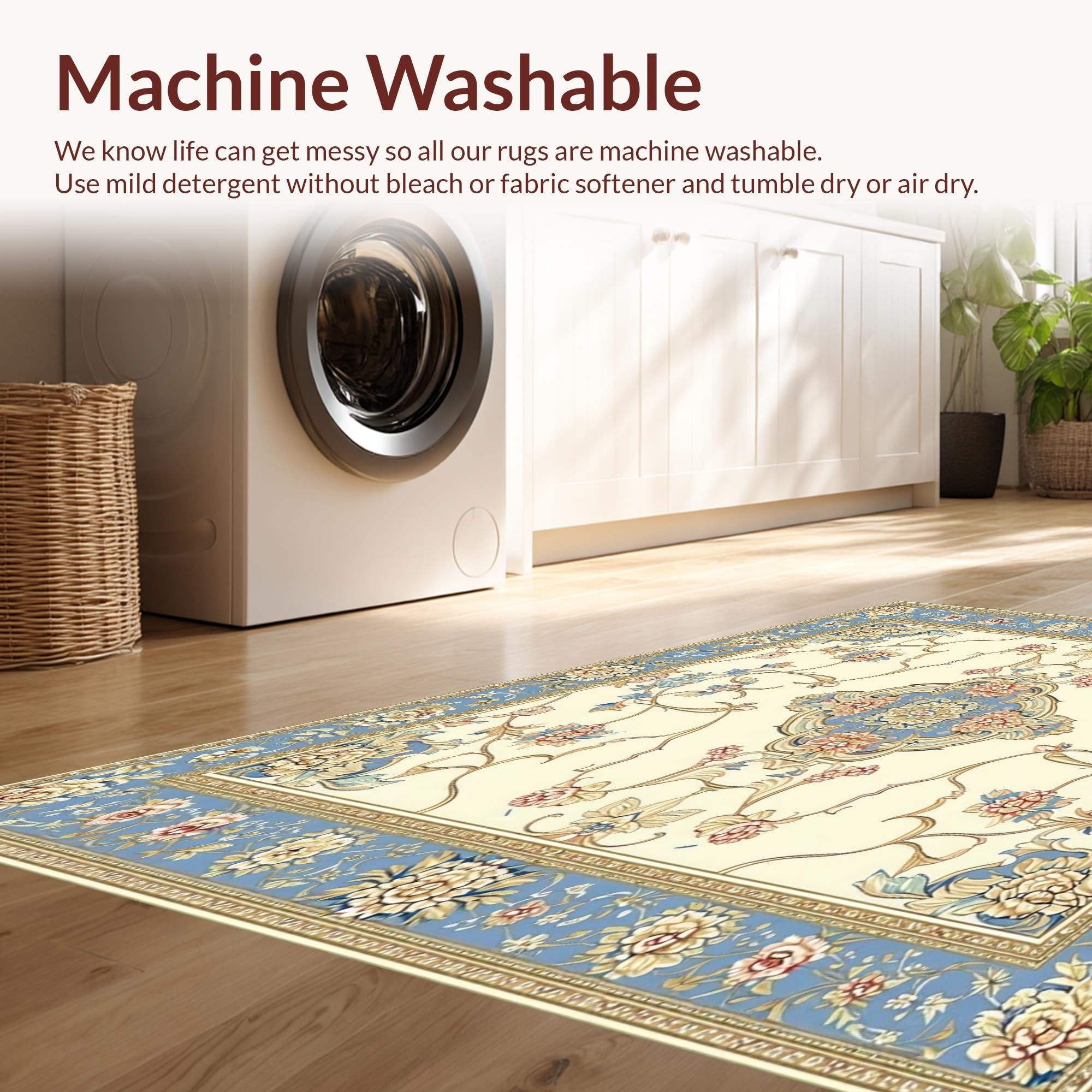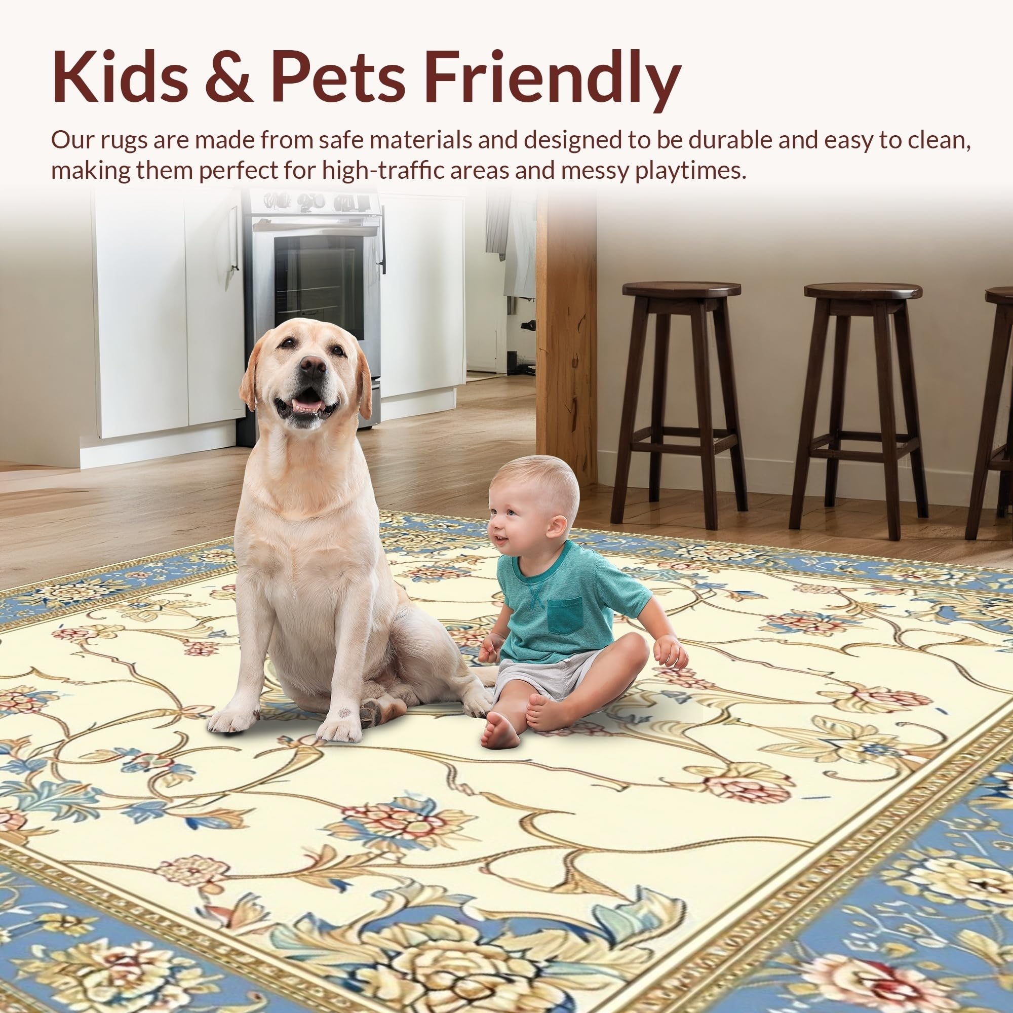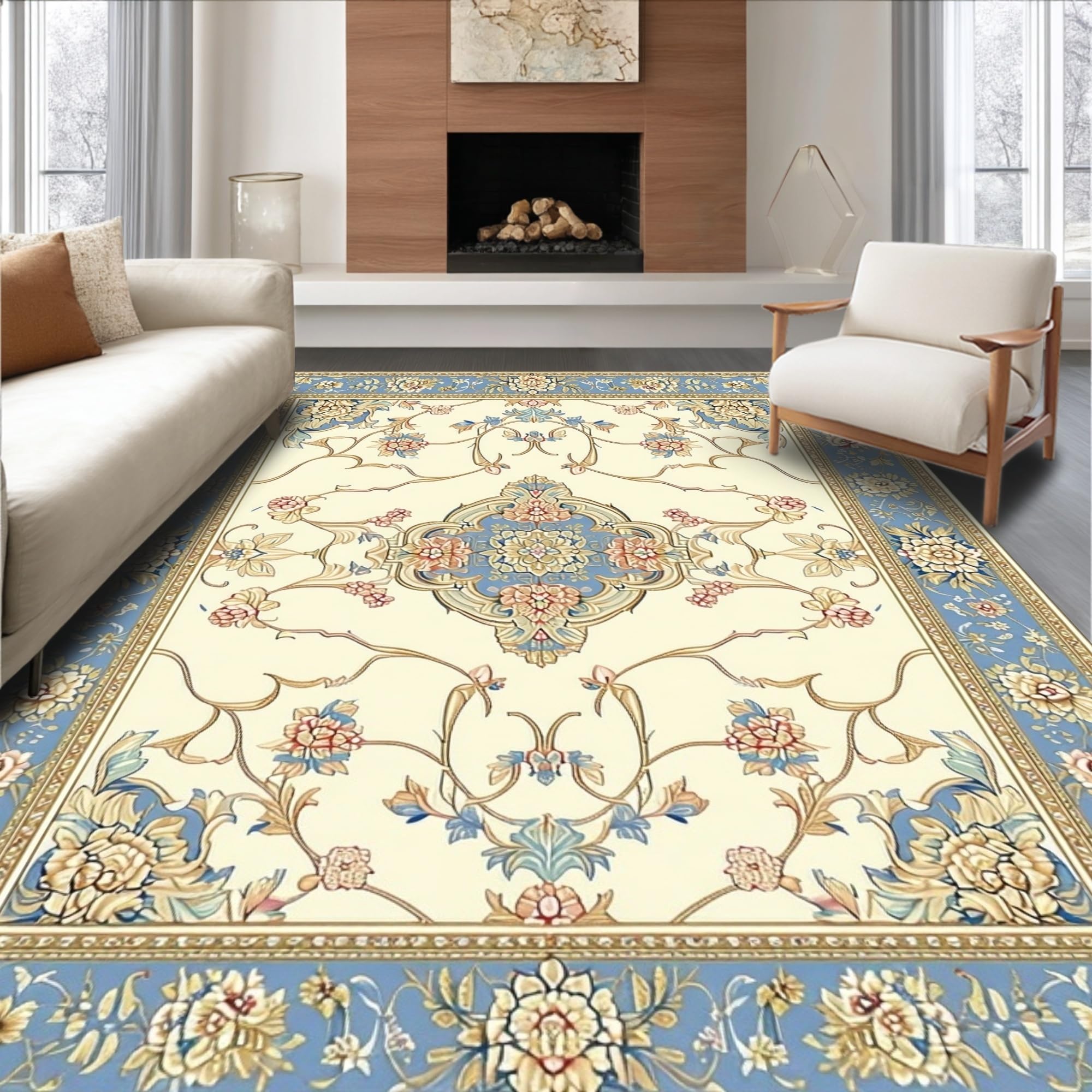 Ultra Soft Area Rug, Non Slip, Stain Resistant, Washable Area Rugs for Living Room, Bedroom, Elegant Beige and Light Blue Ornate Floral Borders(Beige) Overview: