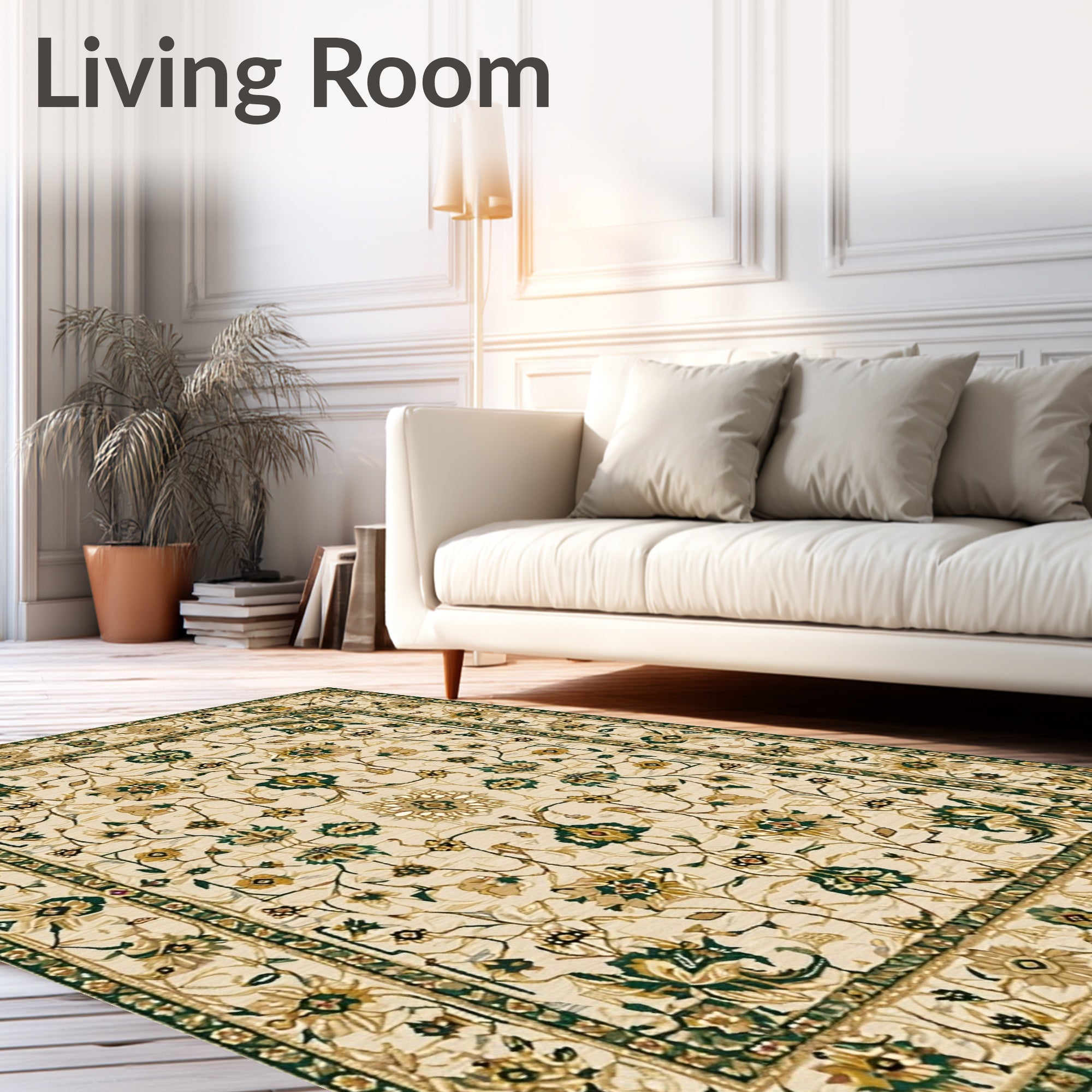 Ultra Soft Area Rug, Non Slip, Stain Resistant, Washable Area Rugs for Living Room, Bedroom, Elegant Beige Area with Intricate Floral Motifs and Green Accents(Beige) Overview: