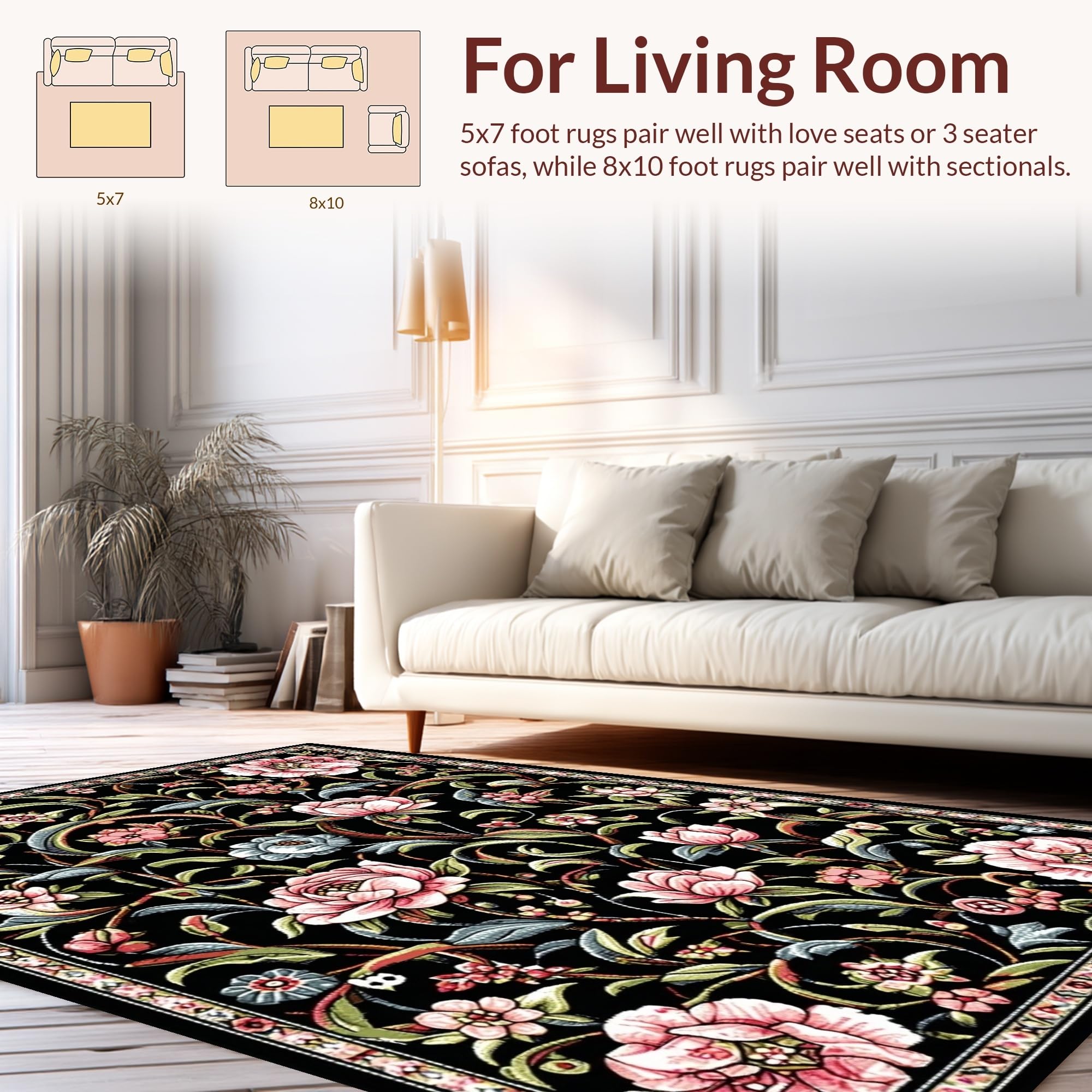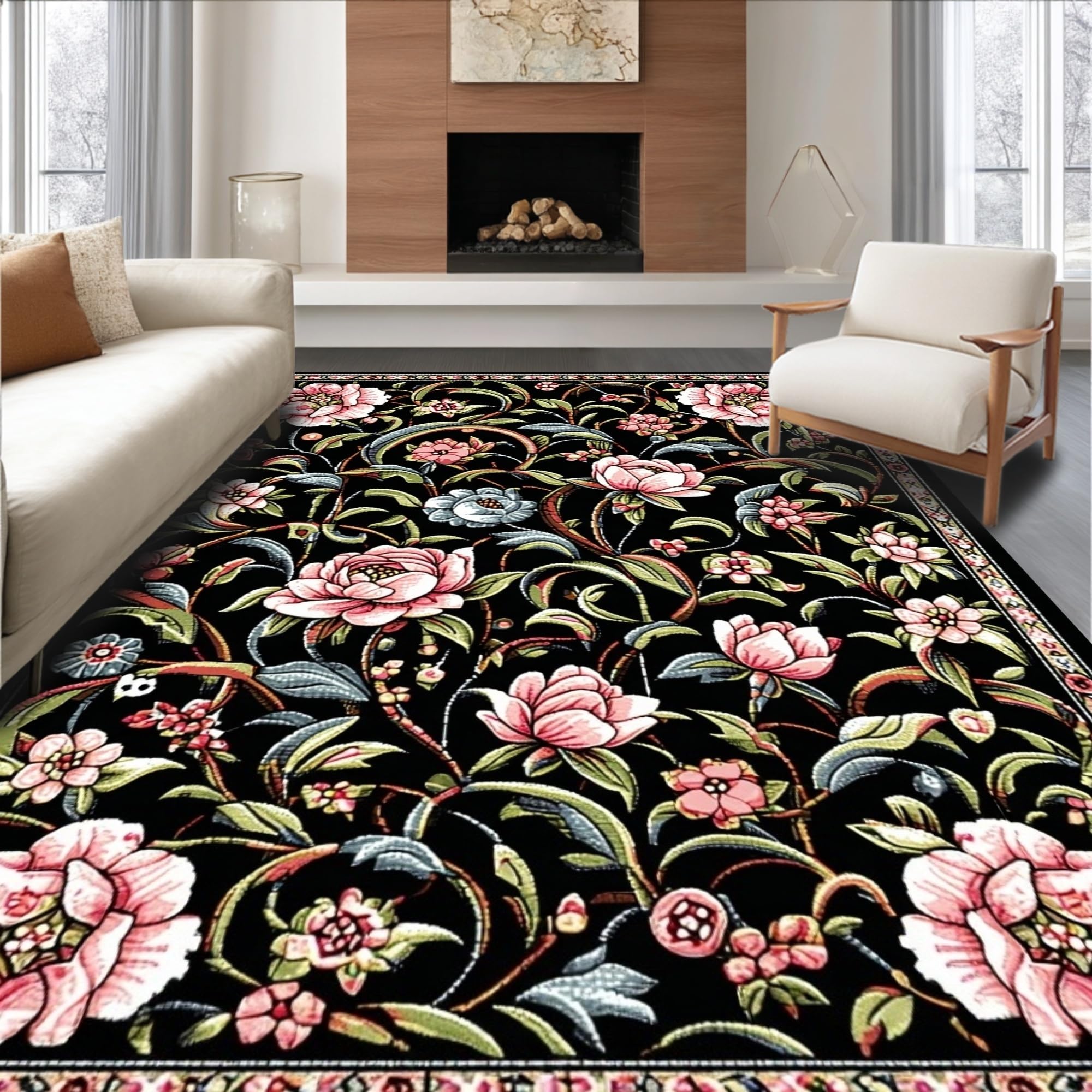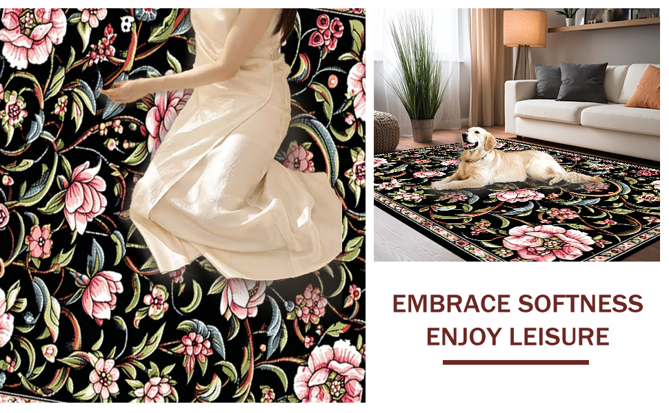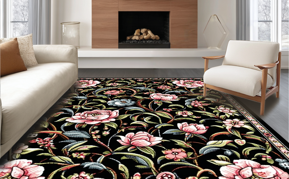Ultra Soft Area Rug, Non Slip, Stain Resistant, Washable Area Rugs for Living Room, Bedroom, Elegant Black Botanical Elements(Black) Overview: