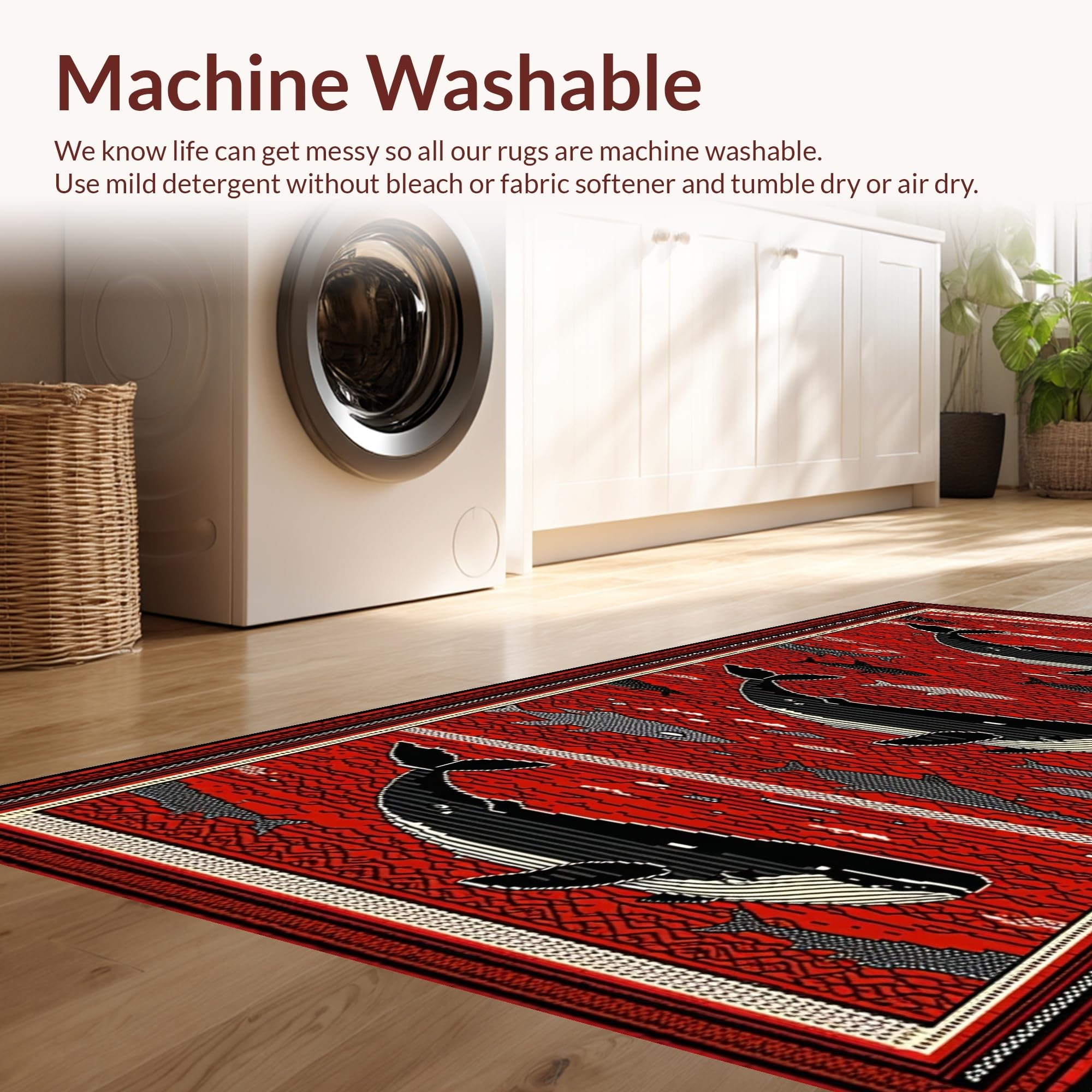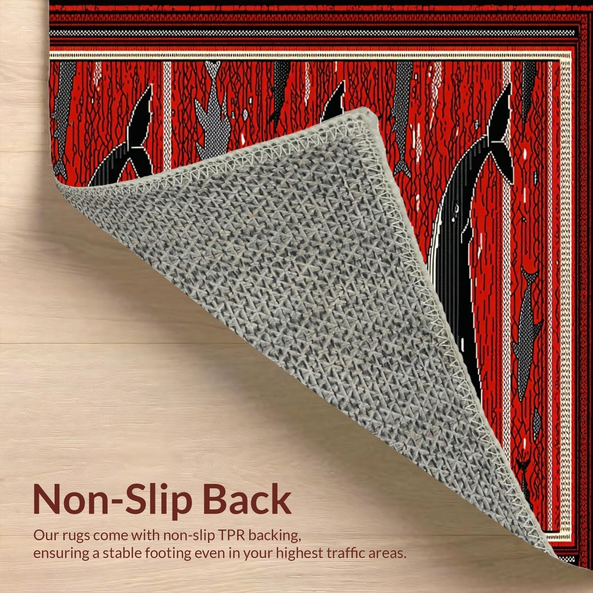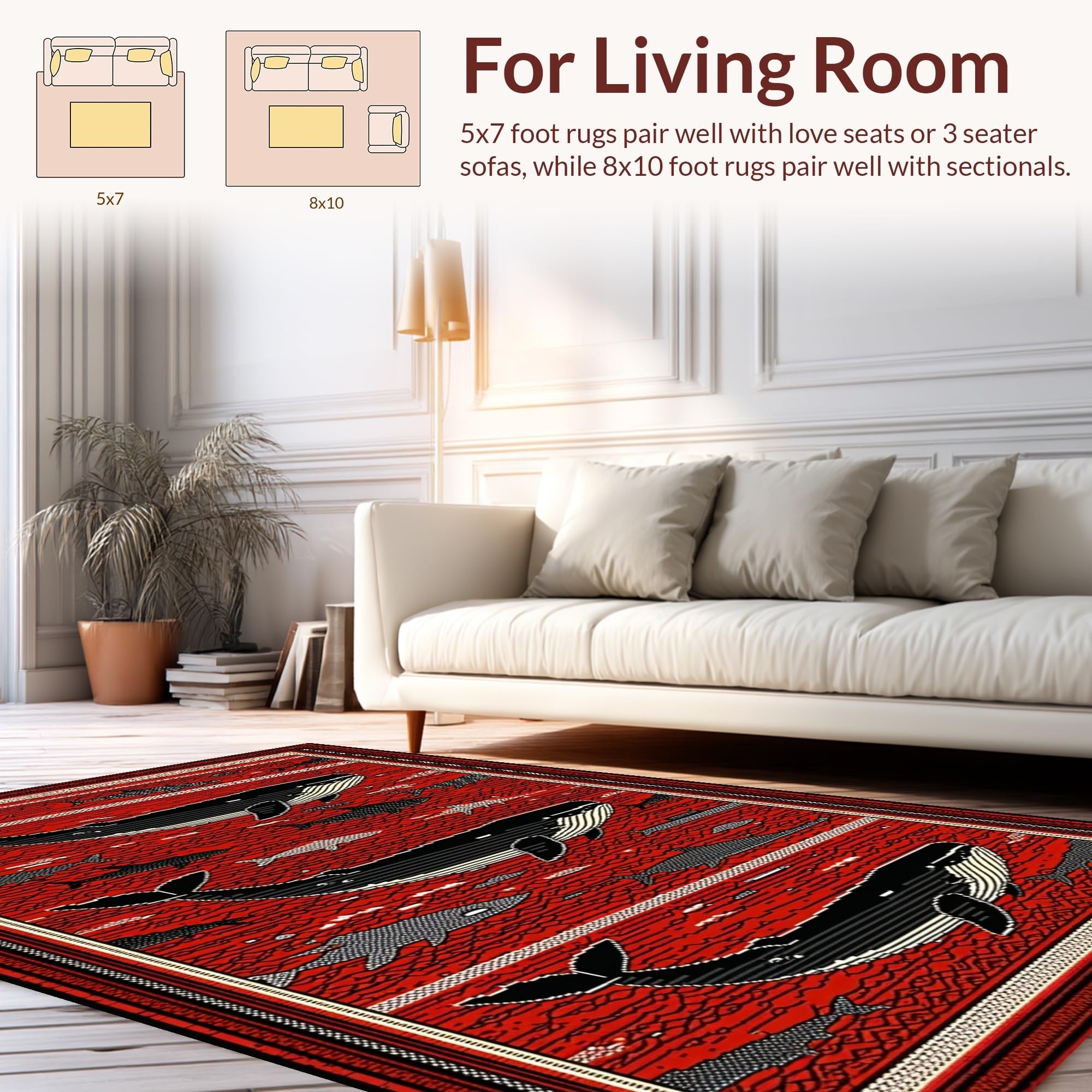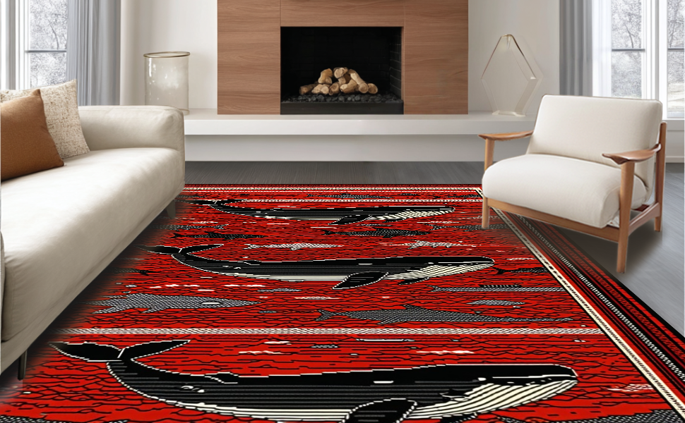 Ultra Soft Area Rug, Non Slip, Stain Resistant, Washable Area Rugs for Living Room, Bedroom, Elegant Black Whale Silhouette(Red) Overview: