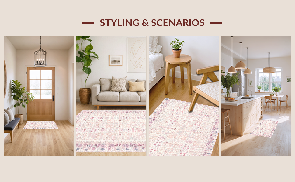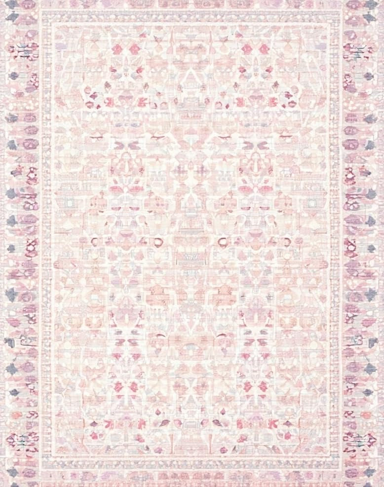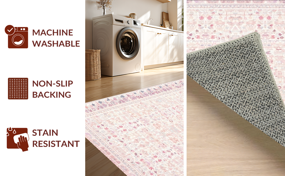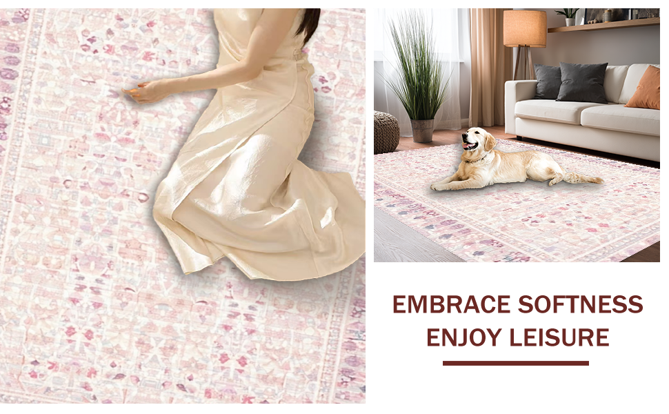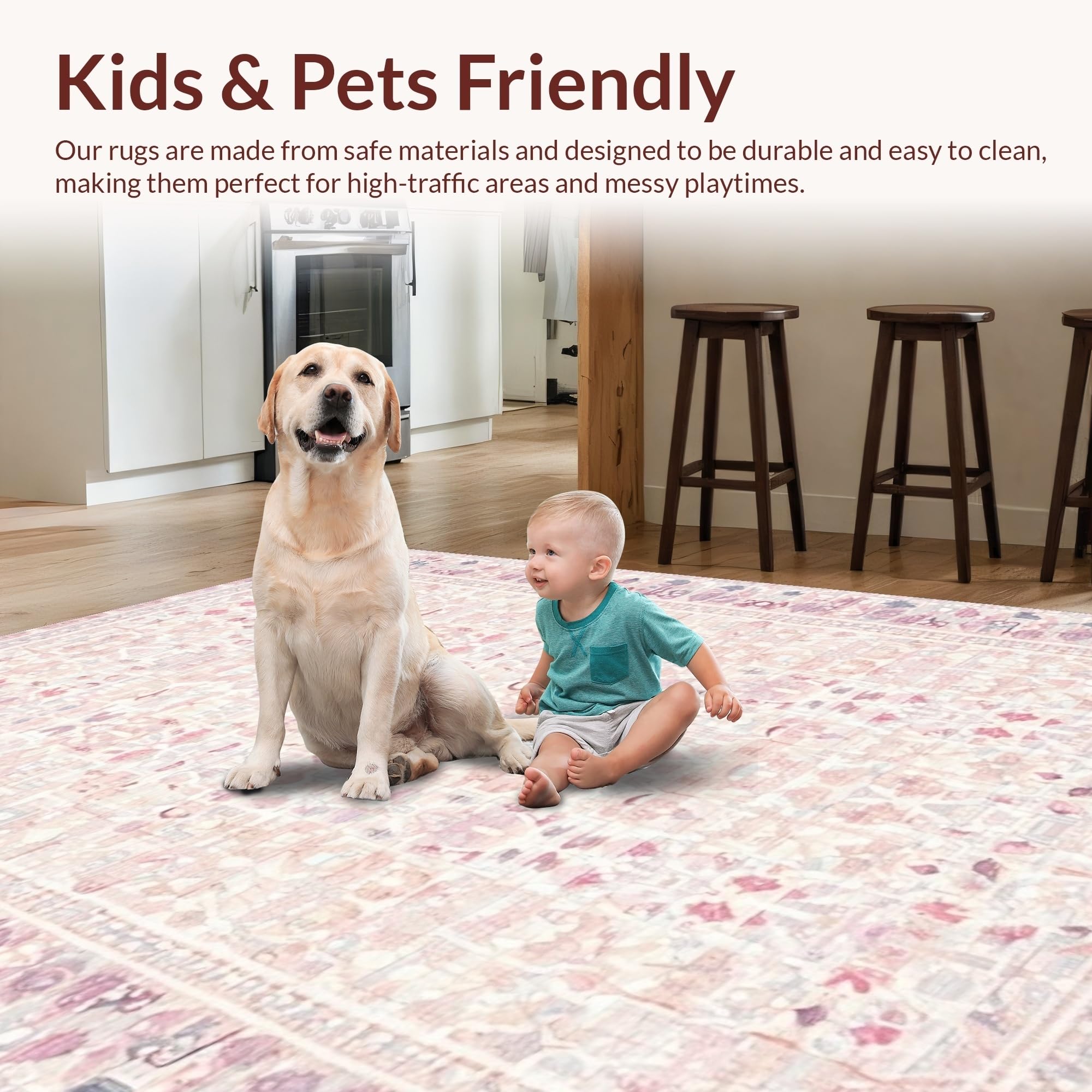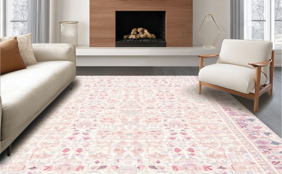Ultra Soft Area Rug, Non Slip, Stain Resistant, Washable Area Rugs for Living Room, Bedroom, Elegant Blush Pink Low Pile Rug with Mauve Floral and Geometric Fusion(Pink) Overview: