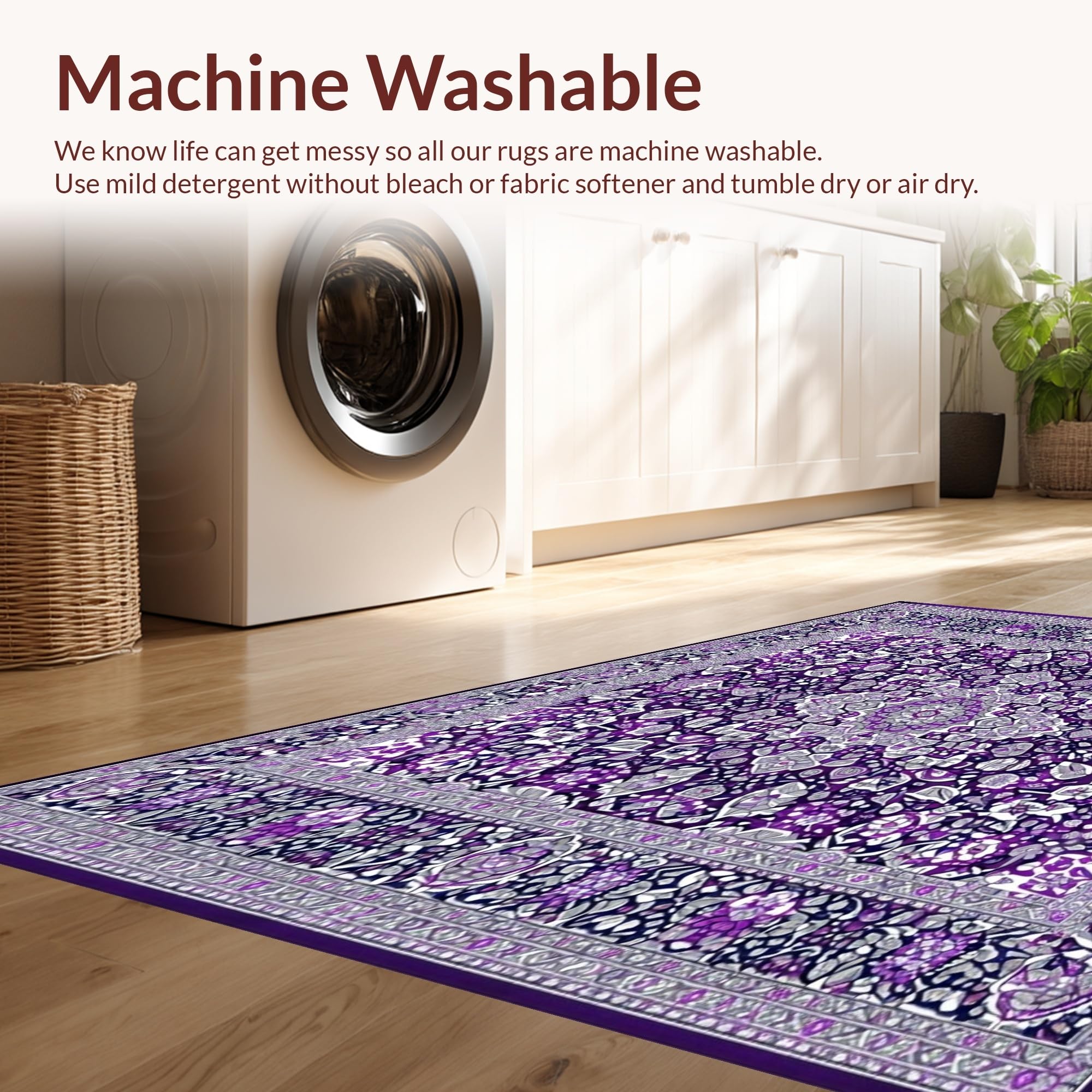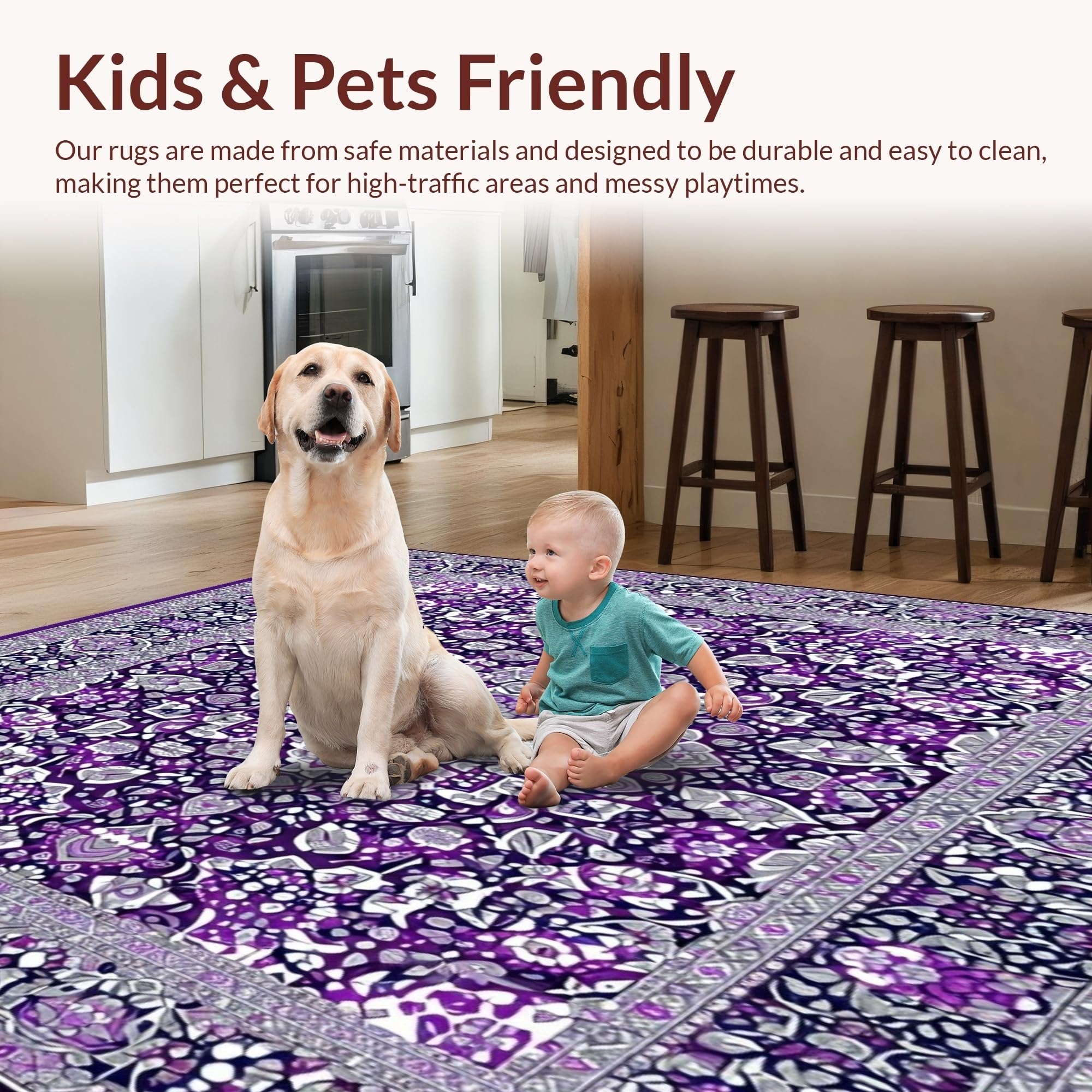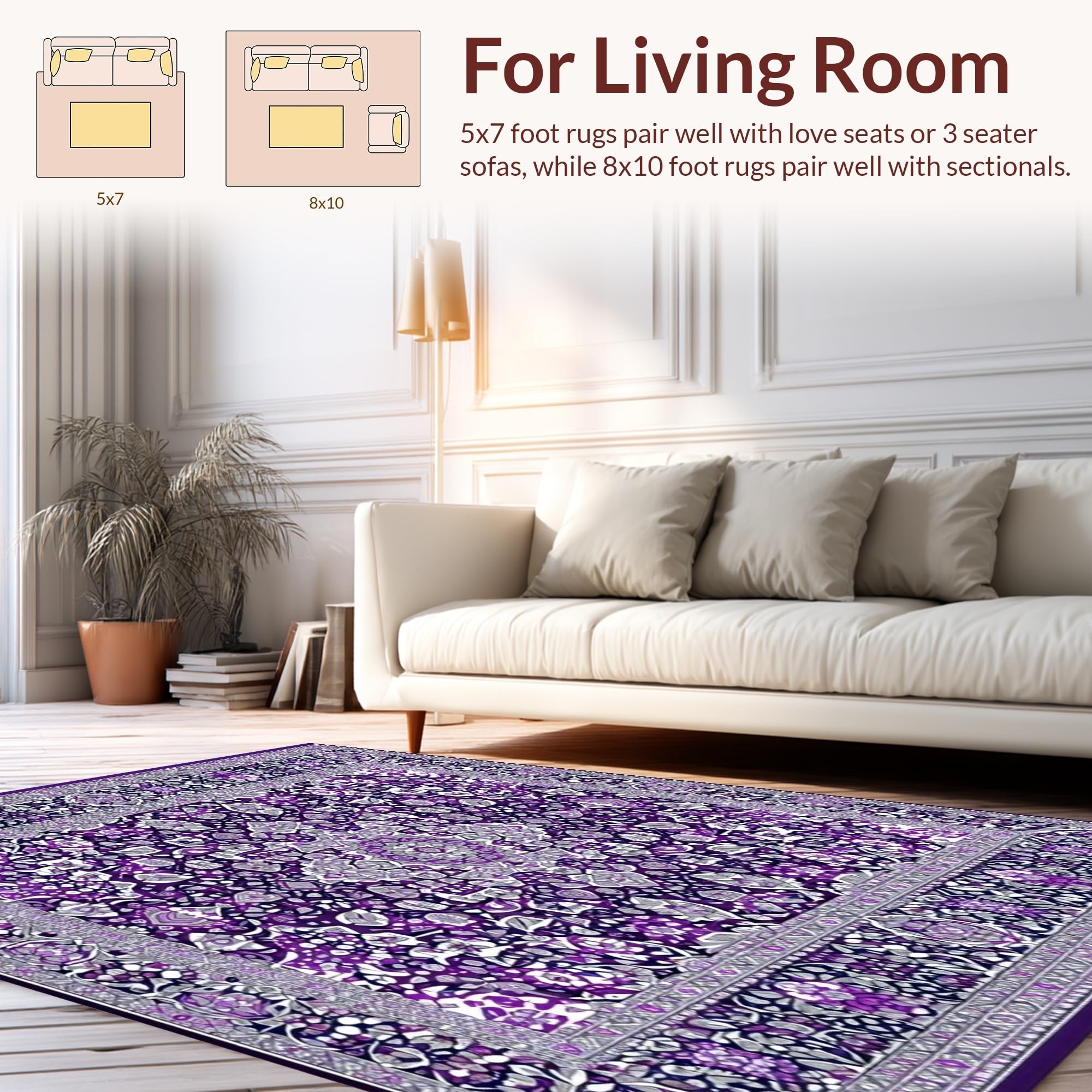 Ultra Soft Area Rug, Non Slip, Stain Resistant, Washable Area Rugs for Living Room, Bedroom, Elegant Floral Area with Purple and Silver Design(Purple) Overview: