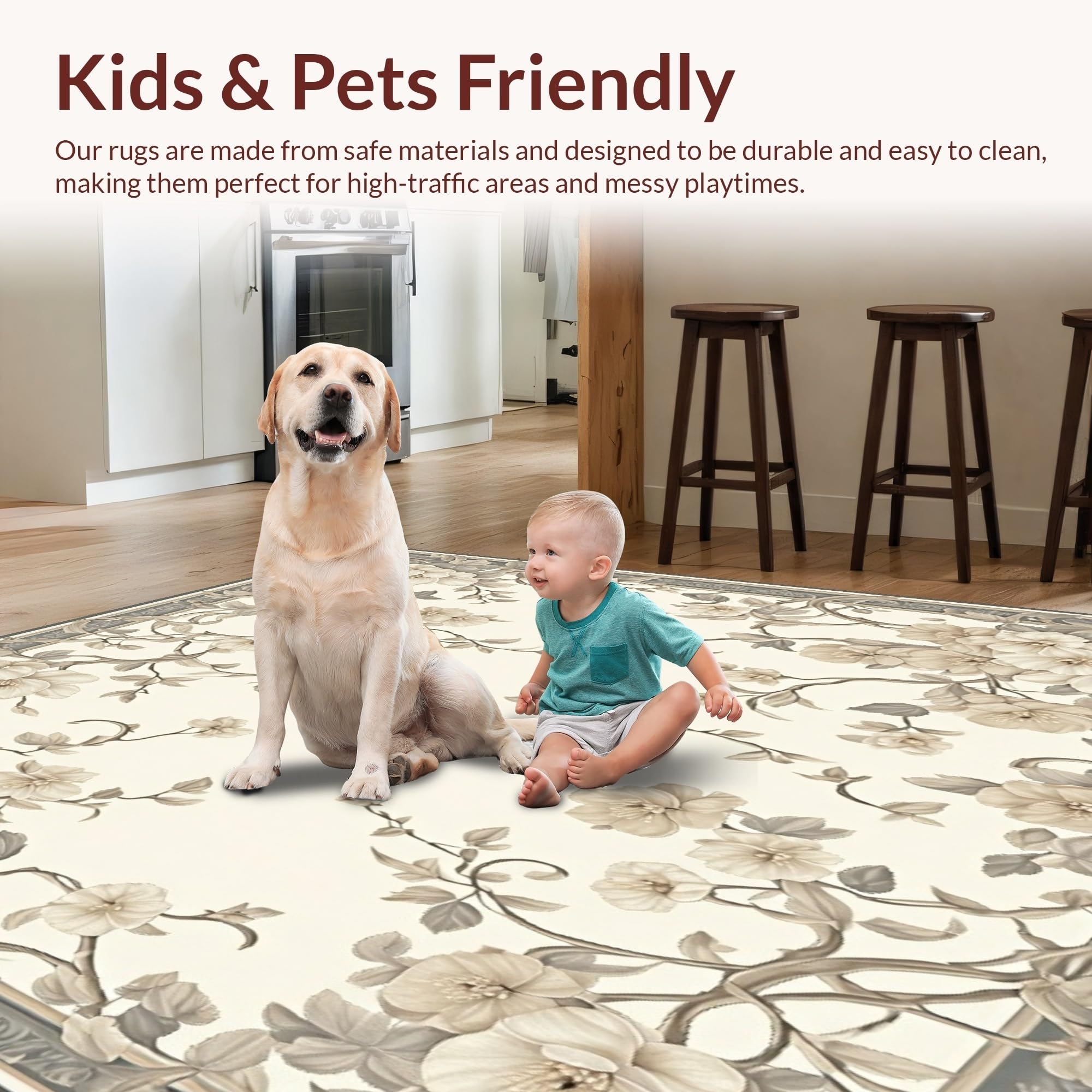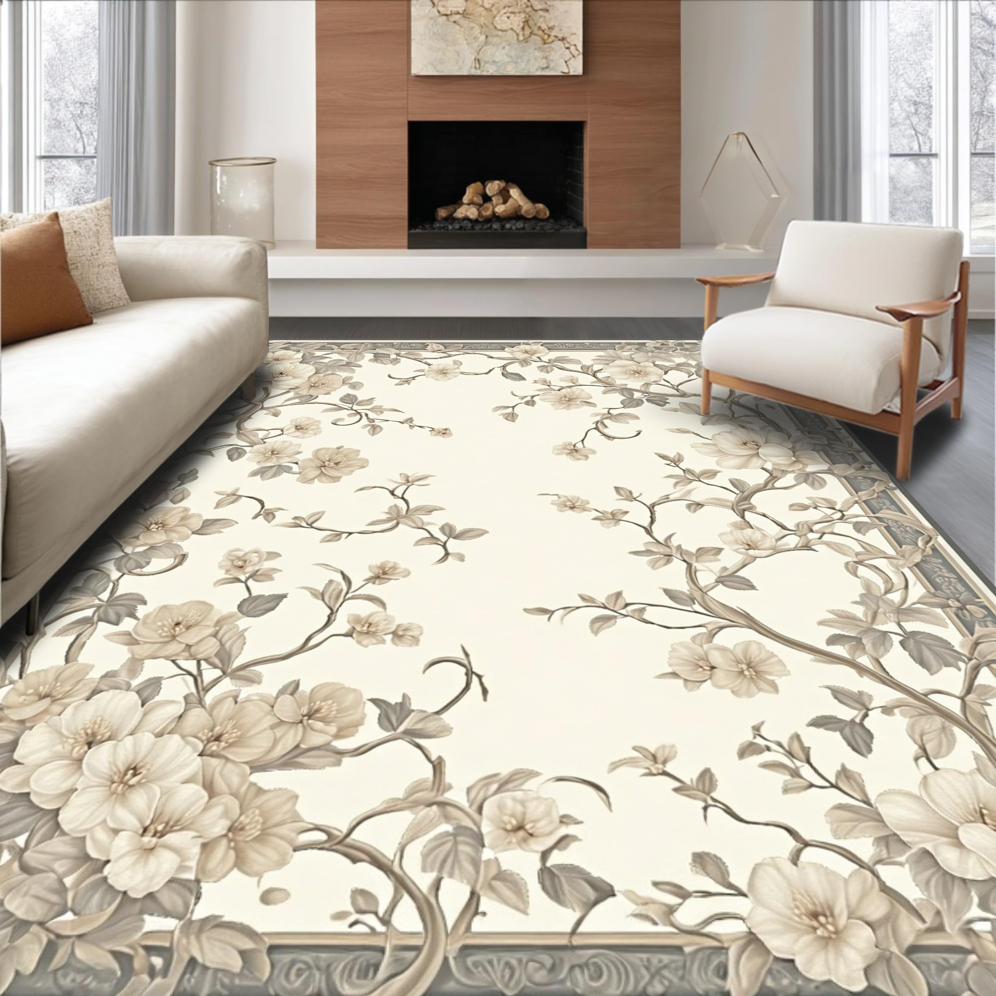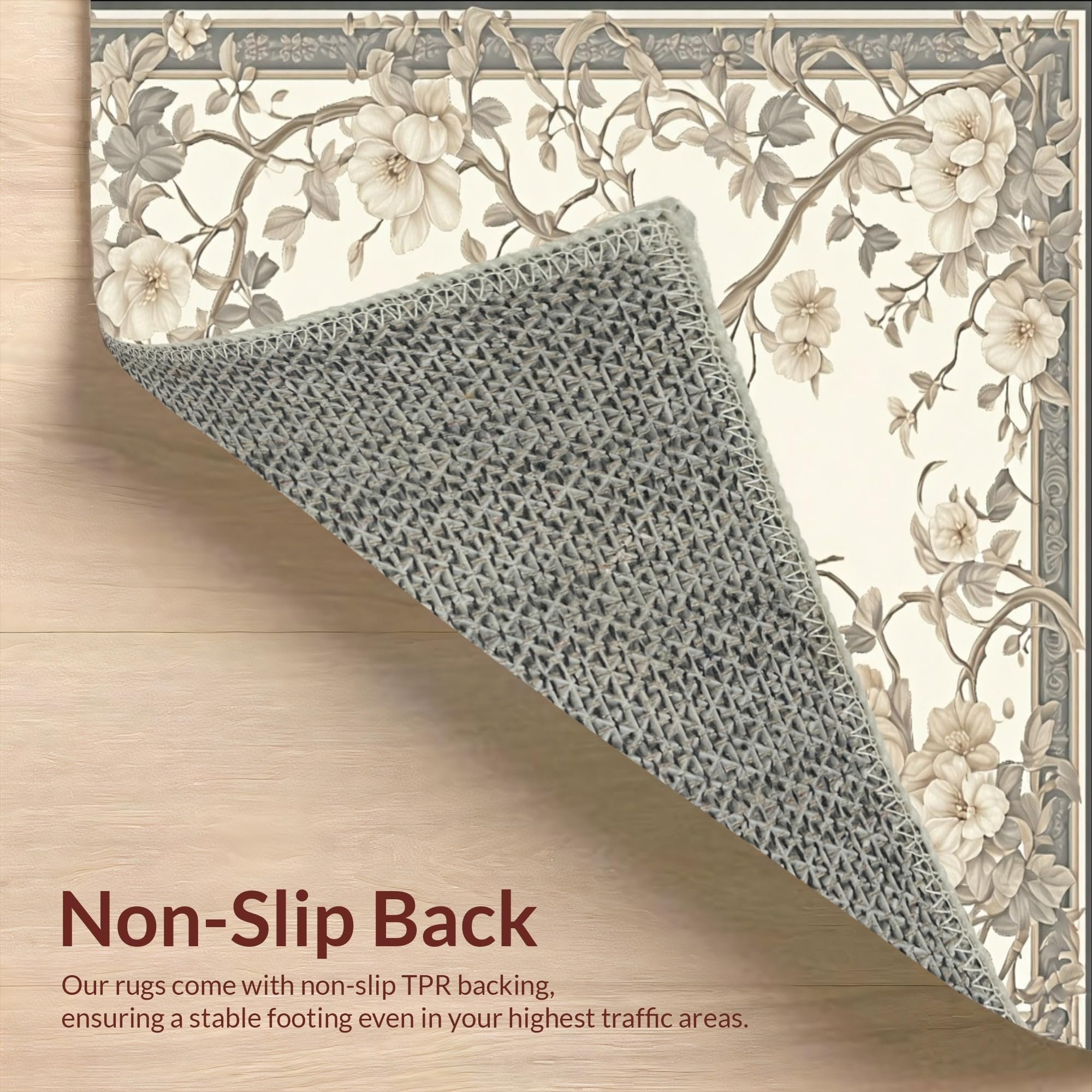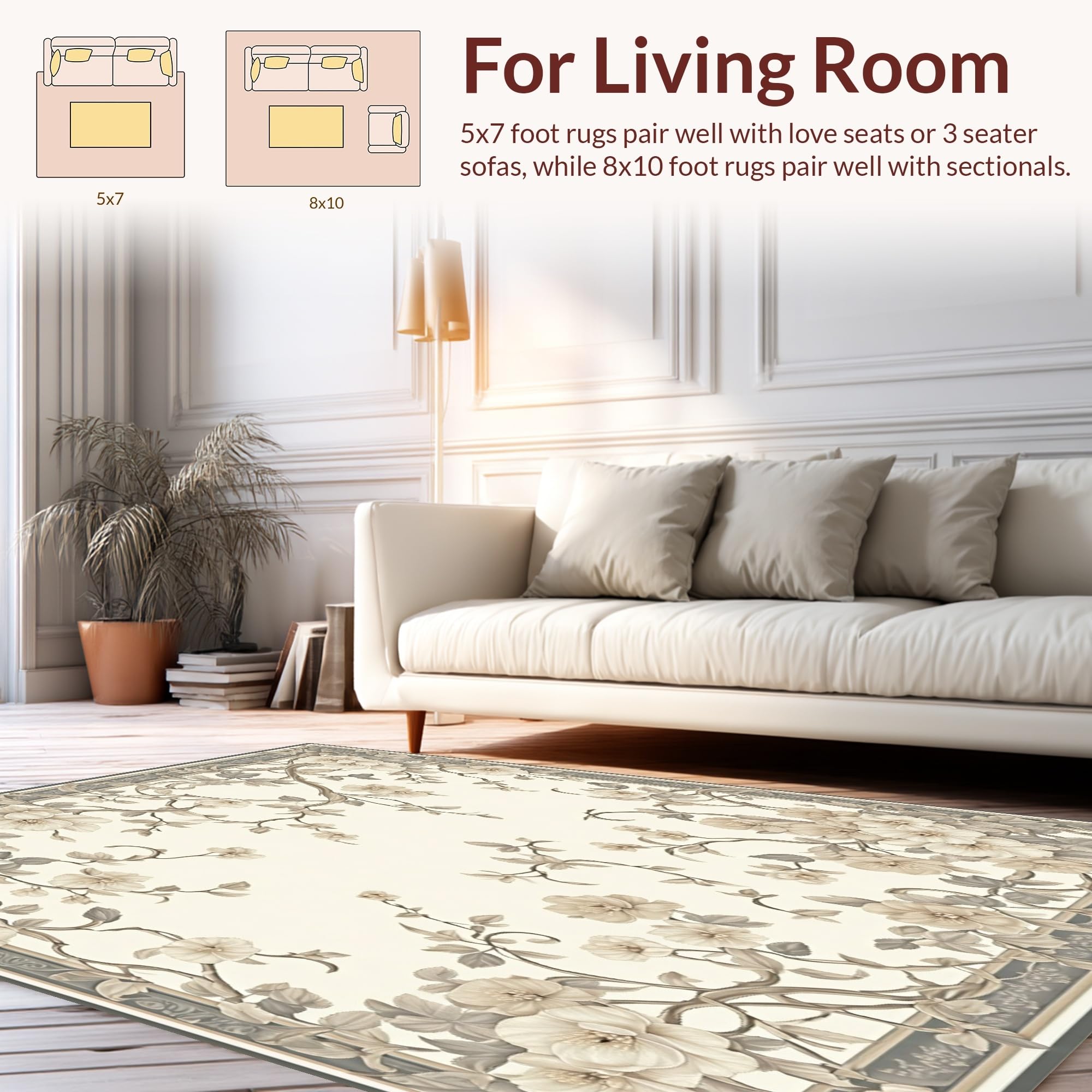 Ultra Soft Area Rug, Non Slip, Stain Resistant, Washable Area Rugs for Living Room, Bedroom, Elegant Floral in Smoke and Beige Non Shedding(Beige) Overview:
