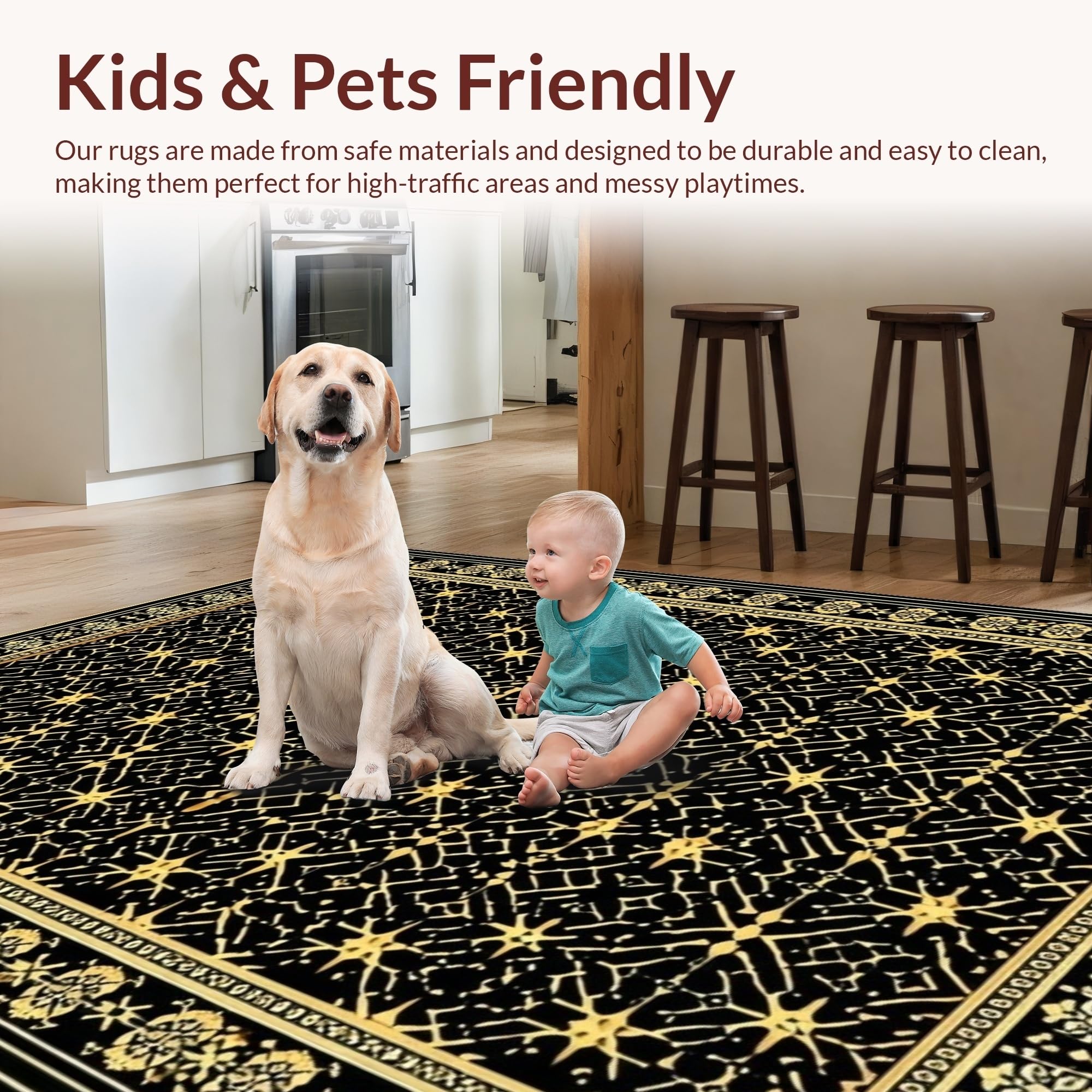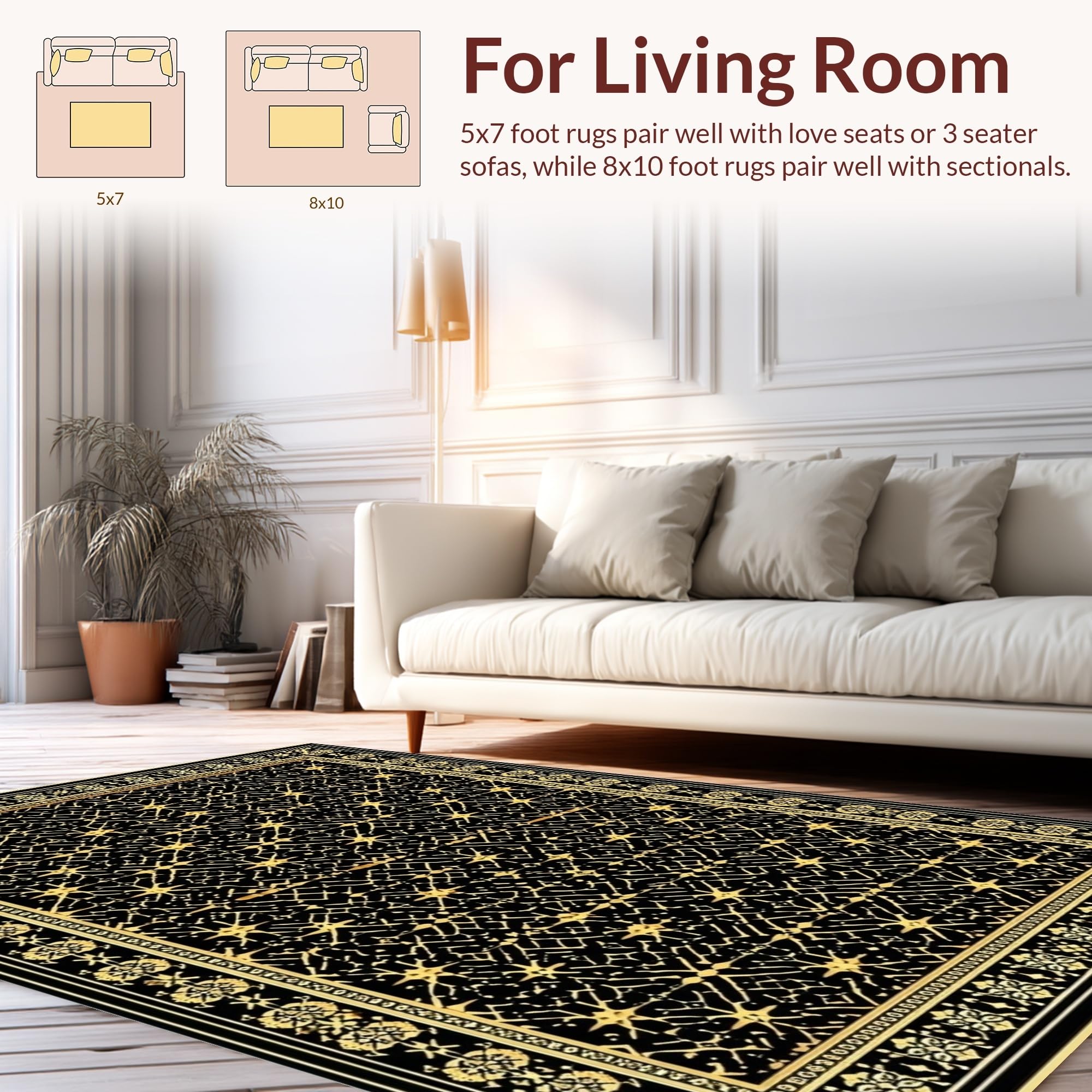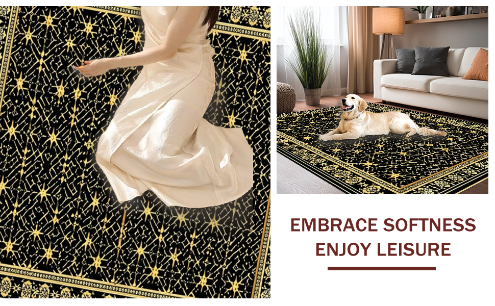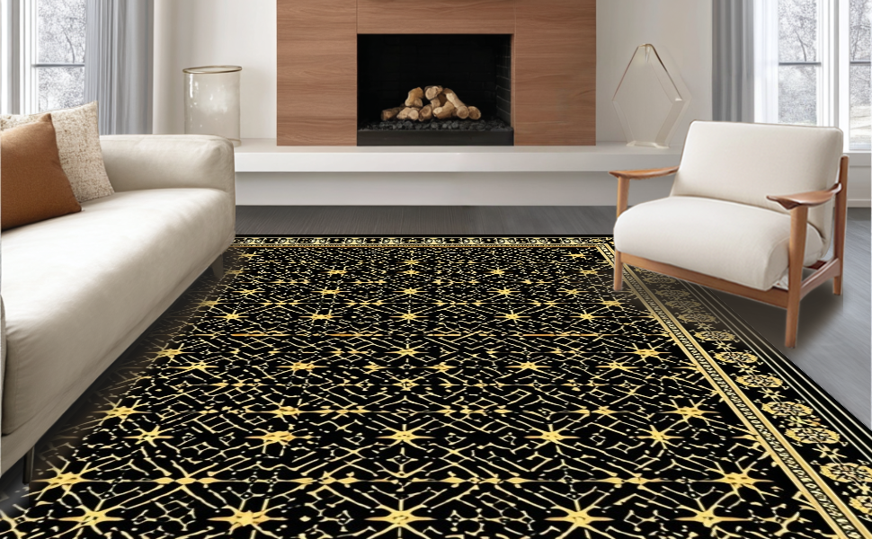 Ultra Soft Area Rug, Non Slip, Stain Resistant, Washable Area Rugs for Living Room, Bedroom, Elegant Geometric Black Gold Fusion(Black) Overview: