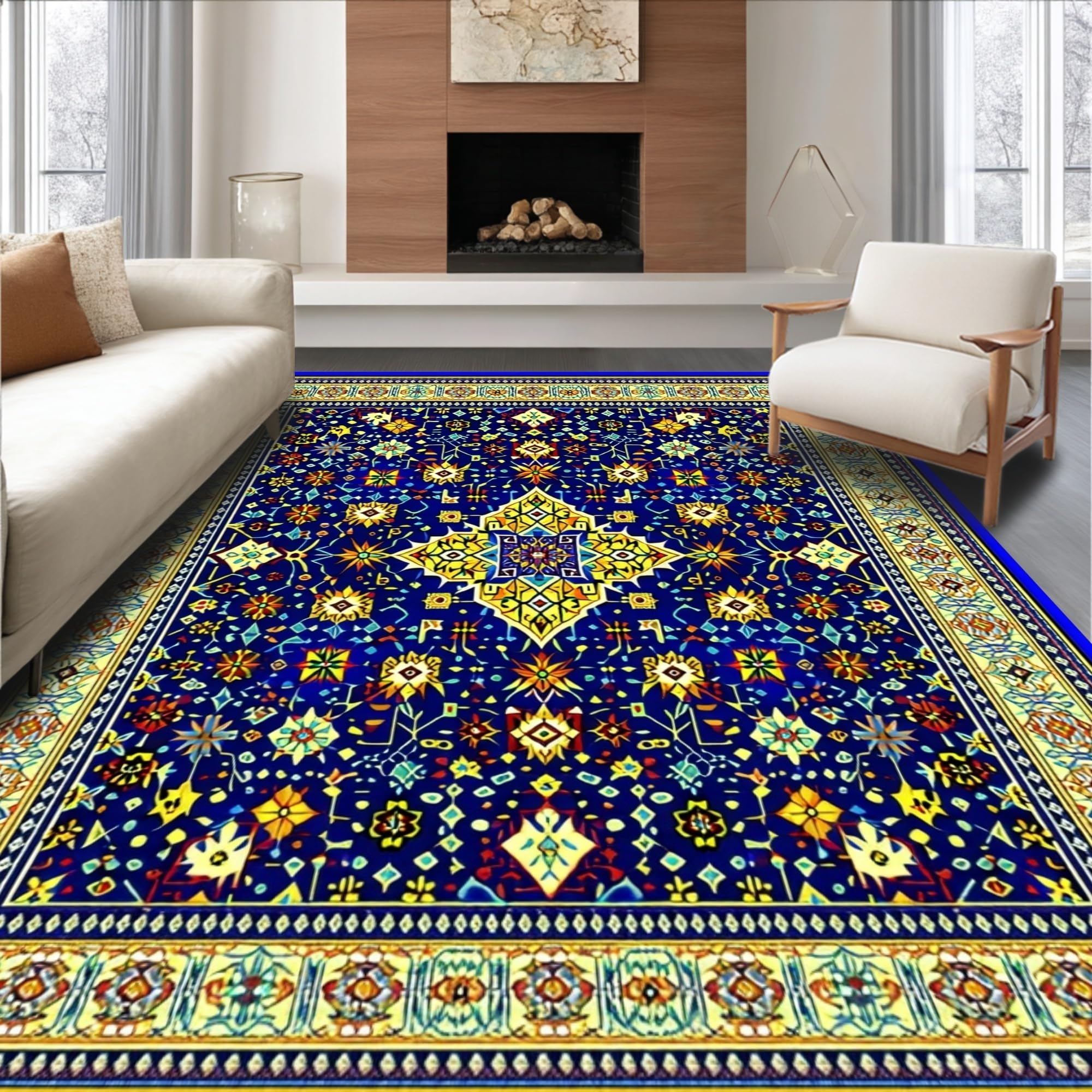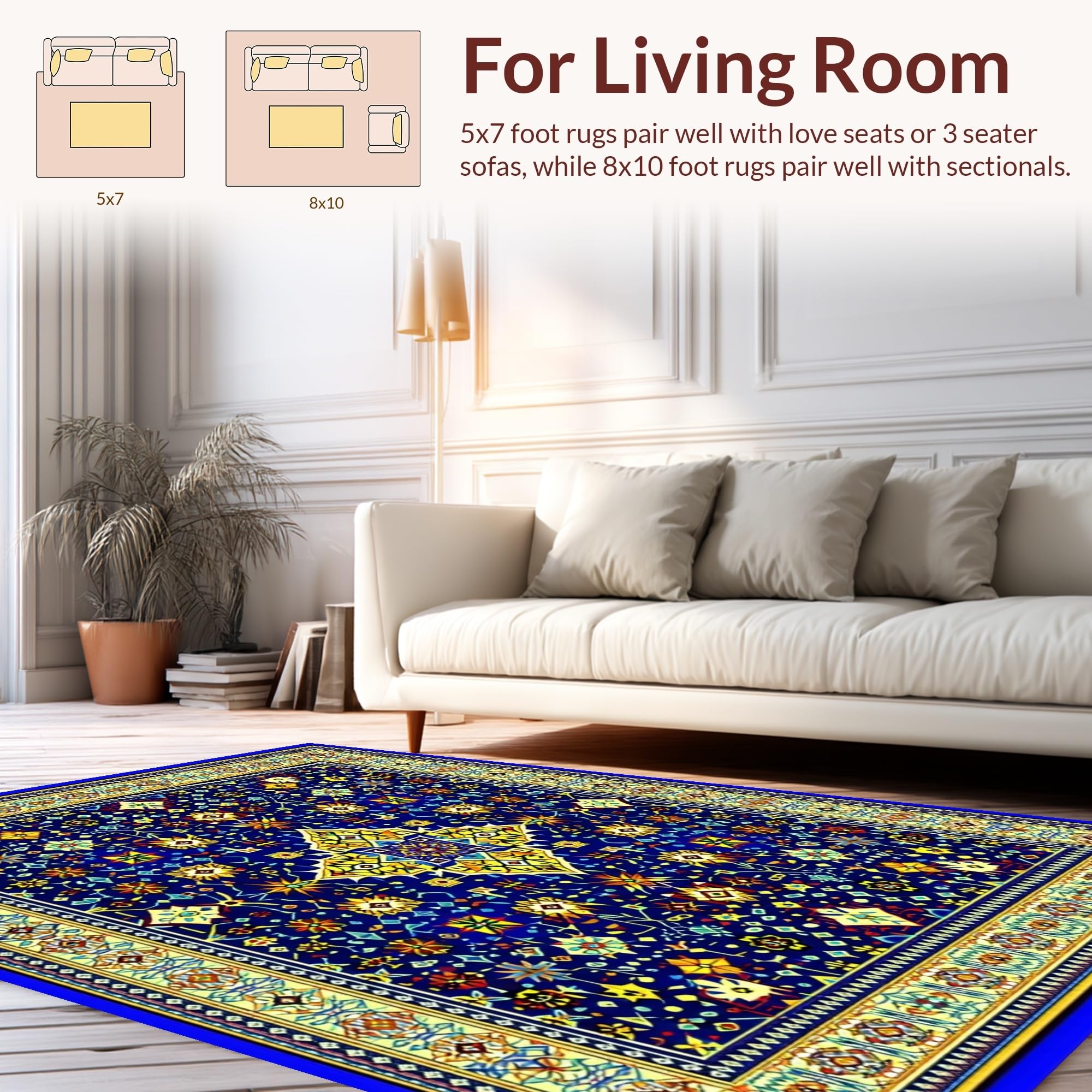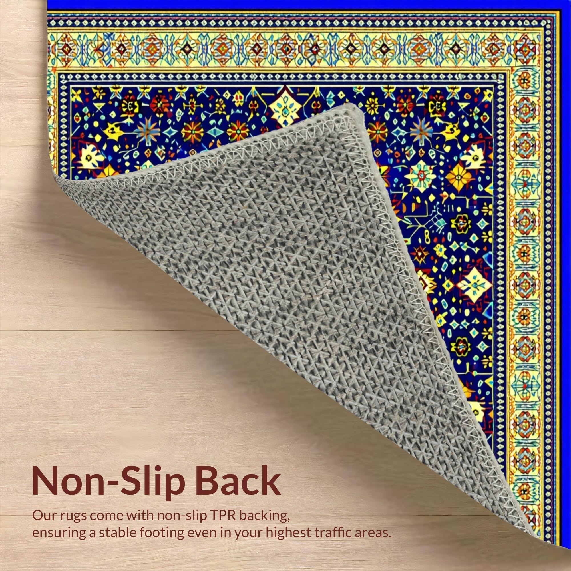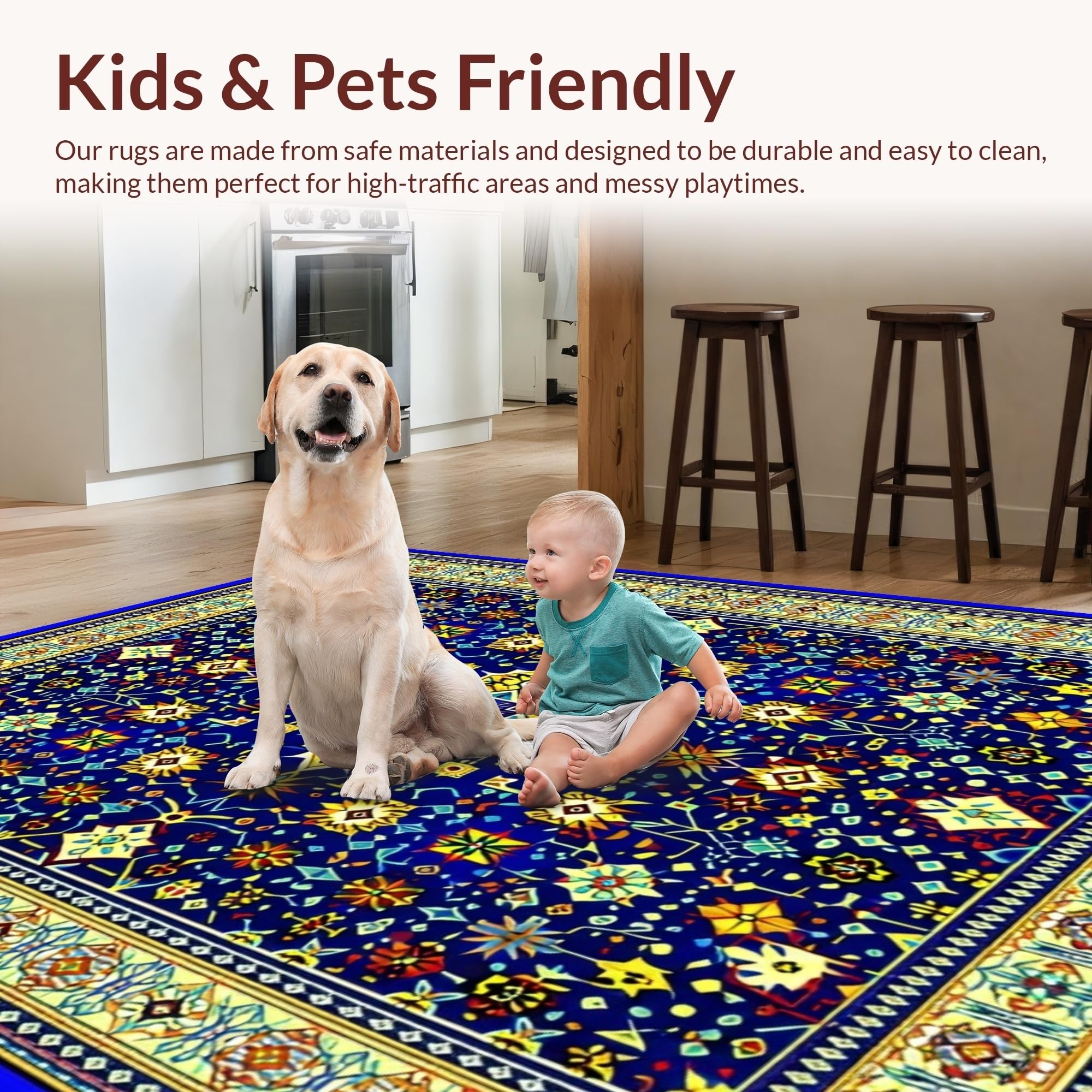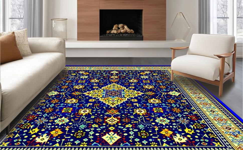 Ultra Soft Area Rug, Non Slip, Stain Resistant, Washable Area Rugs for Living Room, Bedroom, Elegant Gold Linear Patterns(Blue) Overview: