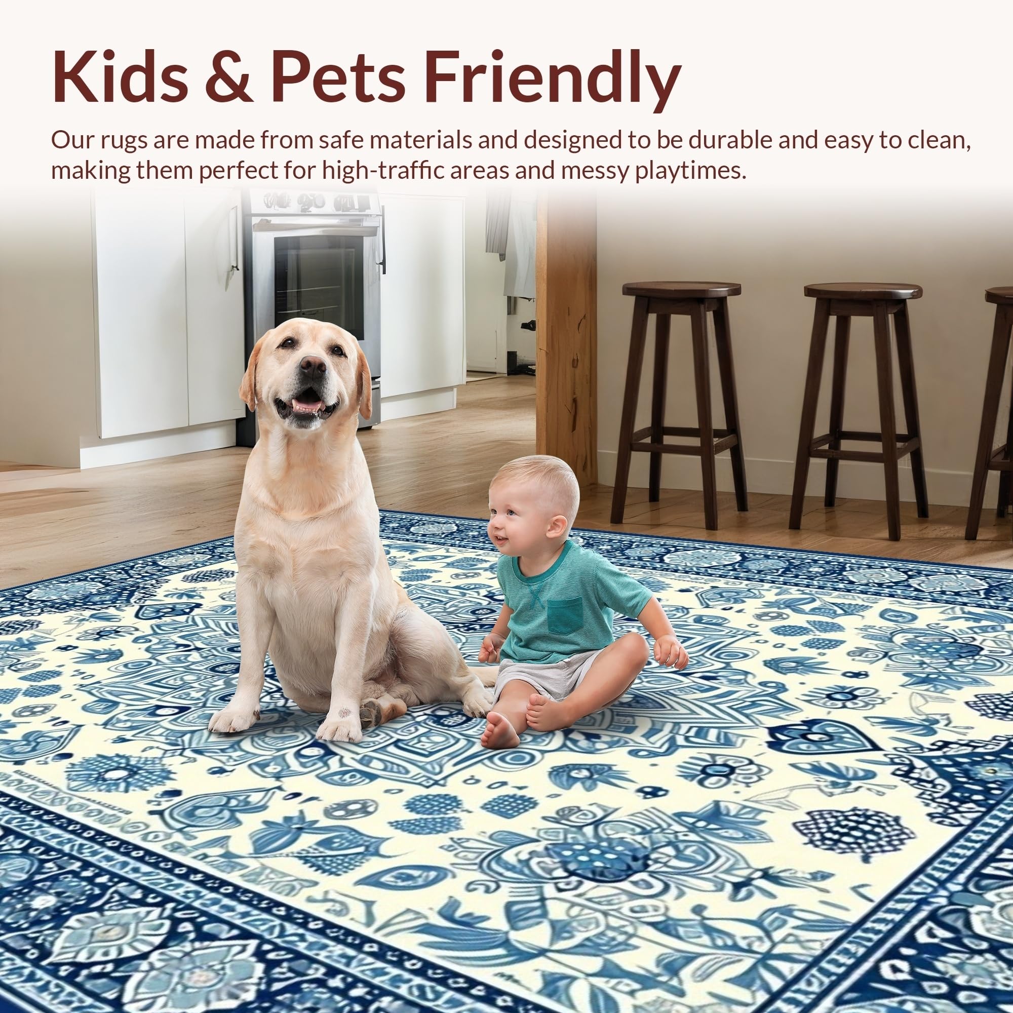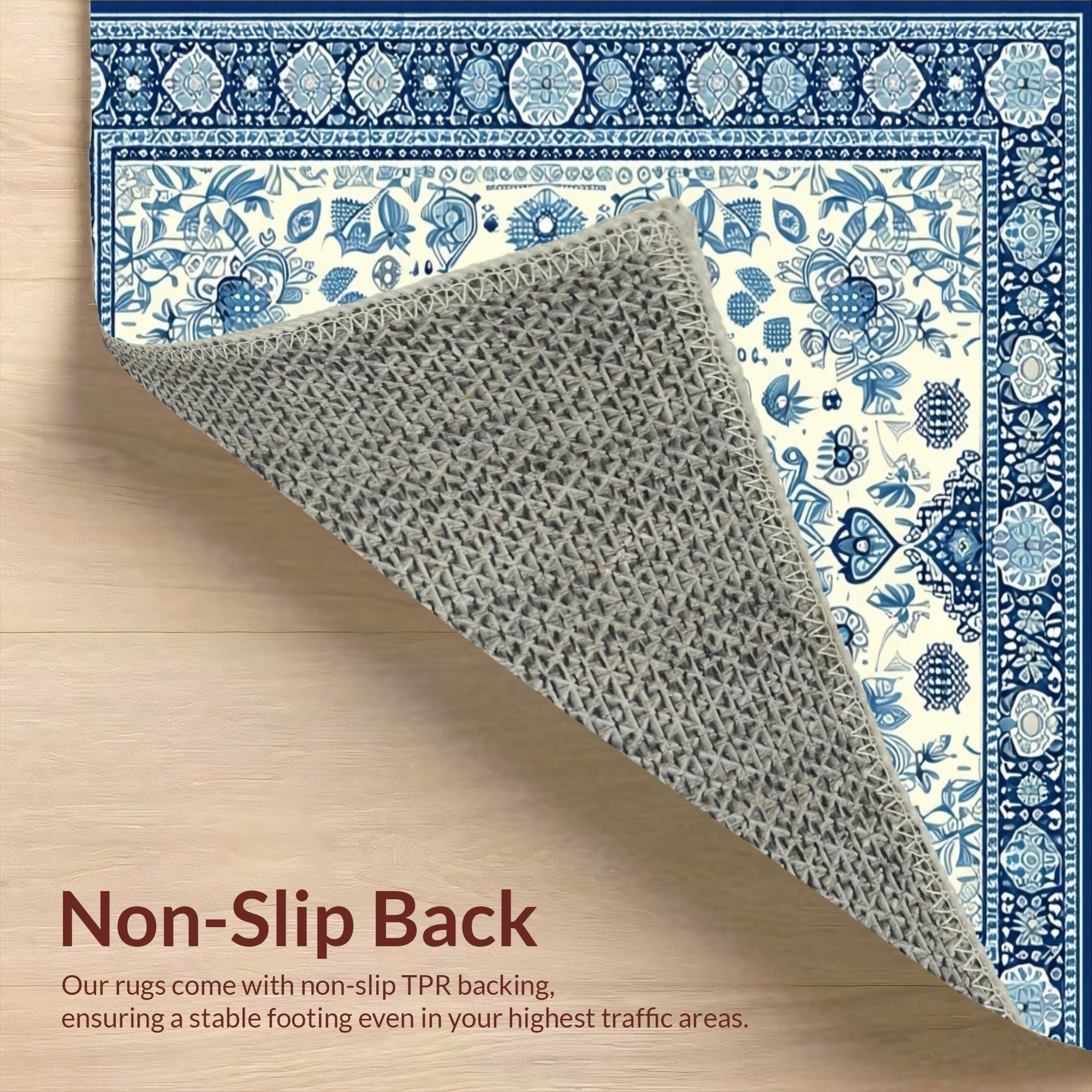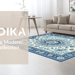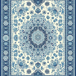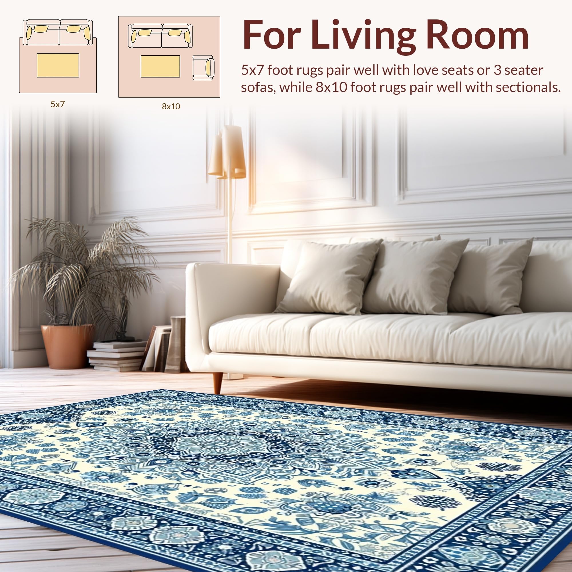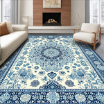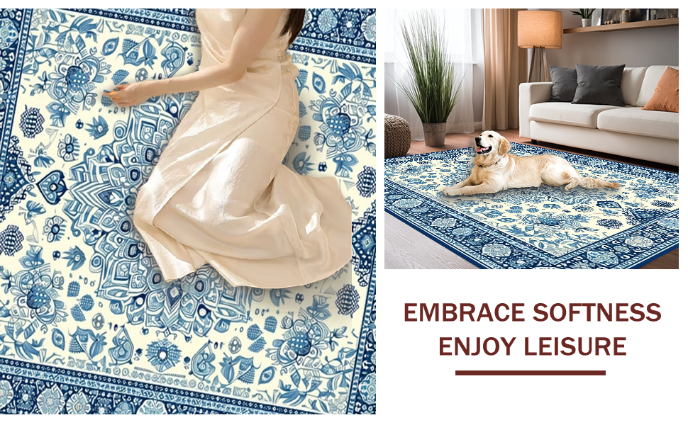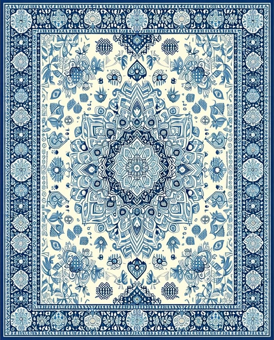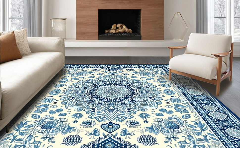 Ultra Soft Area Rug, Non Slip, Stain Resistant, Washable Area Rugs for Living Room, Bedroom, Elegant Ivory and Blue Motif(Beige) Overview: