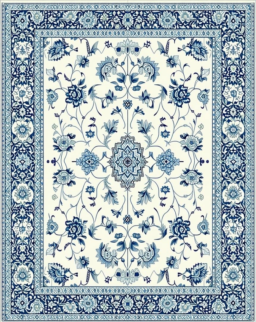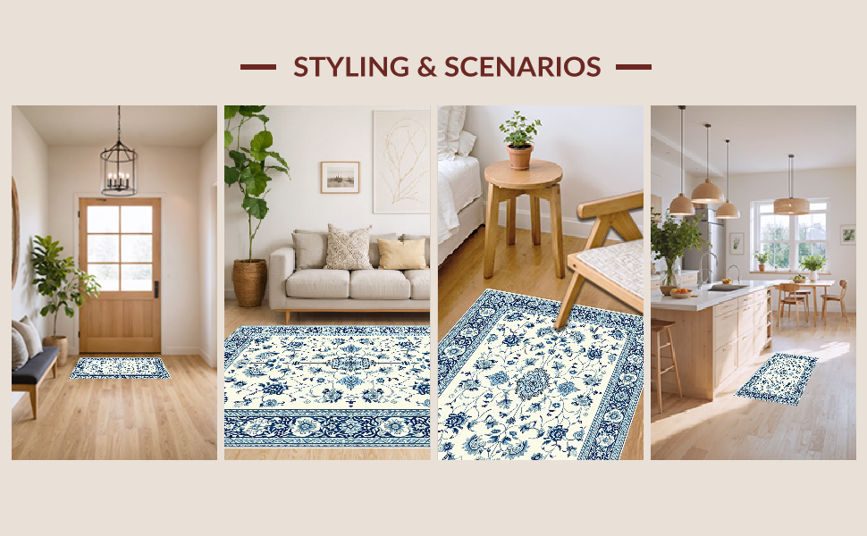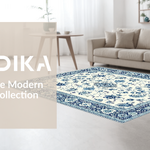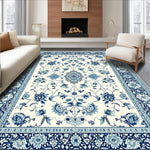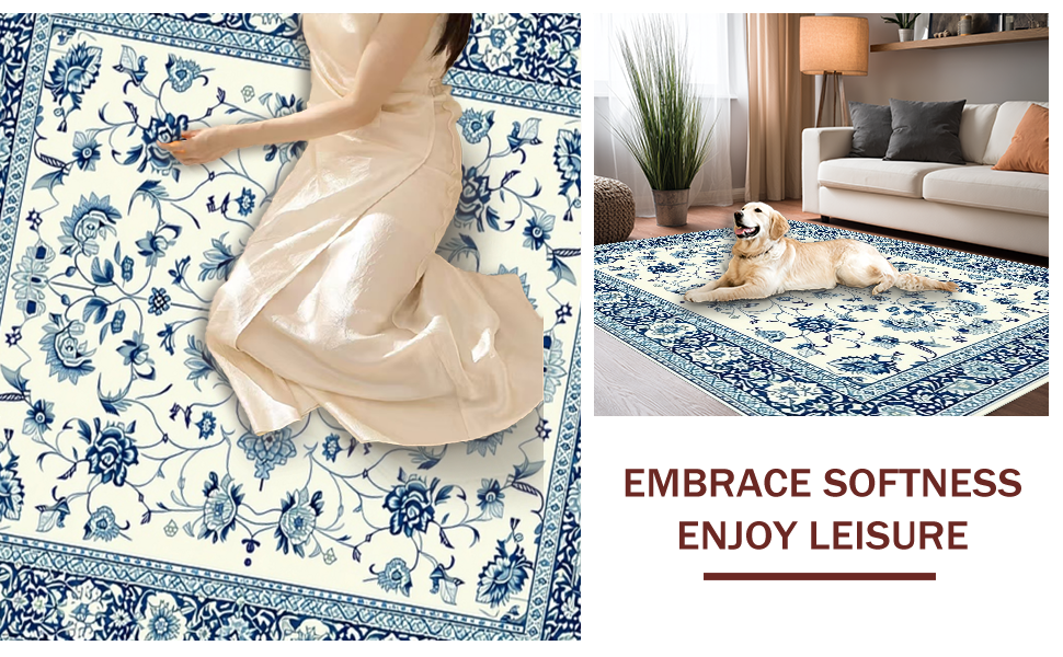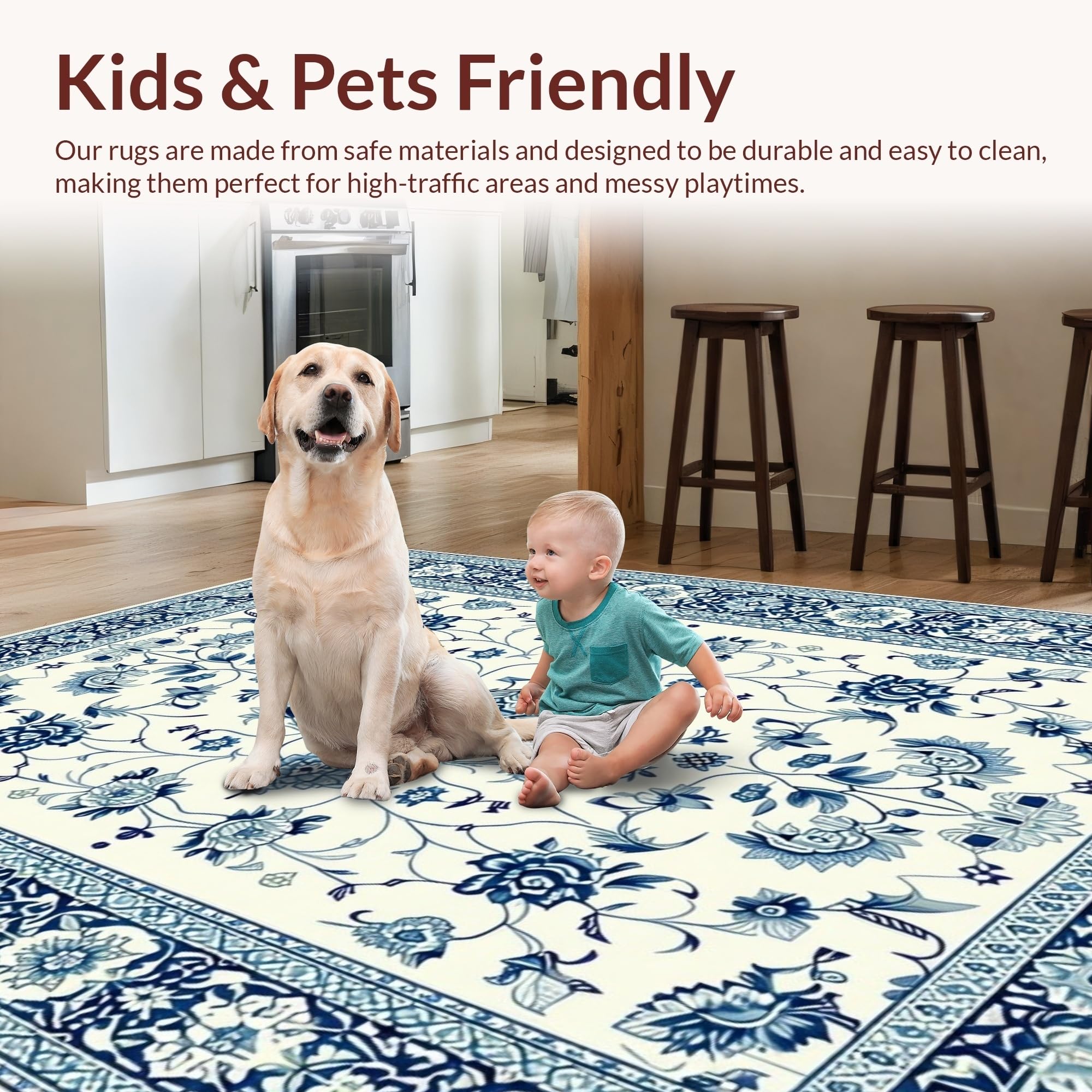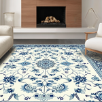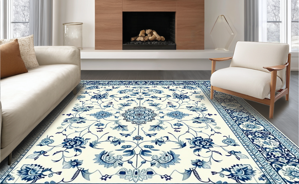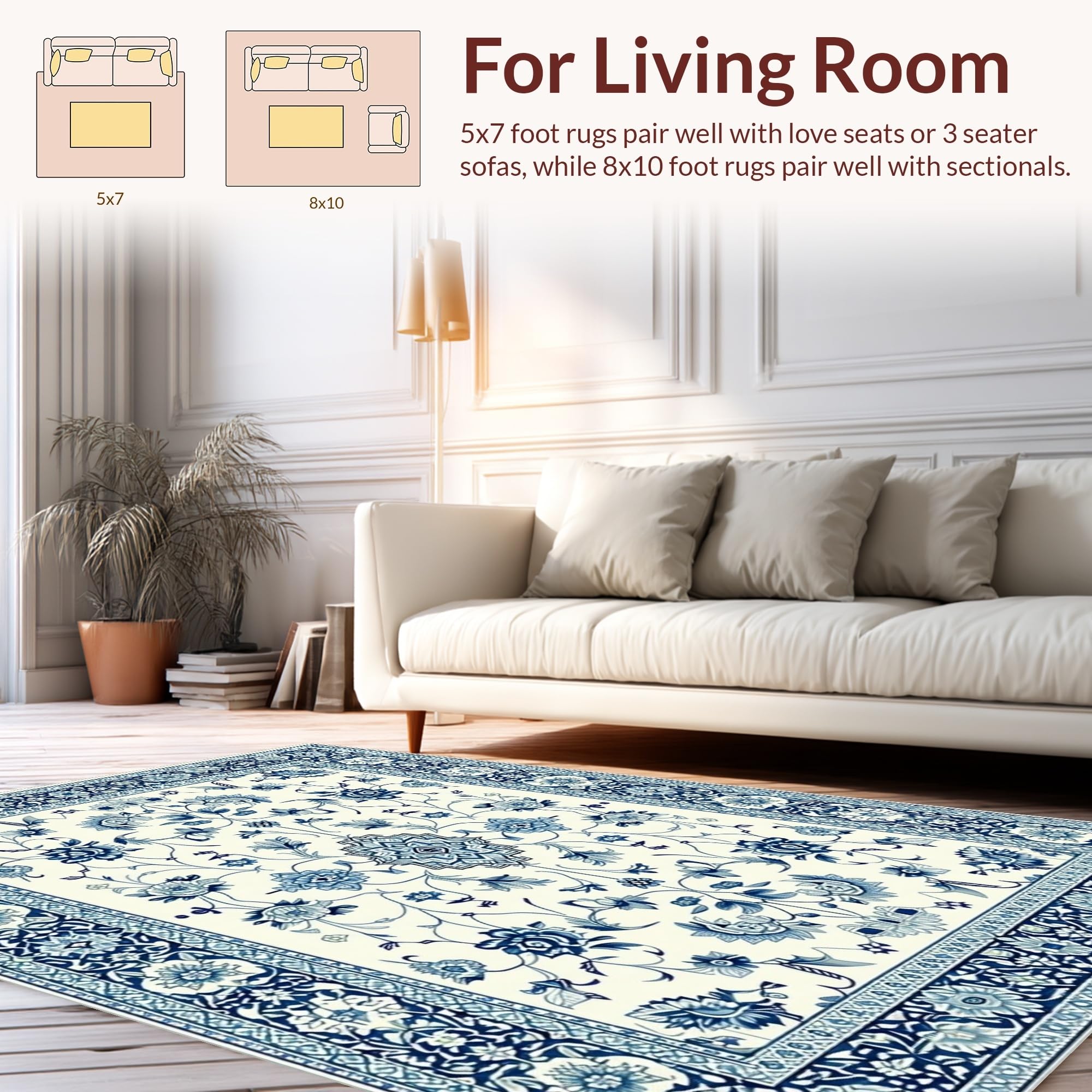 Ultra Soft Area Rug, Non Slip, Stain Resistant, Washable Area Rugs for Living Room, Bedroom, Elegant Ivory Blue Botanical Motif(Beige) Overview: