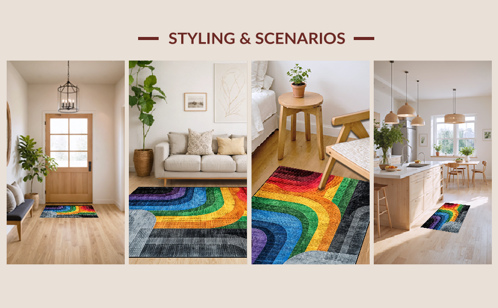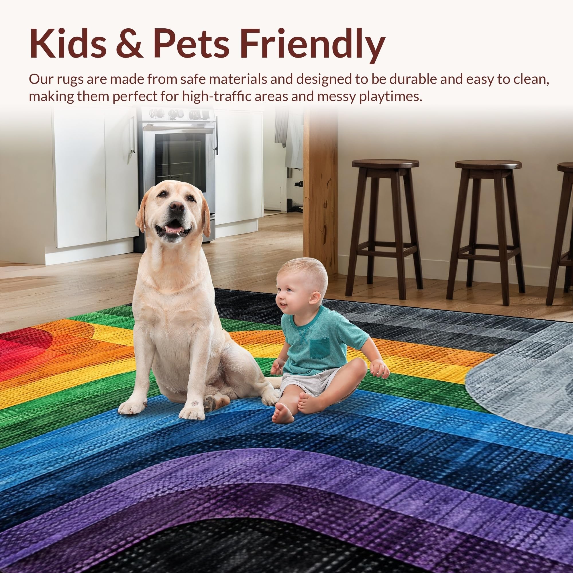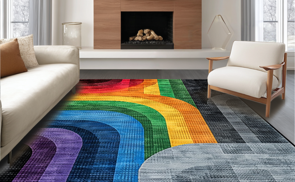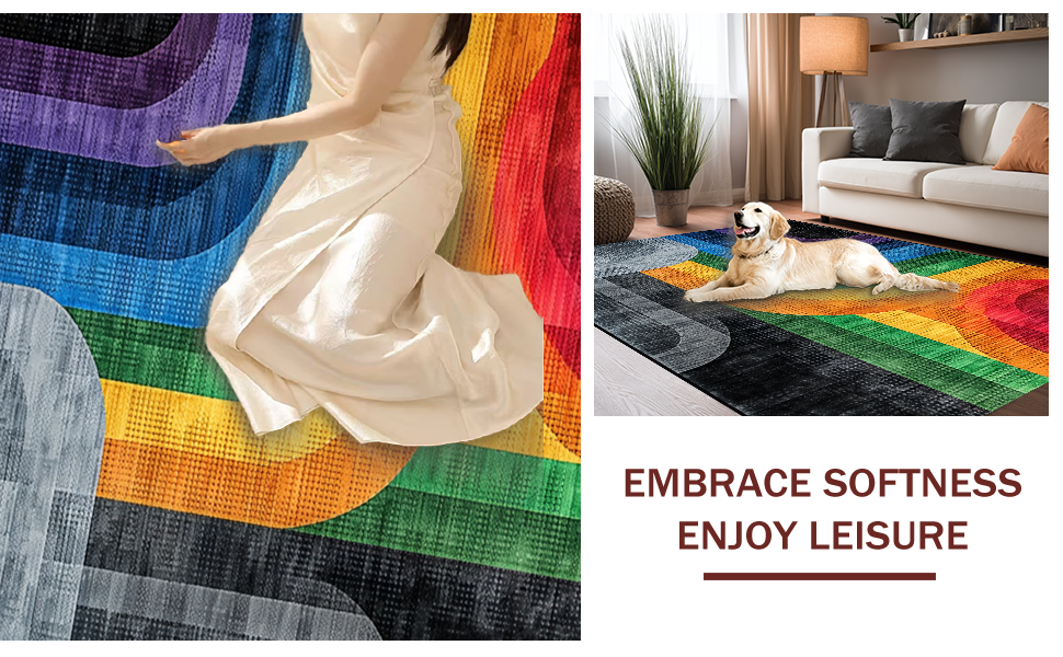 Ultra Soft Area Rug, Non Slip, Stain Resistant, Washable Area Rugs for Living Room, Bedroom, Elegant Linear Rainbow Pattern(Red) Overview: