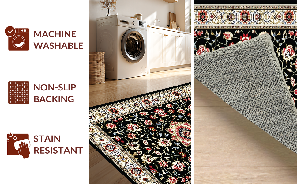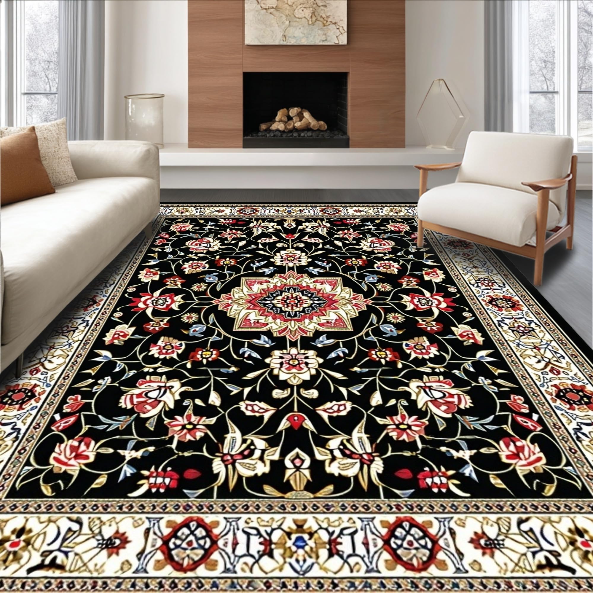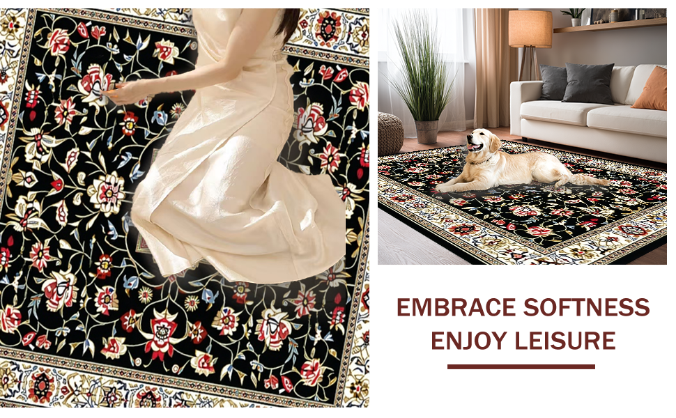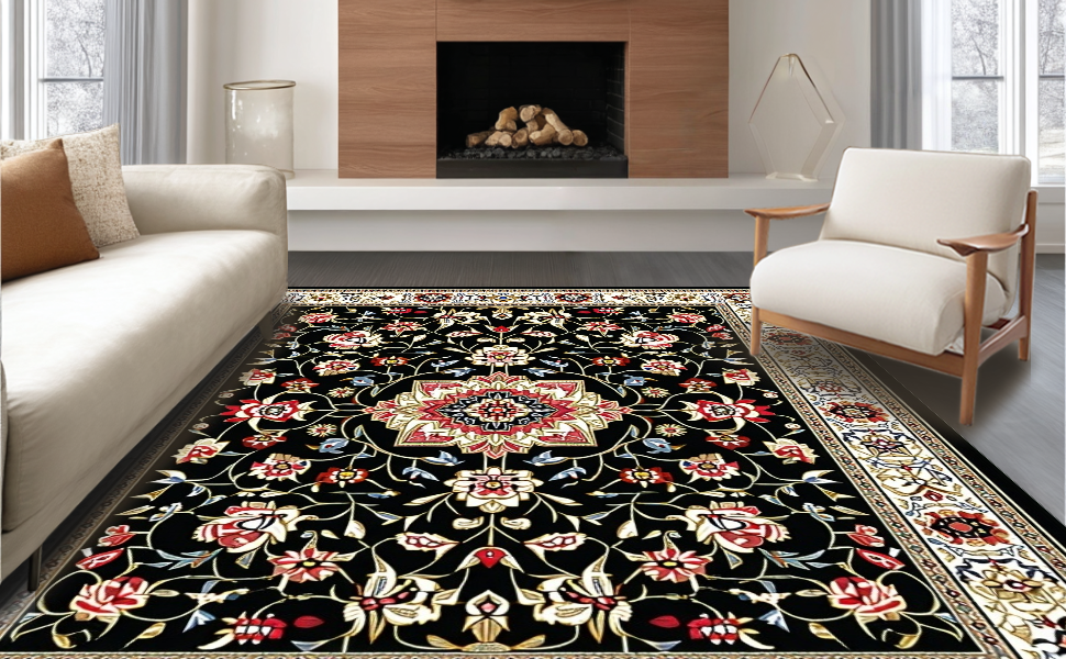 Ultra Soft Area Rug, Non Slip, Stain Resistant, Washable Area Rugs for Living Room, Bedroom, Elegant Monochrome Floral Motif(Black) Overview: