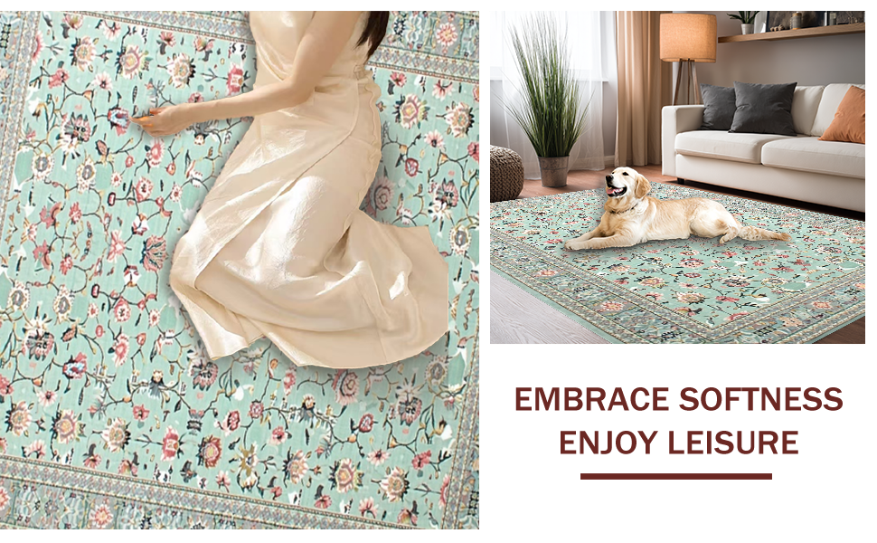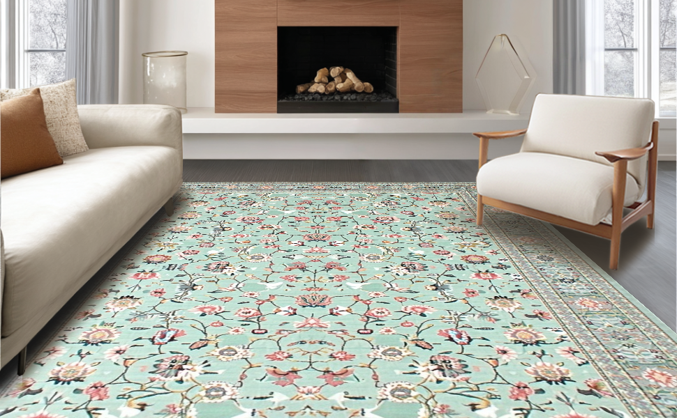 Ultra Soft Area Rug, Non Slip, Stain Resistant, Washable Area Rugs for Living Room, Bedroom, Elegant Sage Green Tiled Motif(Blue) Overview: