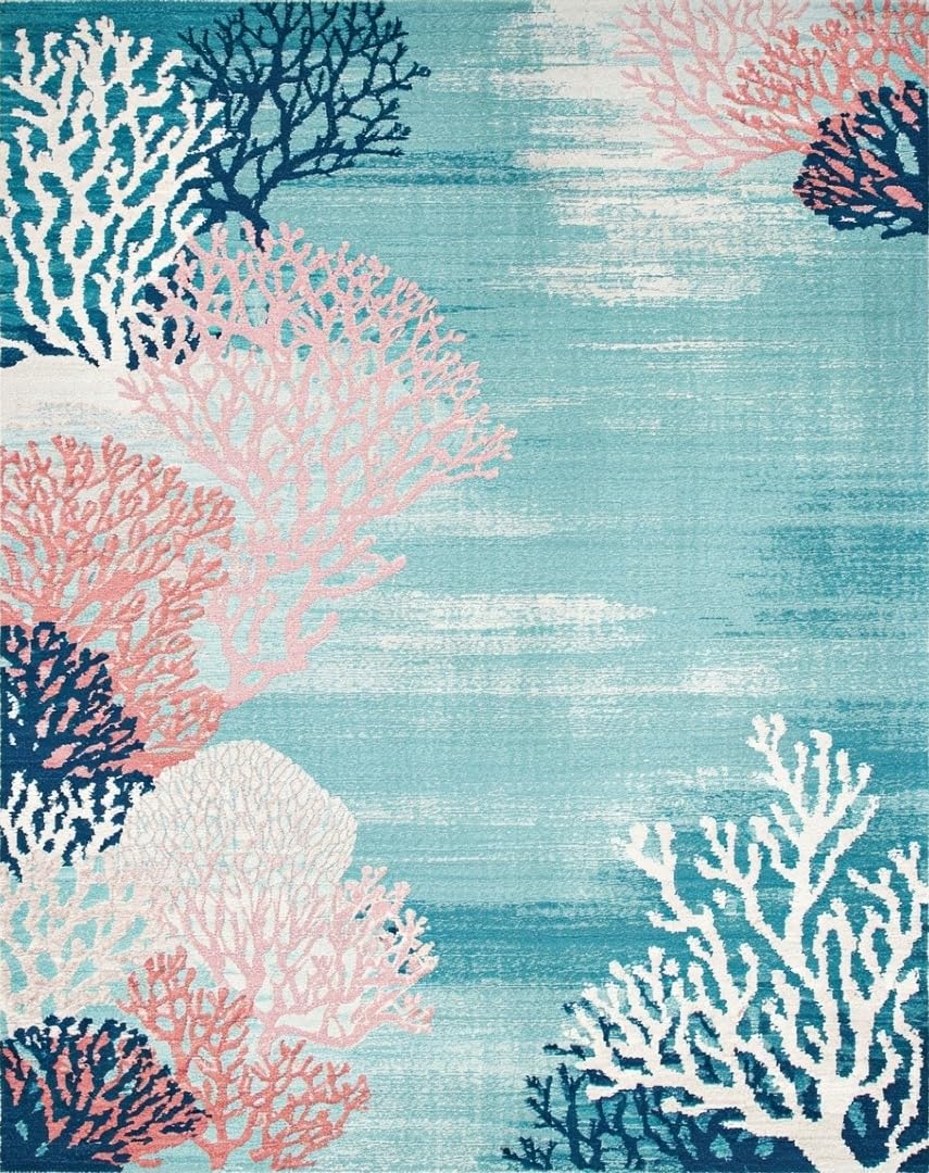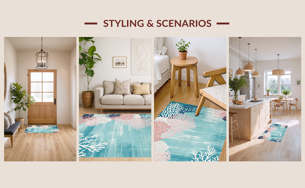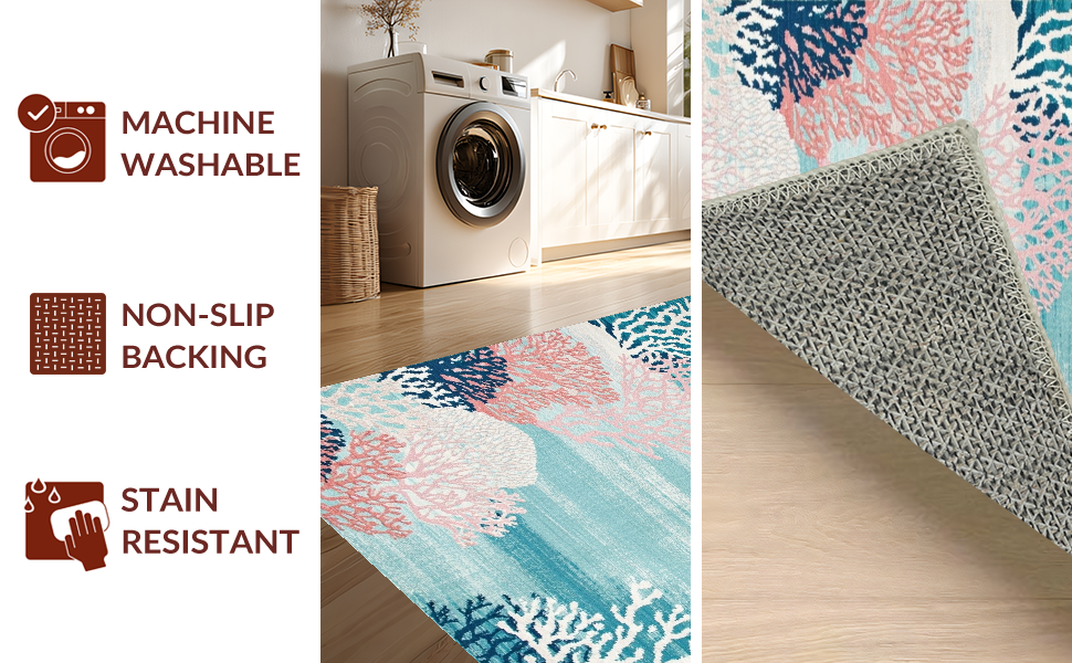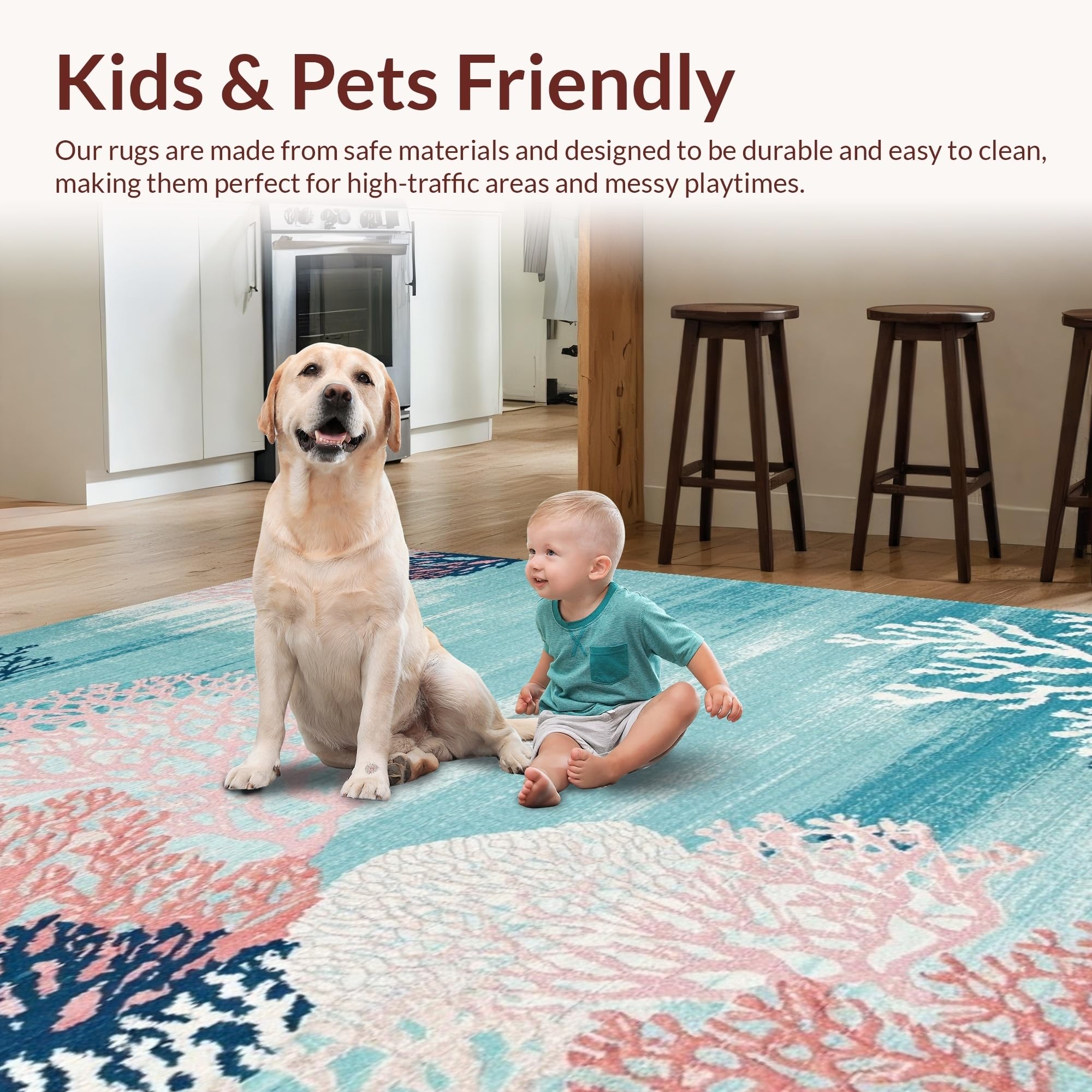Ultra Soft Area Rug, Non Slip, Stain Resistant, Washable Area Rugs for Living Room, Bedroom, Elegant Tiled Coral Aesthetic(Blue) Overview: