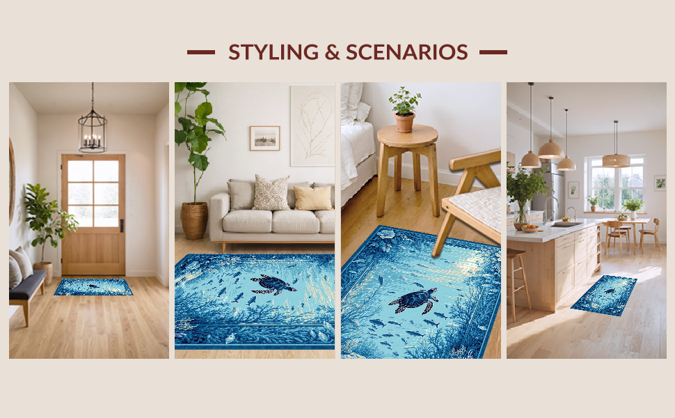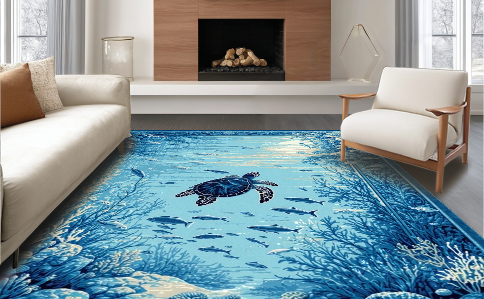 Ultra Soft Area Rug, Non Slip, Stain Resistant, Washable Area Rugs for Living Room, Bedroom, Elegant Turtle-themed Decorative Accent(Blue) Overview: