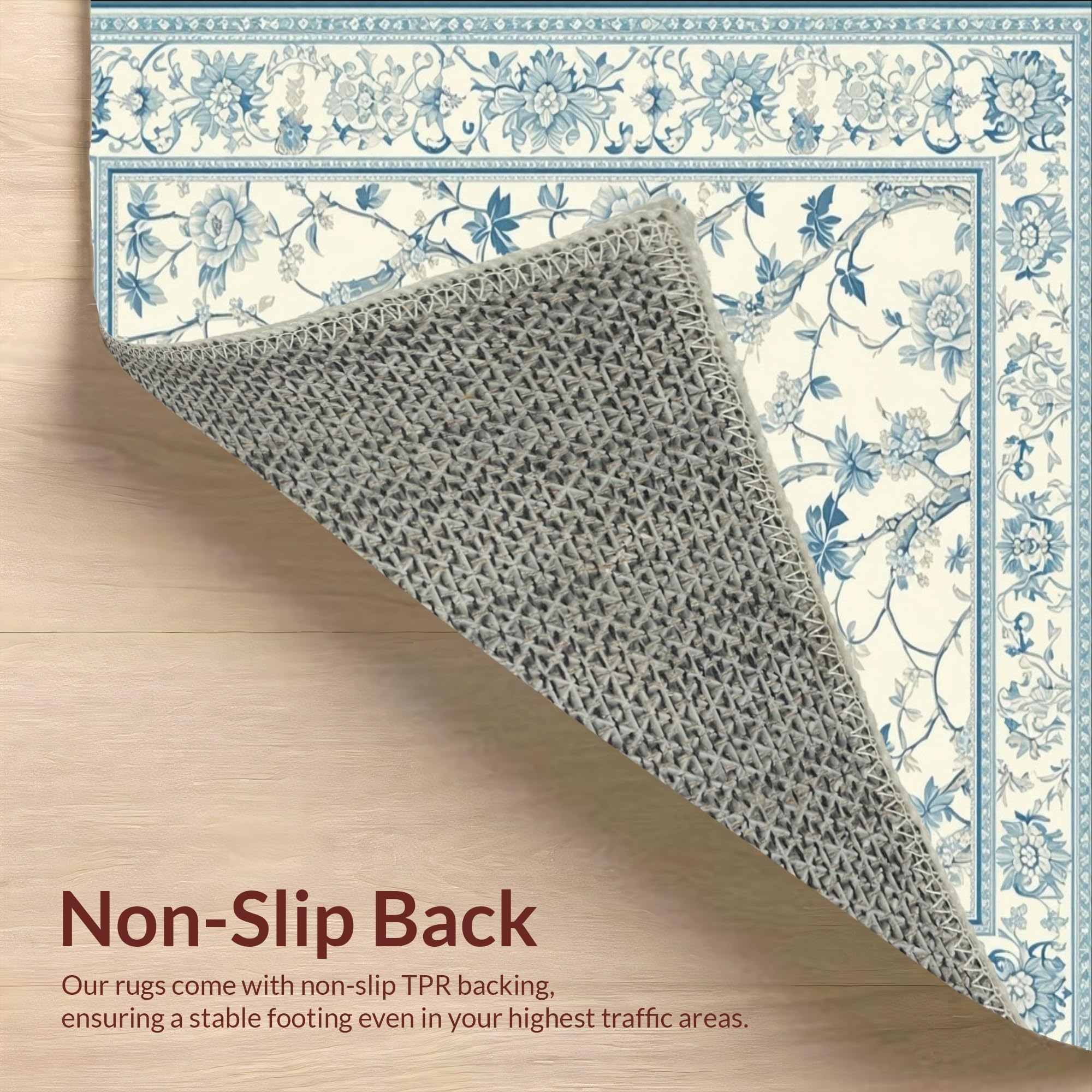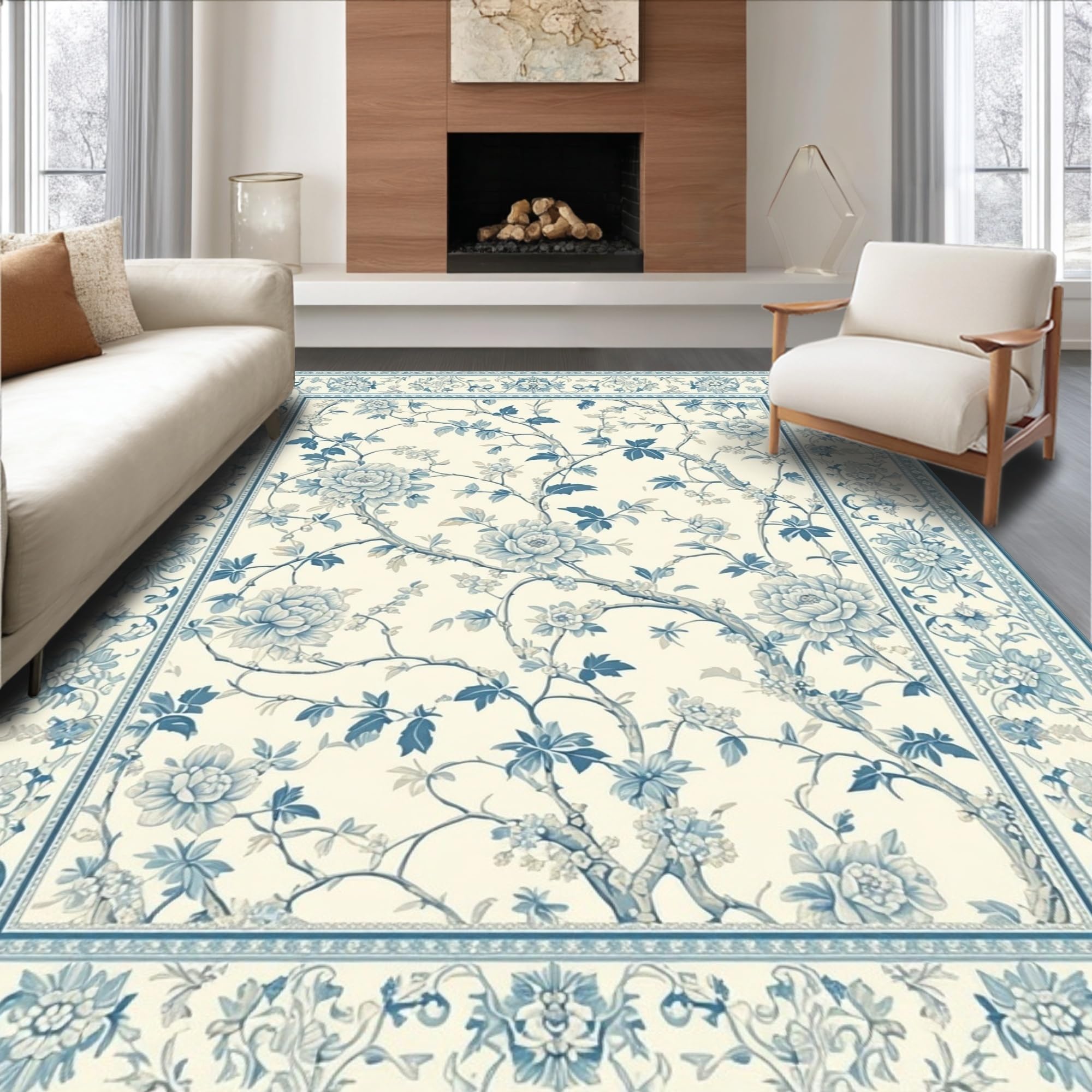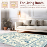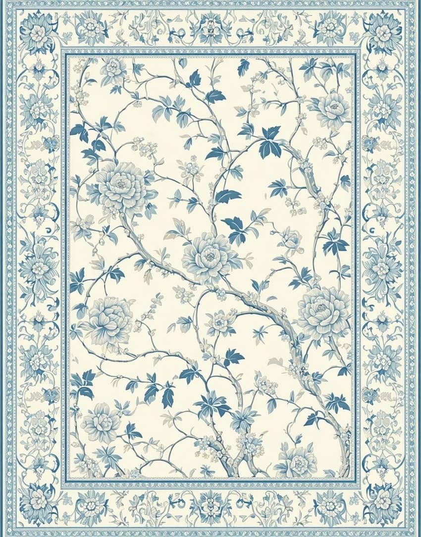 Ultra Soft Area Rug, Non Slip, Stain Resistant, Washable Area Rugs for Living Room, Bedroom, Elegant Vintage Botanical with Beige Background and Light Blue Floral(Beige) Overview: