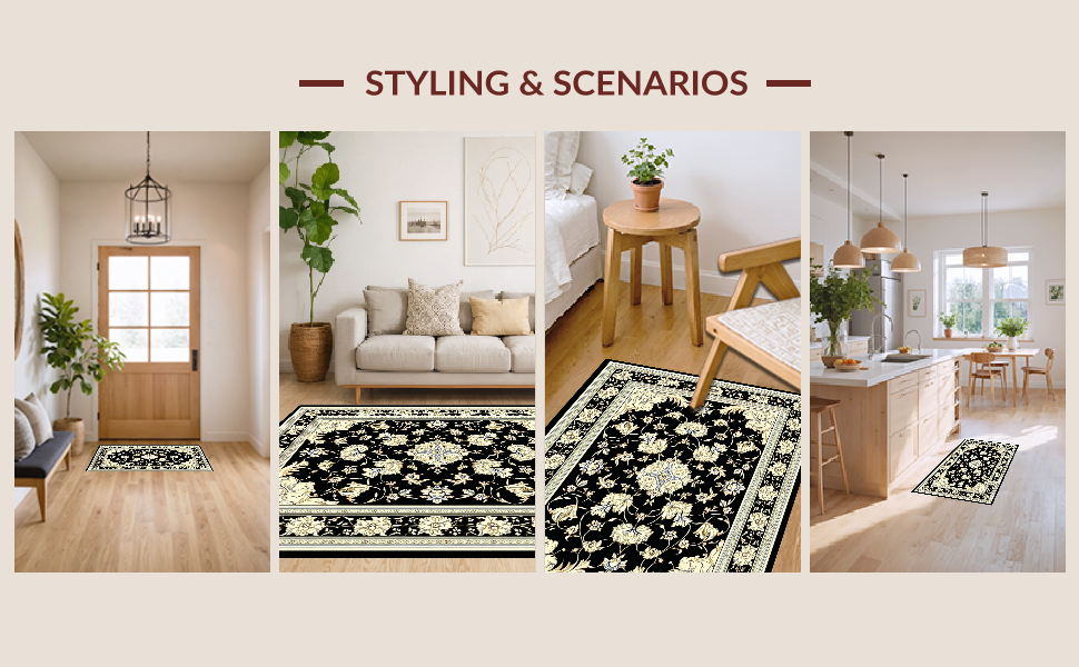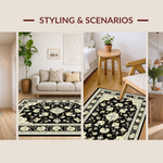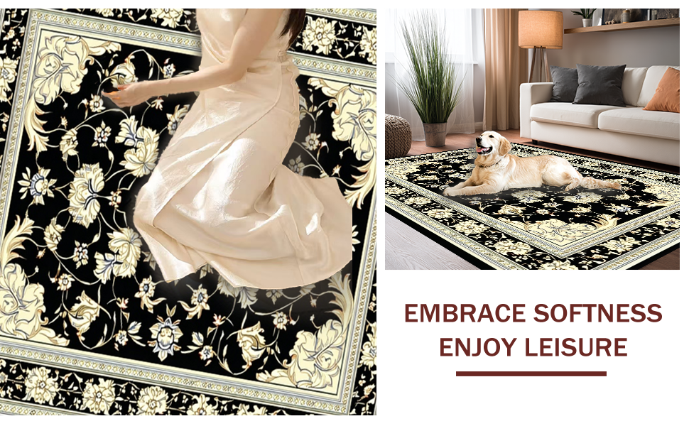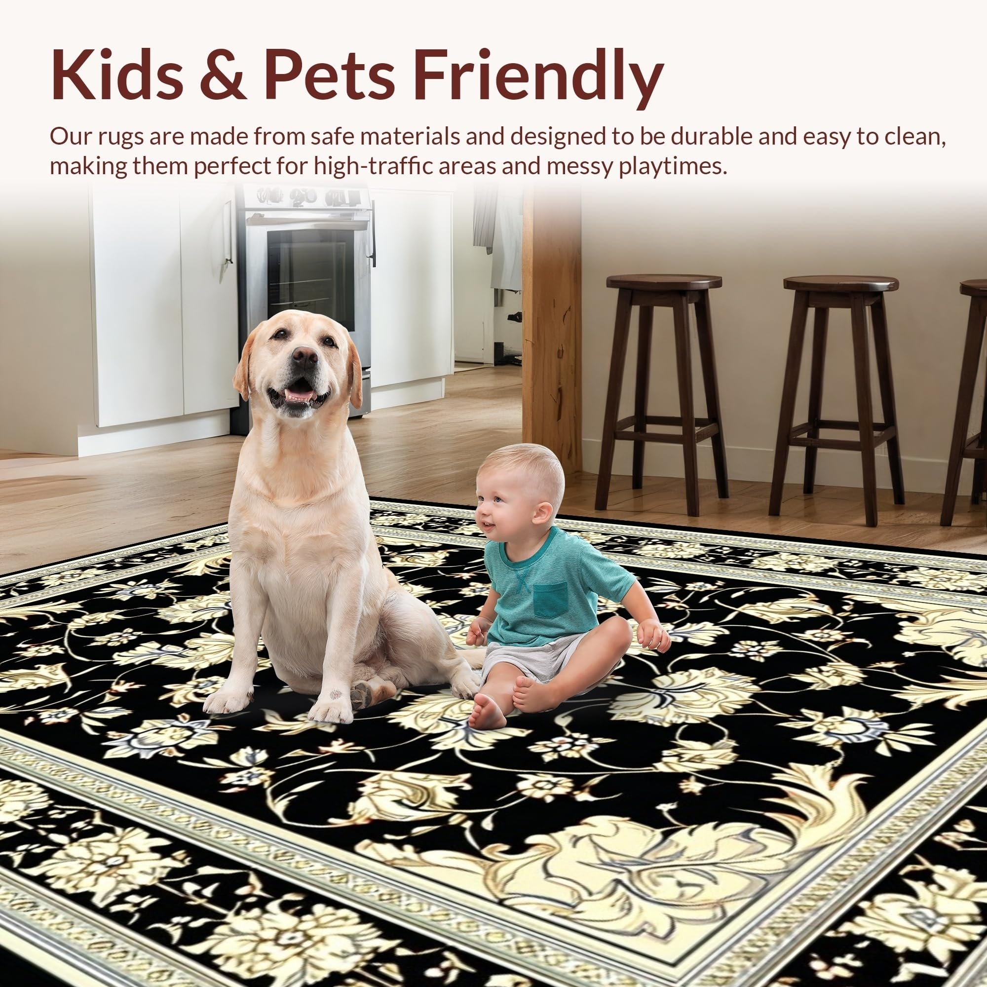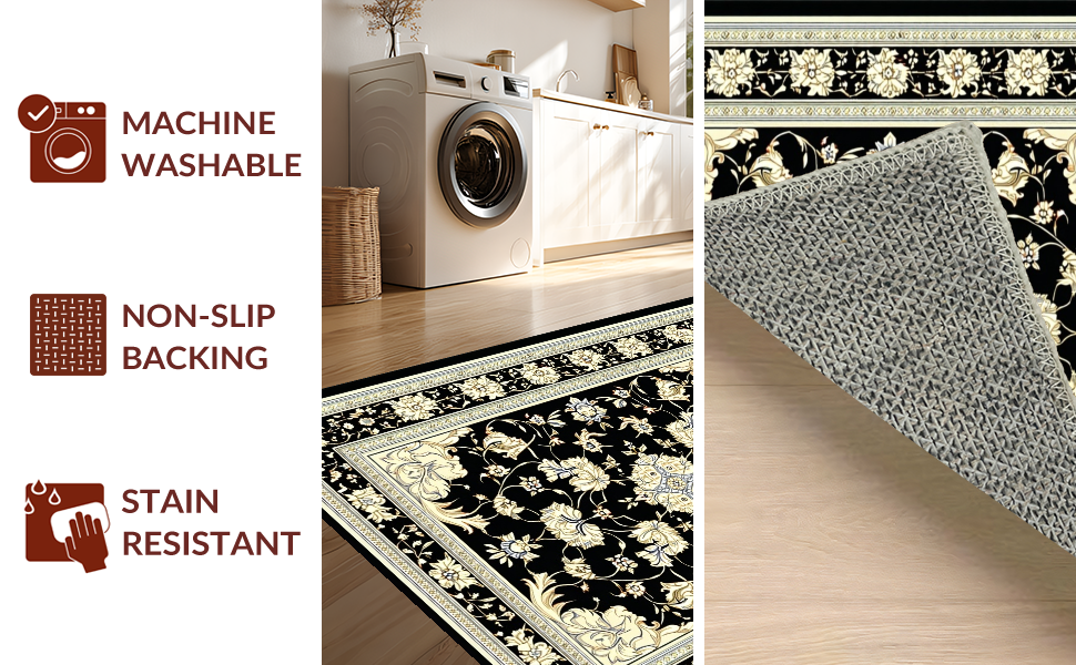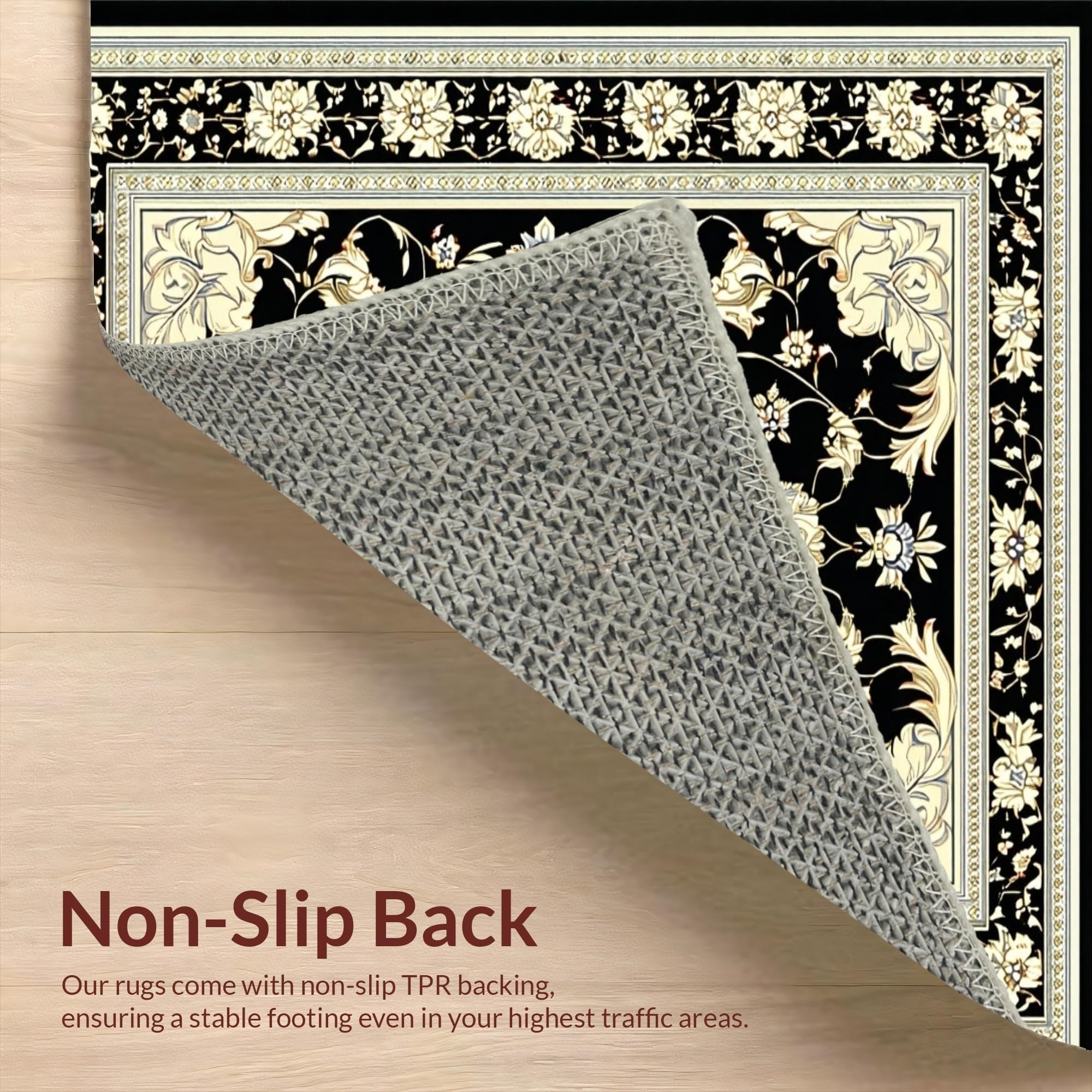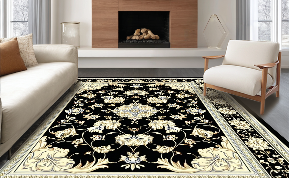 Ultra Soft Area Rug, Non Slip, Stain Resistant, Washable Area Rugs for Living Room, Bedroom, Elegant Vintage Damask Design(Black) Overview: