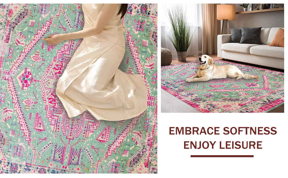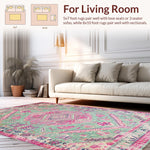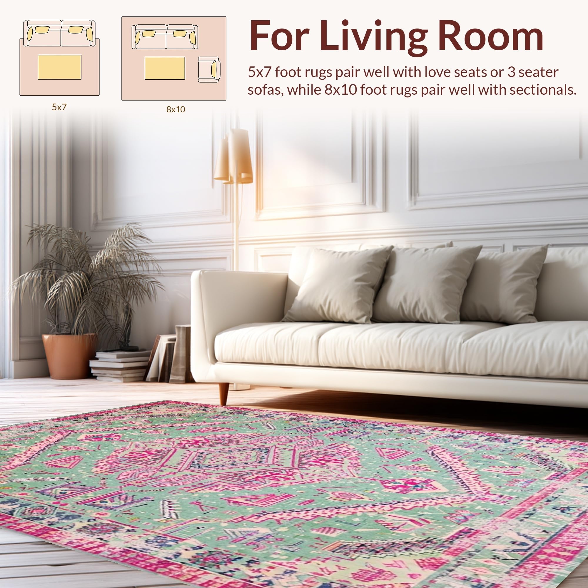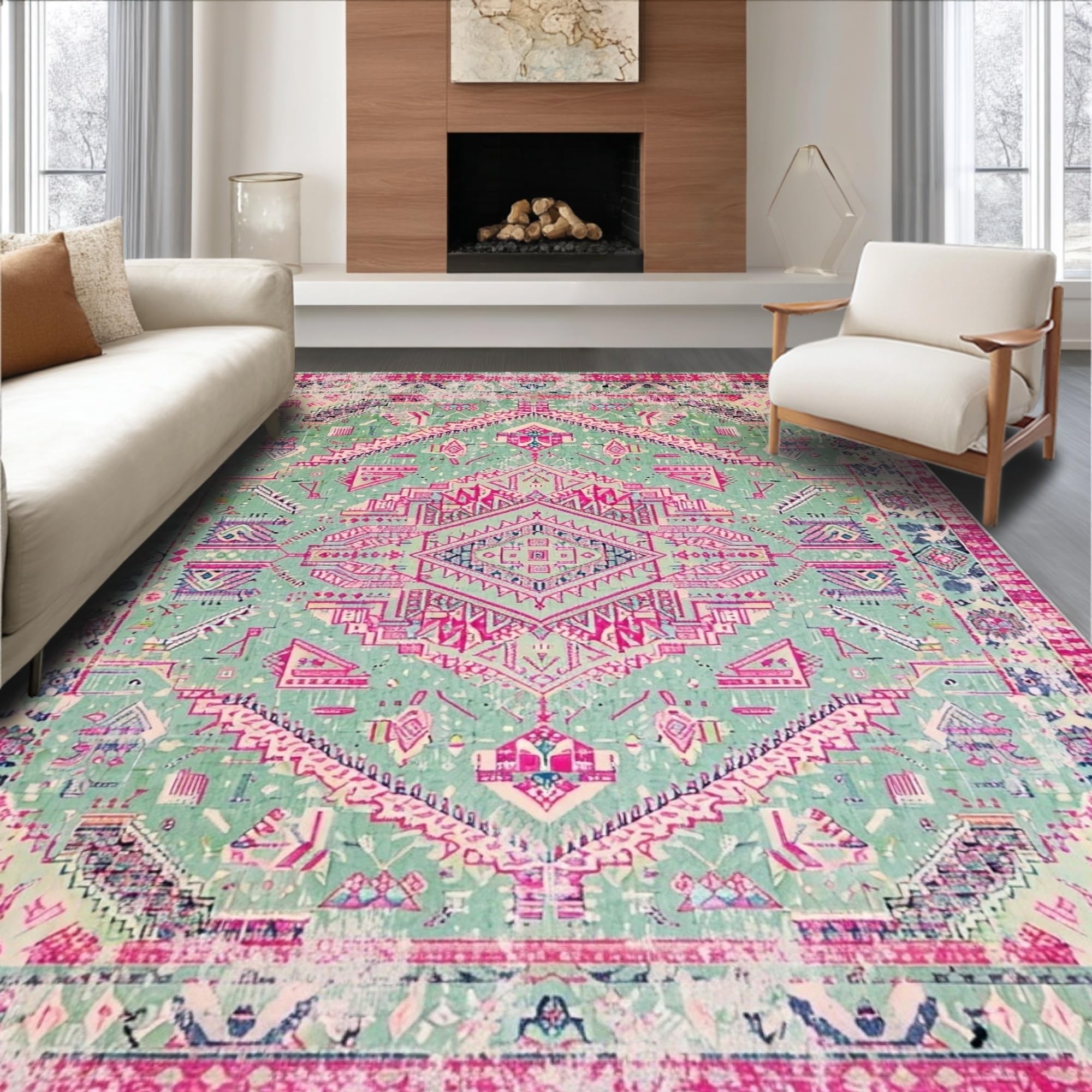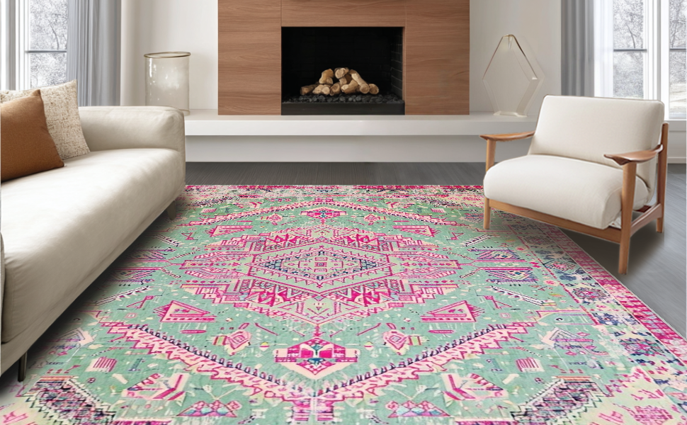 Ultra Soft Area Rug, Non Slip, Stain Resistant, Washable Area Rugs for Living Room, Bedroom, Elegant Vintage Geometric Motif Fusion(Green) Overview: