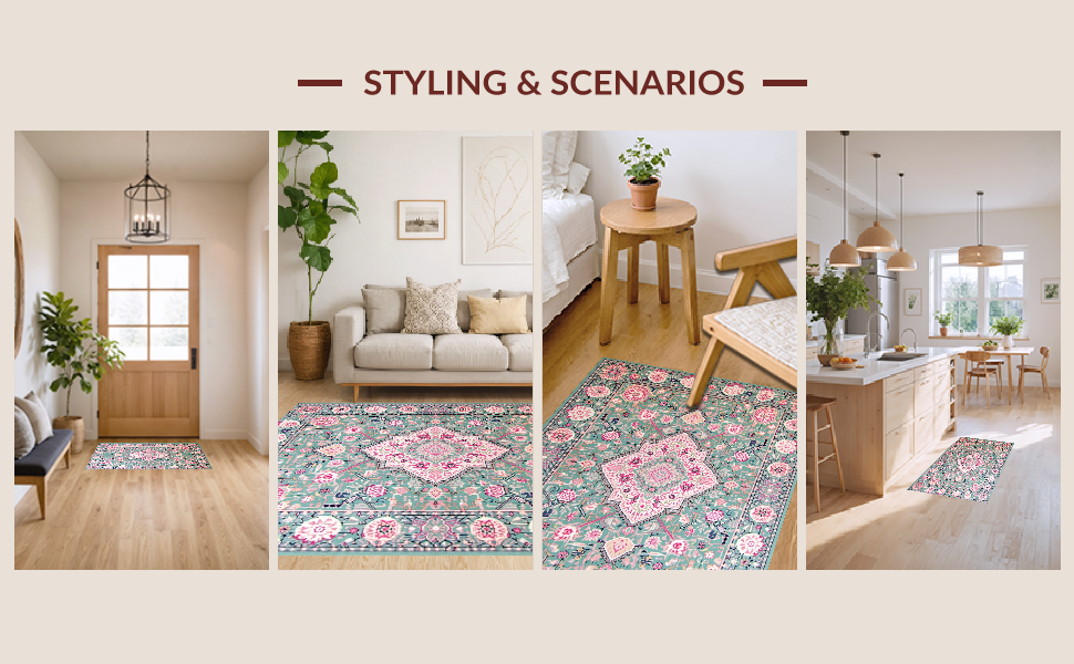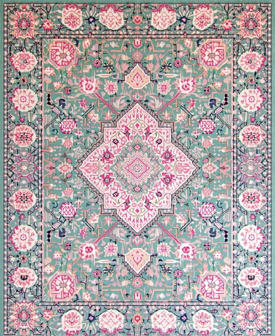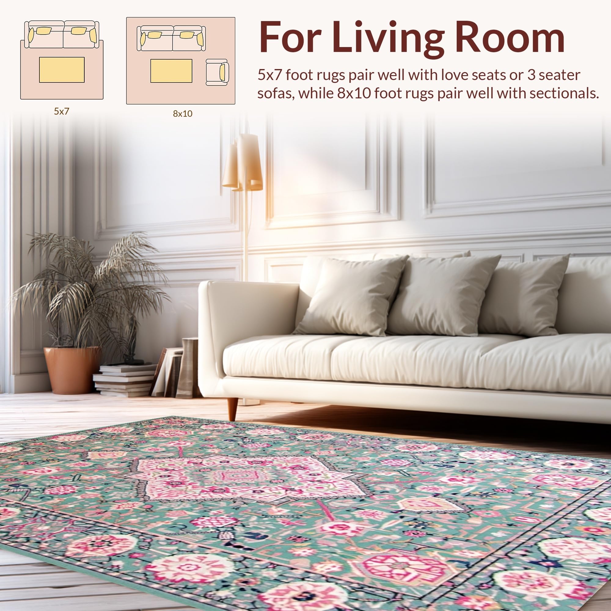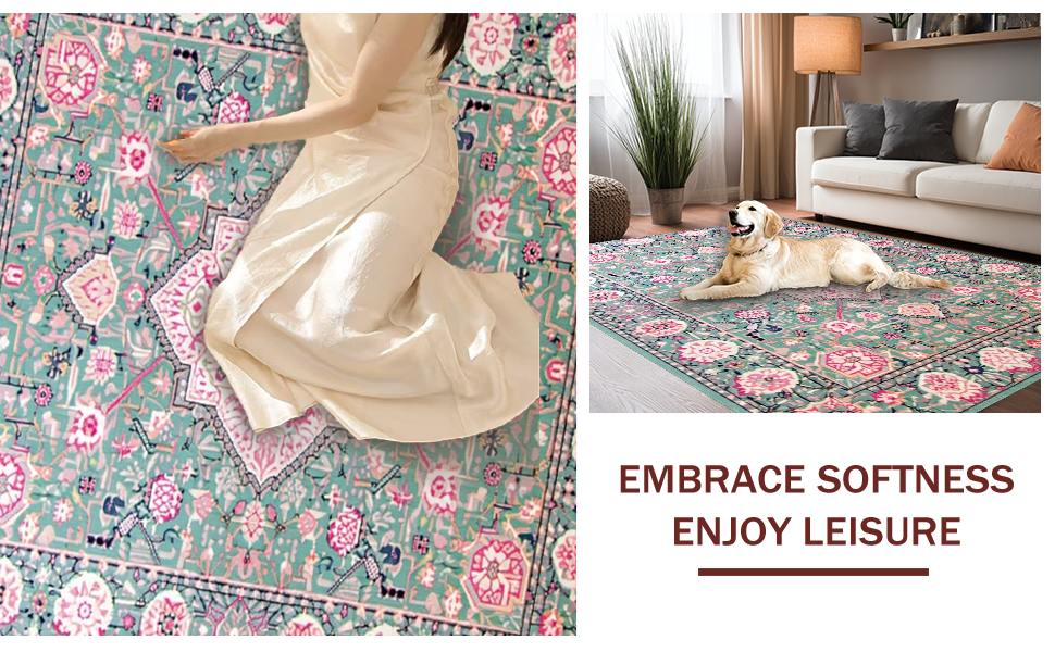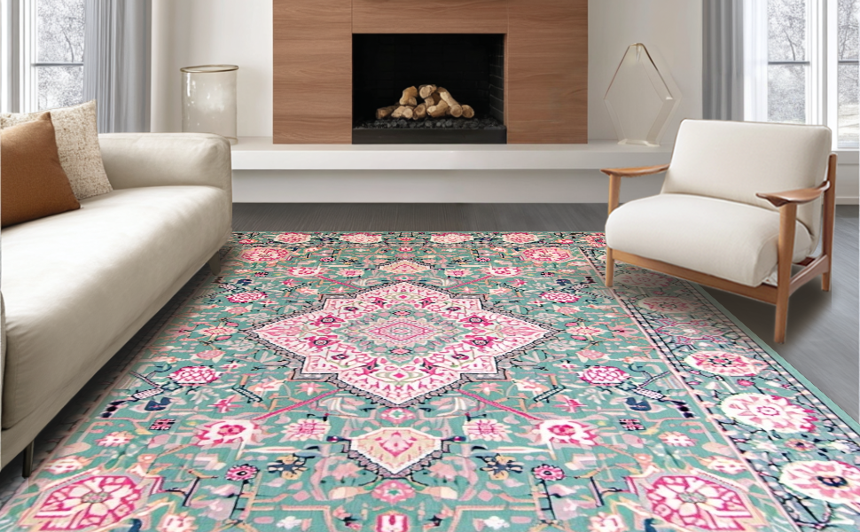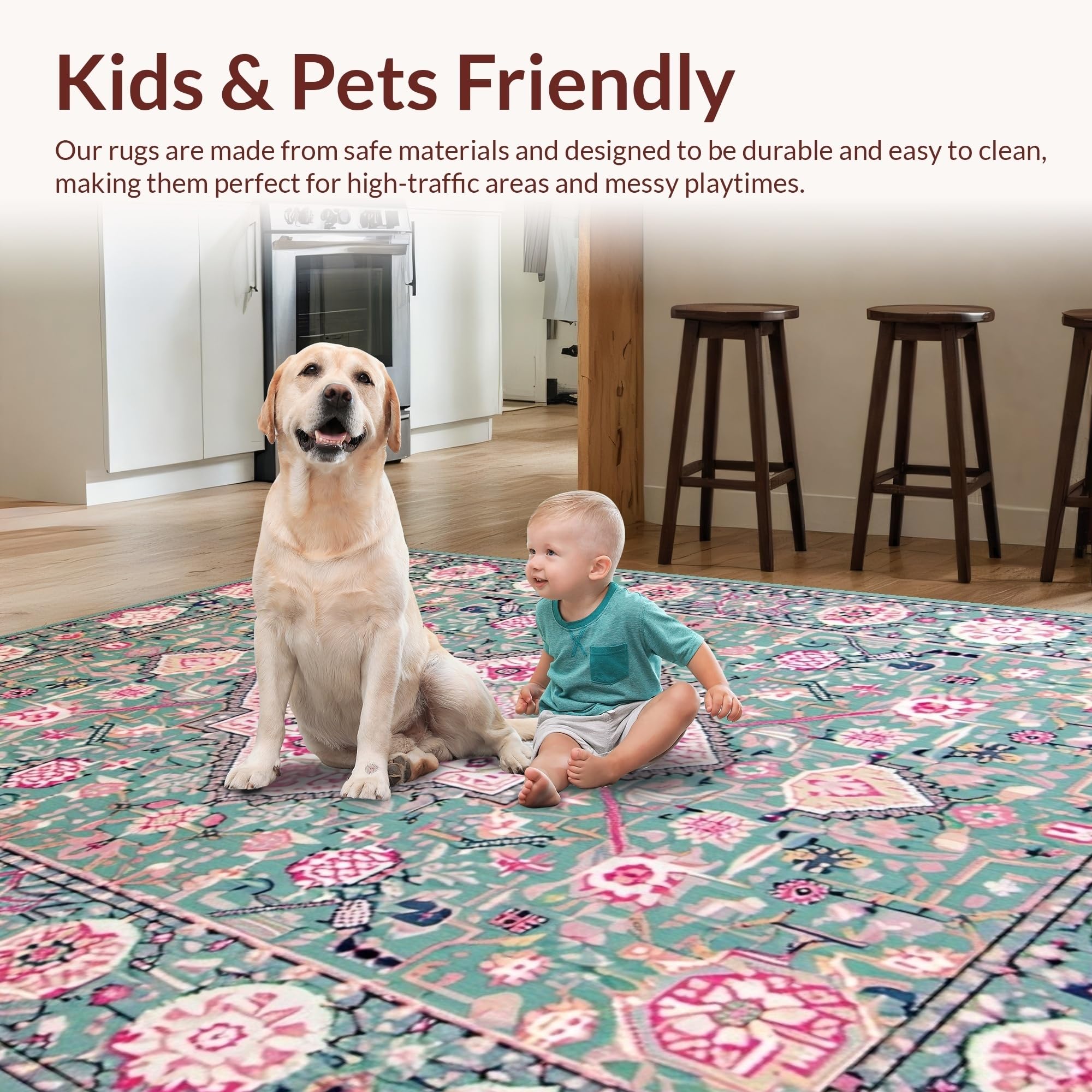 Ultra Soft Area Rug, Non Slip, Stain Resistant, Washable Area Rugs for Living Room, Bedroom, Elegant Vintage Tiled Motif(Green) Overview: