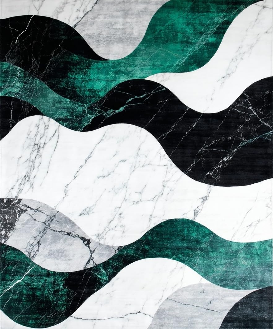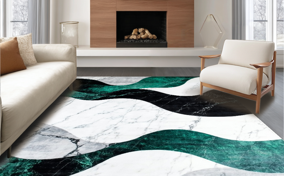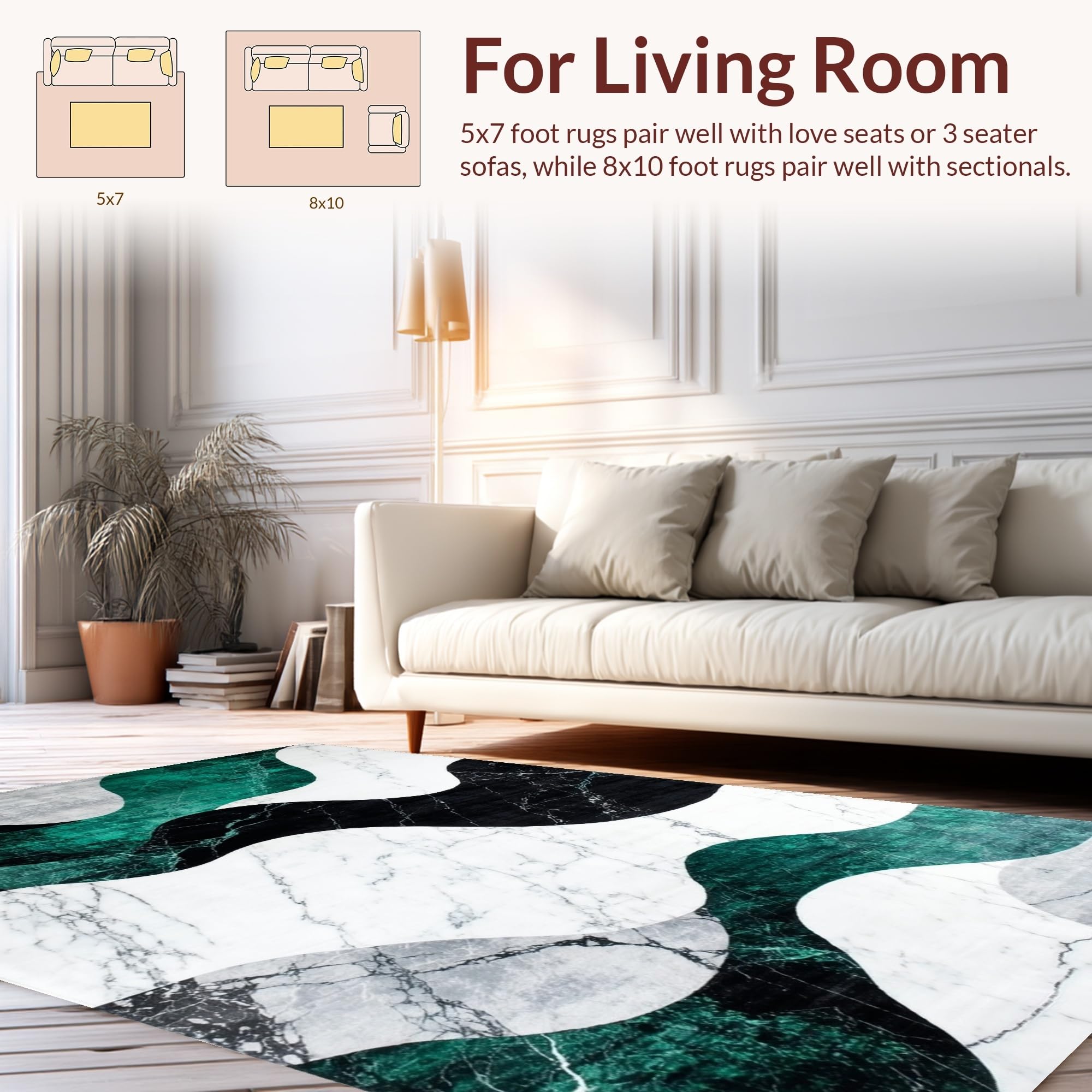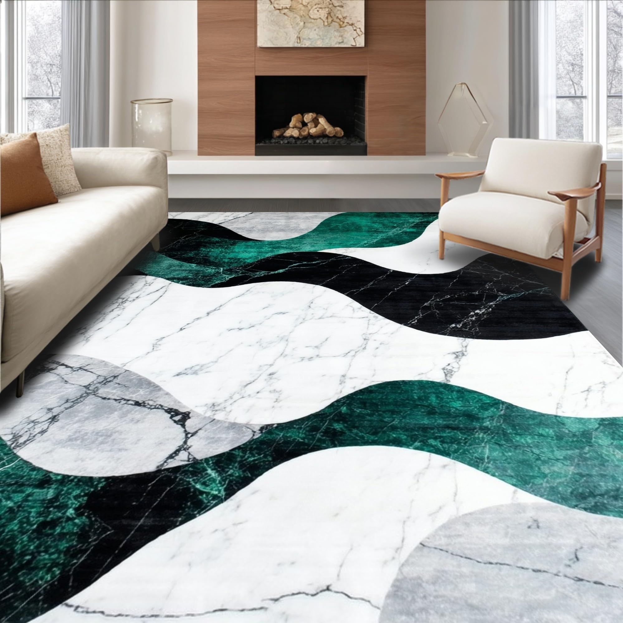 Ultra Soft Area Rug, Non Slip, Stain Resistant, Washable Area Rugs for Living Room, Bedroom, Emerald Swirl Abstract Elegance(White) Overview: