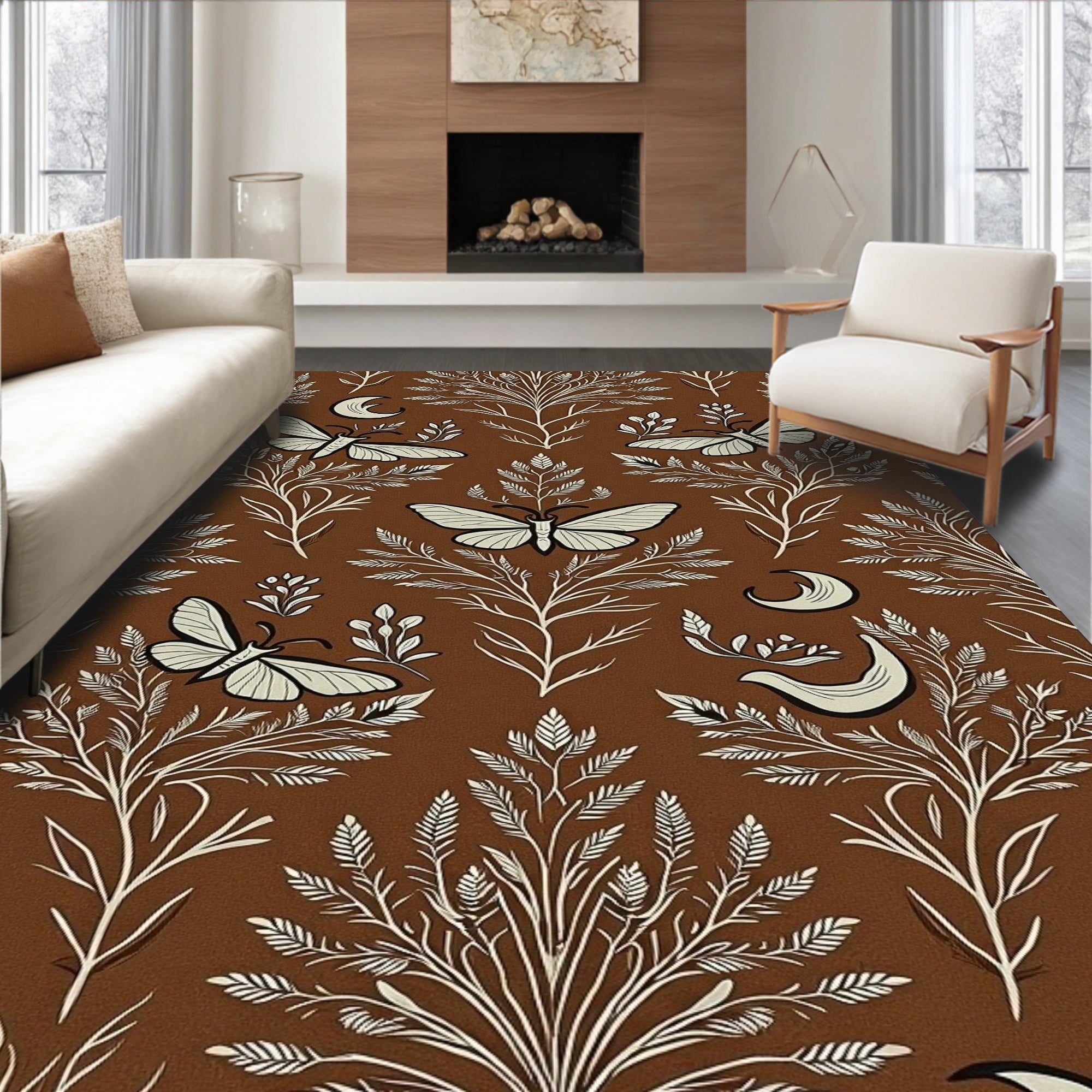 Ultra Soft Area Rug, Non Slip, Stain Resistant, Washable Area Rugs for Living Room, Bedroom, Enchanted Moonlit Meadow Moth and Mushroom Botanical(Brown) Overview: