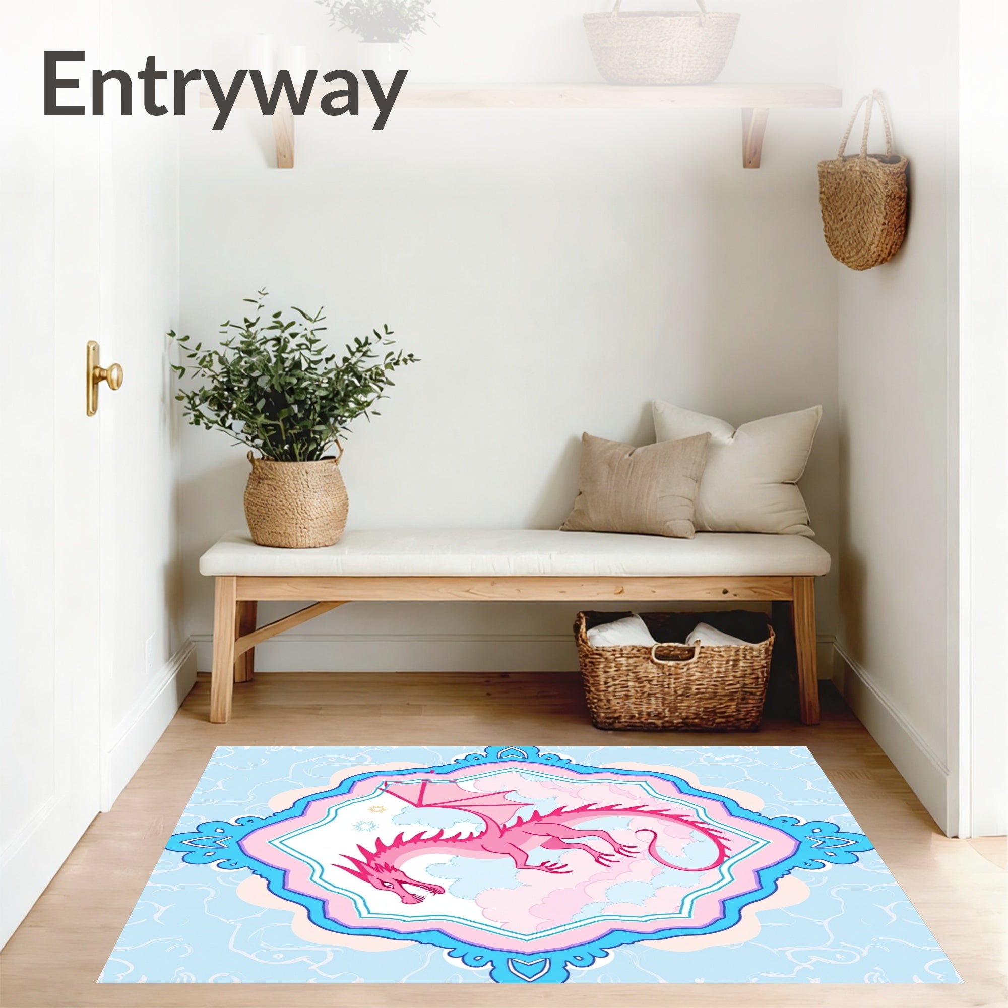Flatwoven High Traffic Area Rug, Enchanted Mythical Dragon Fantasy Whimsical Medallion Circular, Non Slip, Stain Resistant, Washable Area Rugs for Living Room, Bedroom (Pink) Overview: