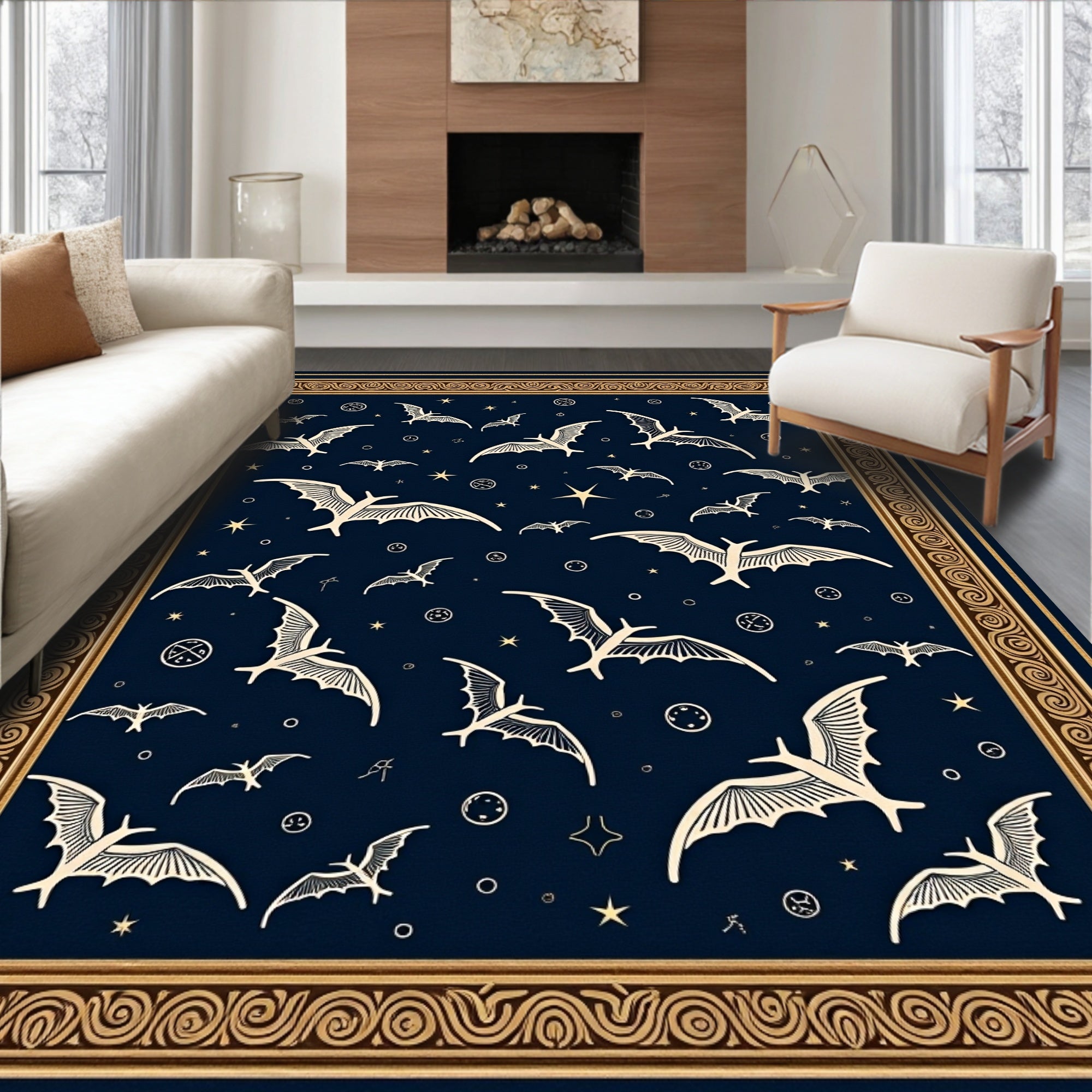 Flatwoven High Traffic Area Rug, Enchanted Night Sky Astronomy with Flying Bat Silhouettes, Non Slip, Stain Resistant, Washable Area Rugs for Living Room, Bedroom (Blue) Overview: