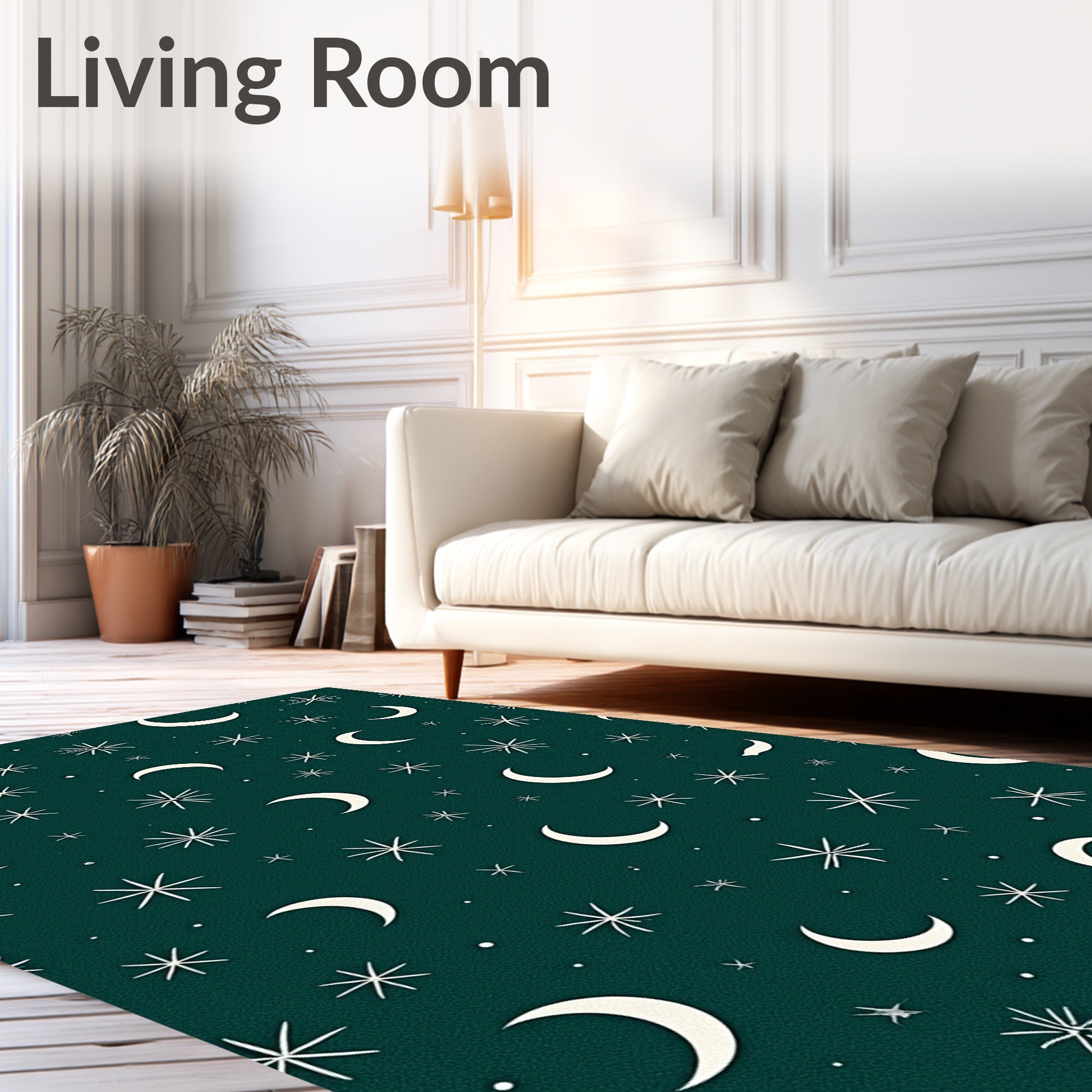Flatwoven High Traffic Area Rug, Enchanted Night Sky featuring Moons and Twinkling Stars, Non Slip, Stain Resistant, Washable Area Rugs for Living Room, Bedroom (Green) Overview: