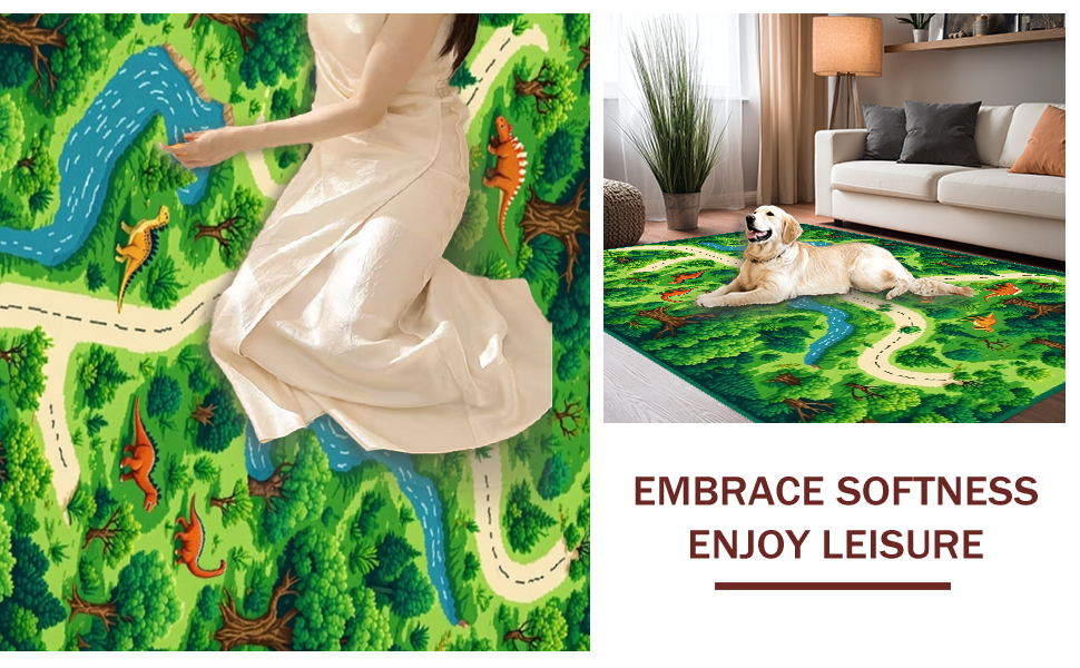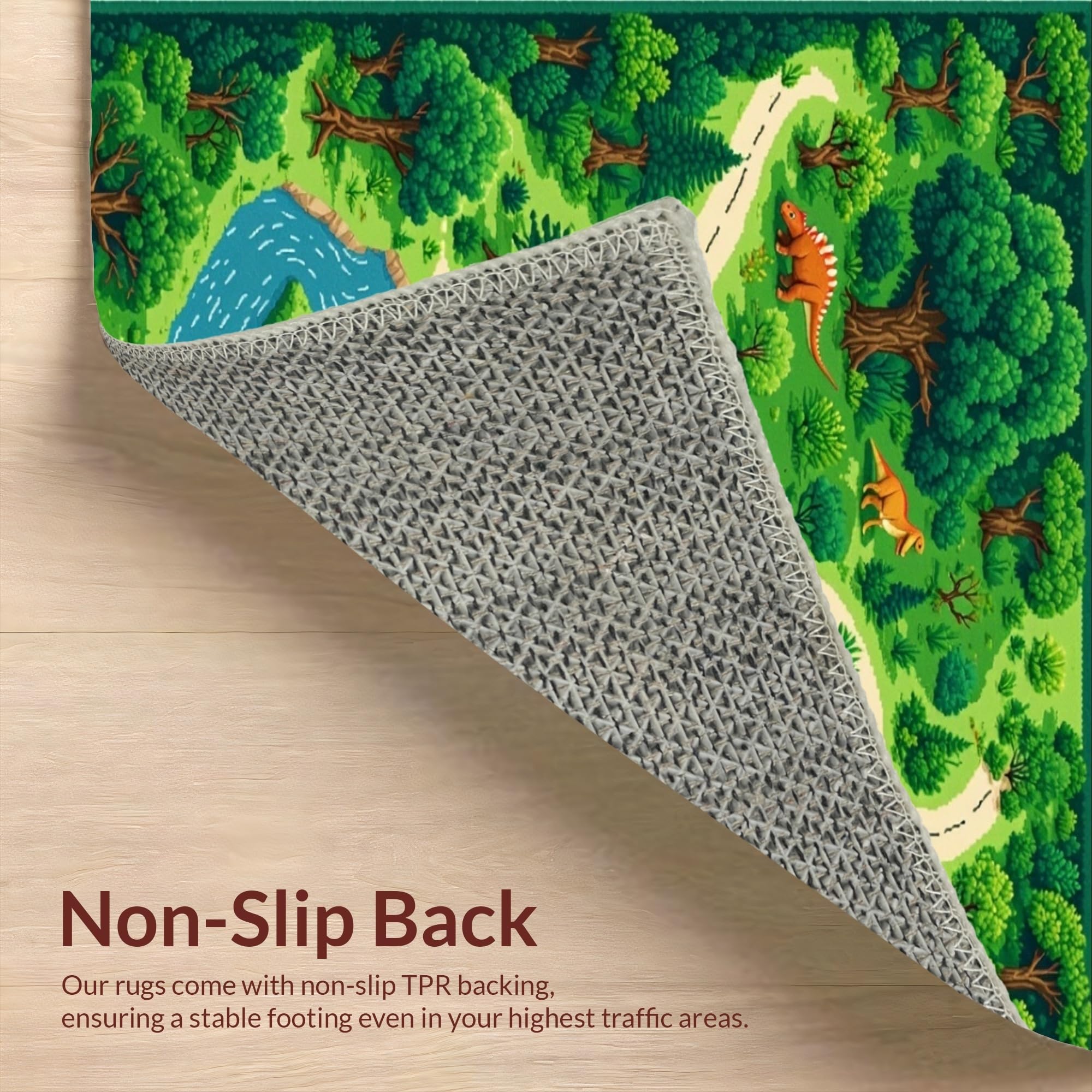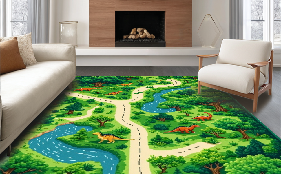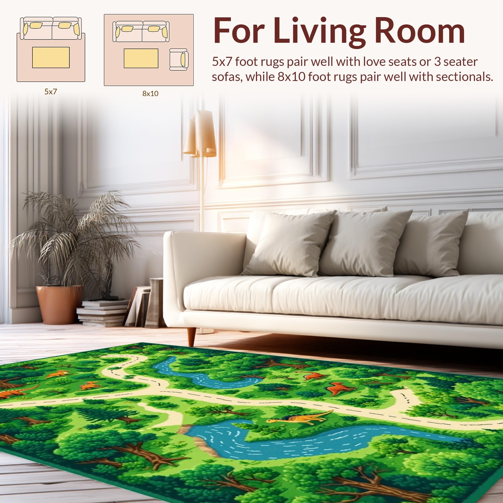 Ultra Soft Area Rug, Non Slip, Stain Resistant, Washable Area Rugs for Living Room, Bedroom, Engaging Dino Kingdom Pathway(Green) Overview: