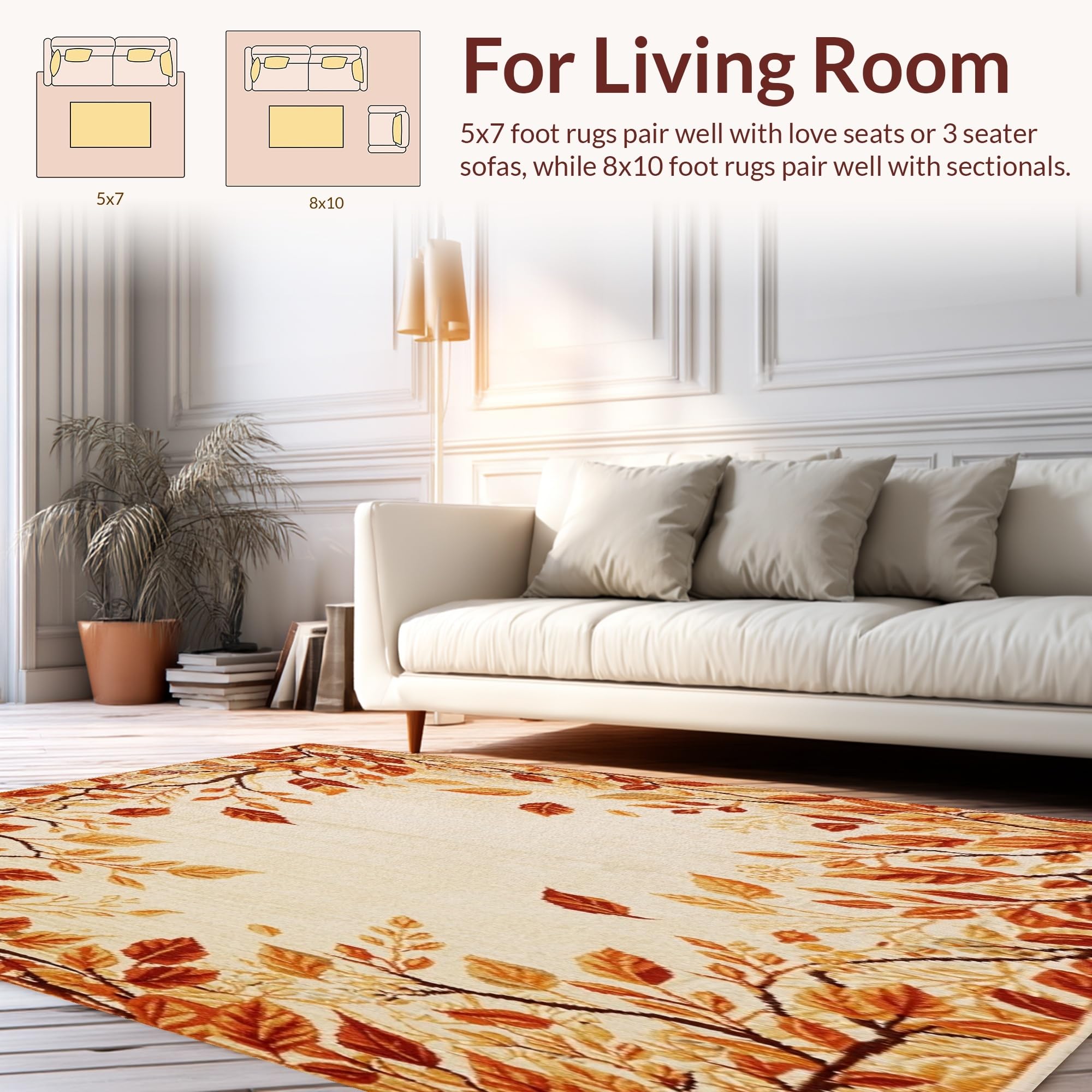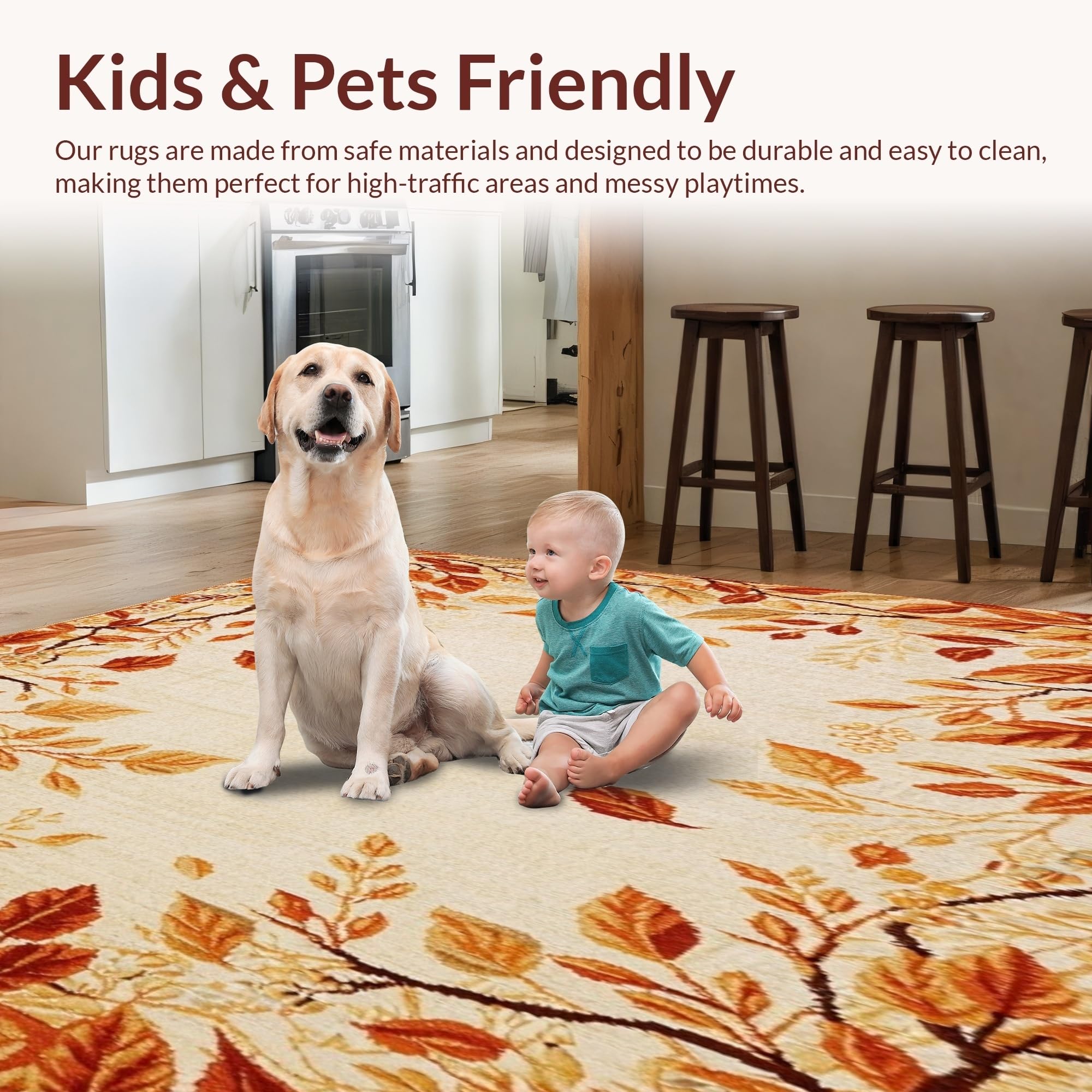 Ultra Soft Area Rug, Non Slip, Stain Resistant, Washable Area Rugs for Living Room, Bedroom, Fallen Leaves Circular Area in Earthy Shades and Floral(Beige) Overview: