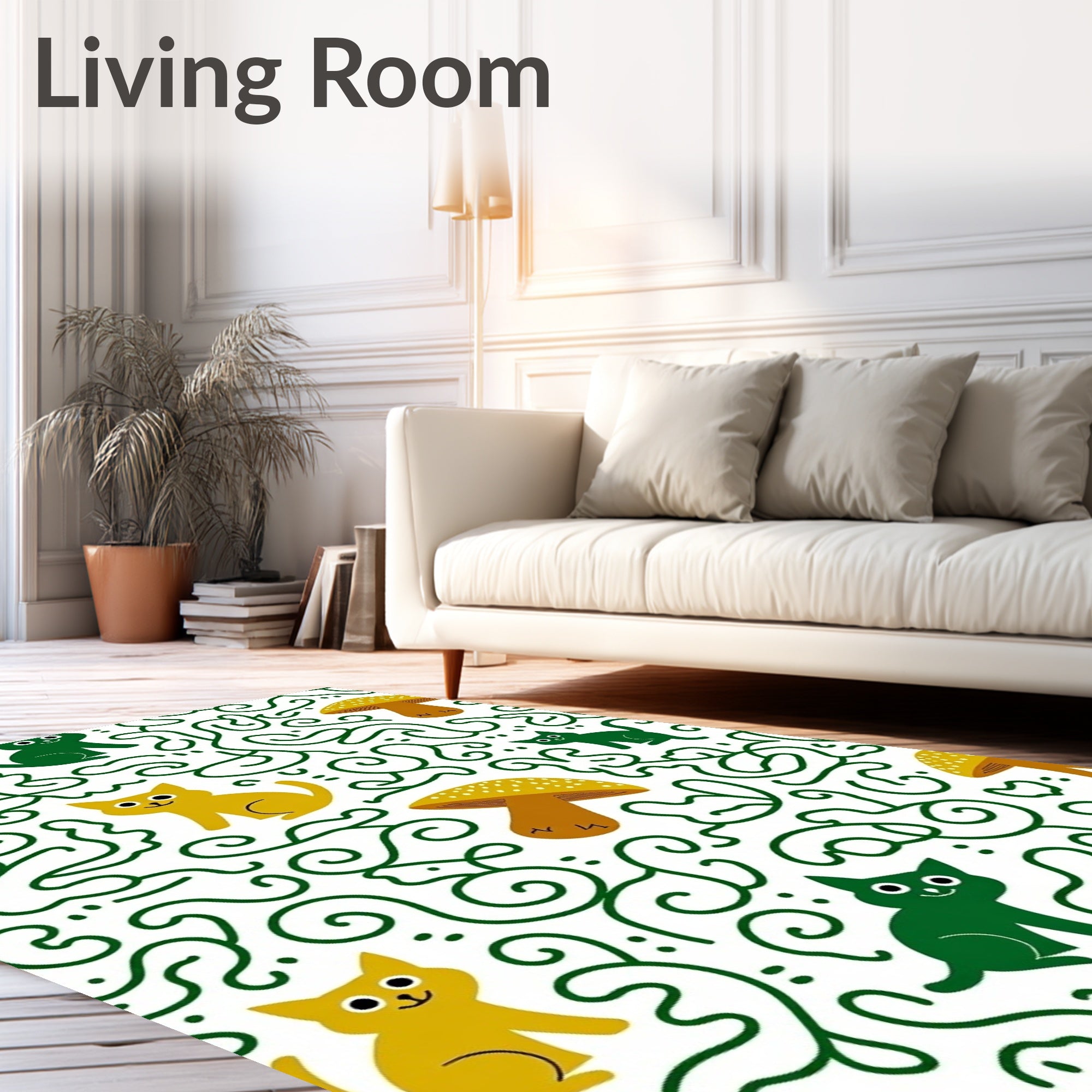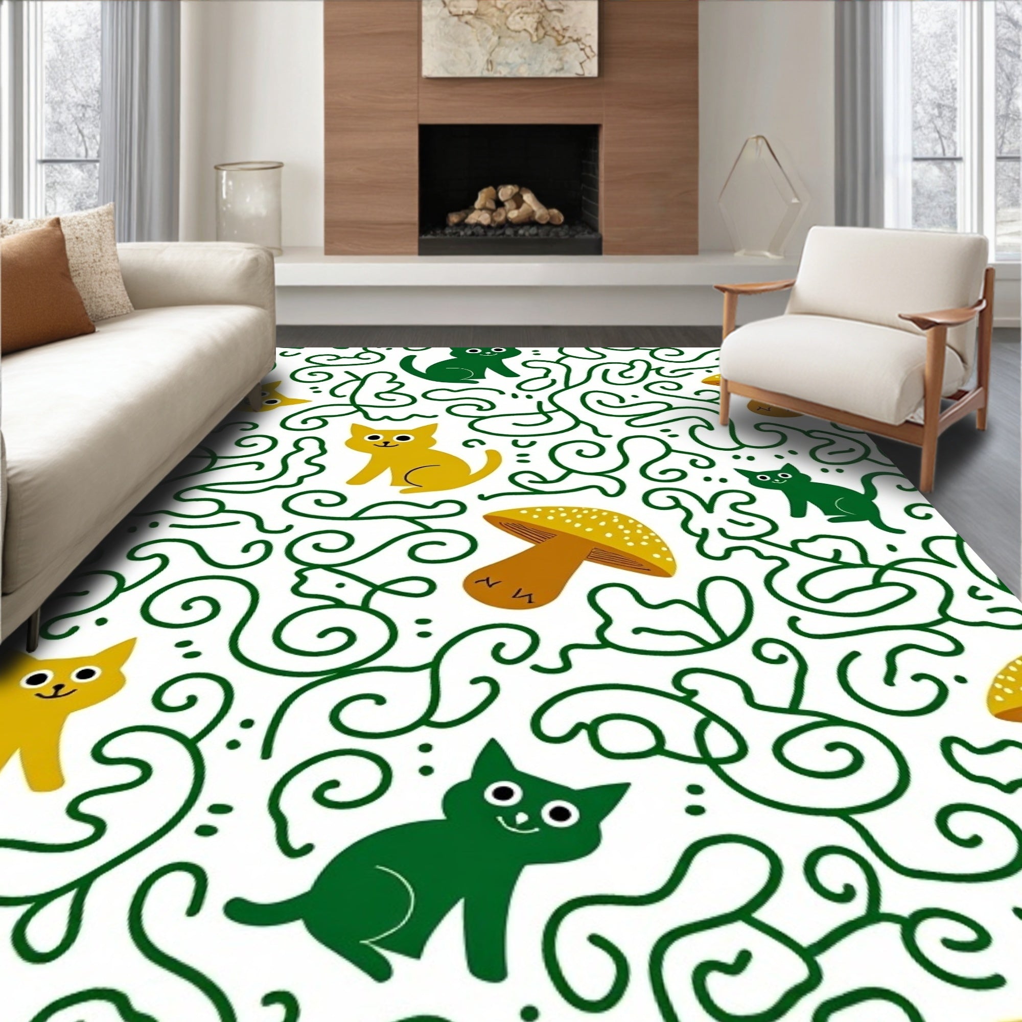 Flatwoven High Traffic Area Rug, Fantasy Forest Cat Adventure Illustrated Animal, Non Slip, Stain Resistant, Washable Area Rugs for Living Room, Bedroom (Green) Overview: