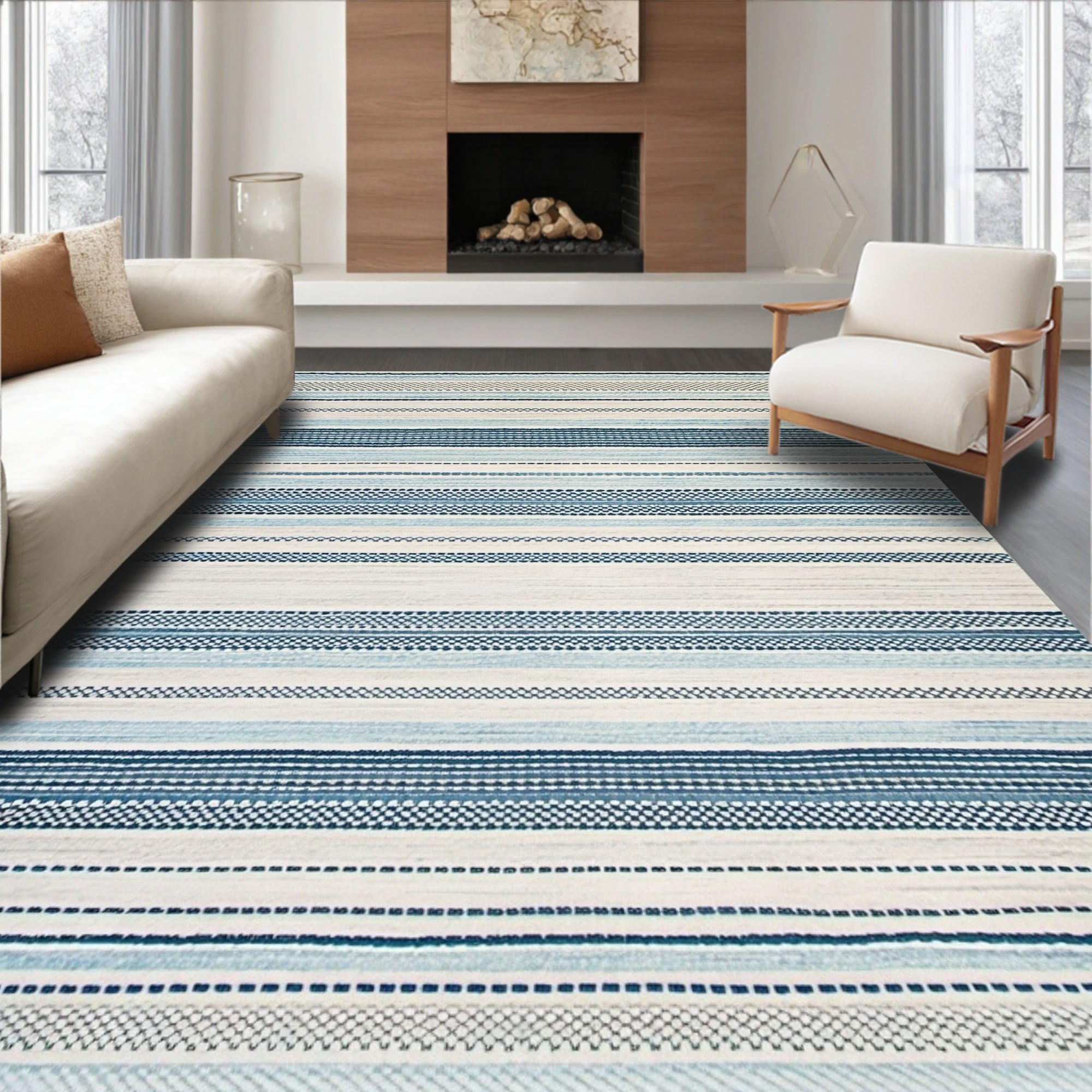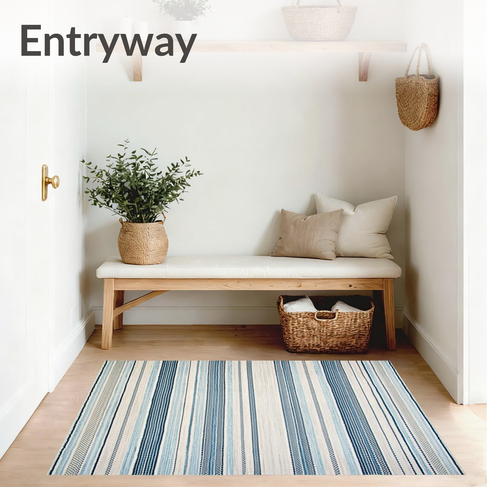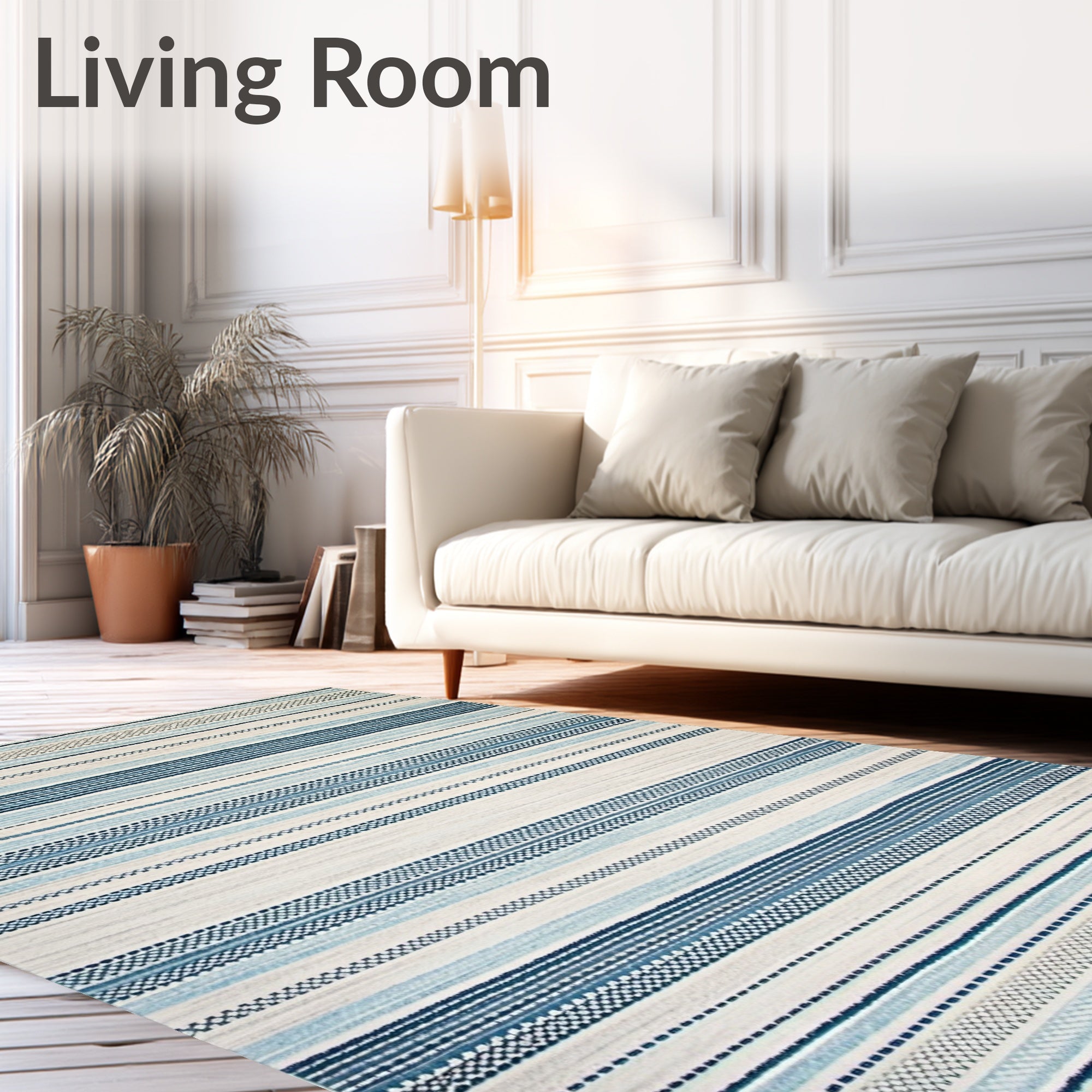 Ultra Soft Area Rug, Non Slip, Stain Resistant, Washable Area Rugs for Living Room, Bedroom, Farmhouse Braid Blue Beige Stripe Motif Rustic Woven(Blue) Overview: