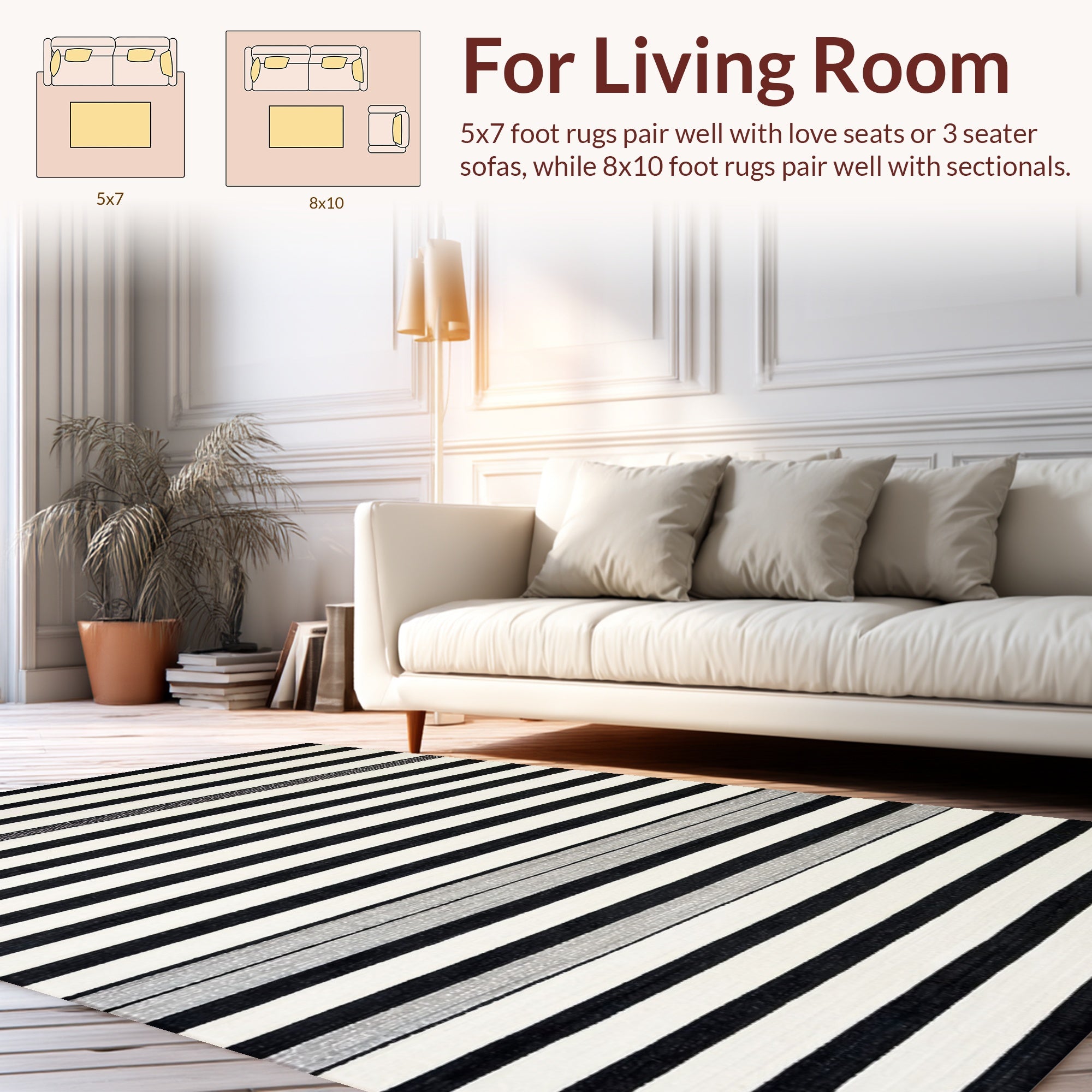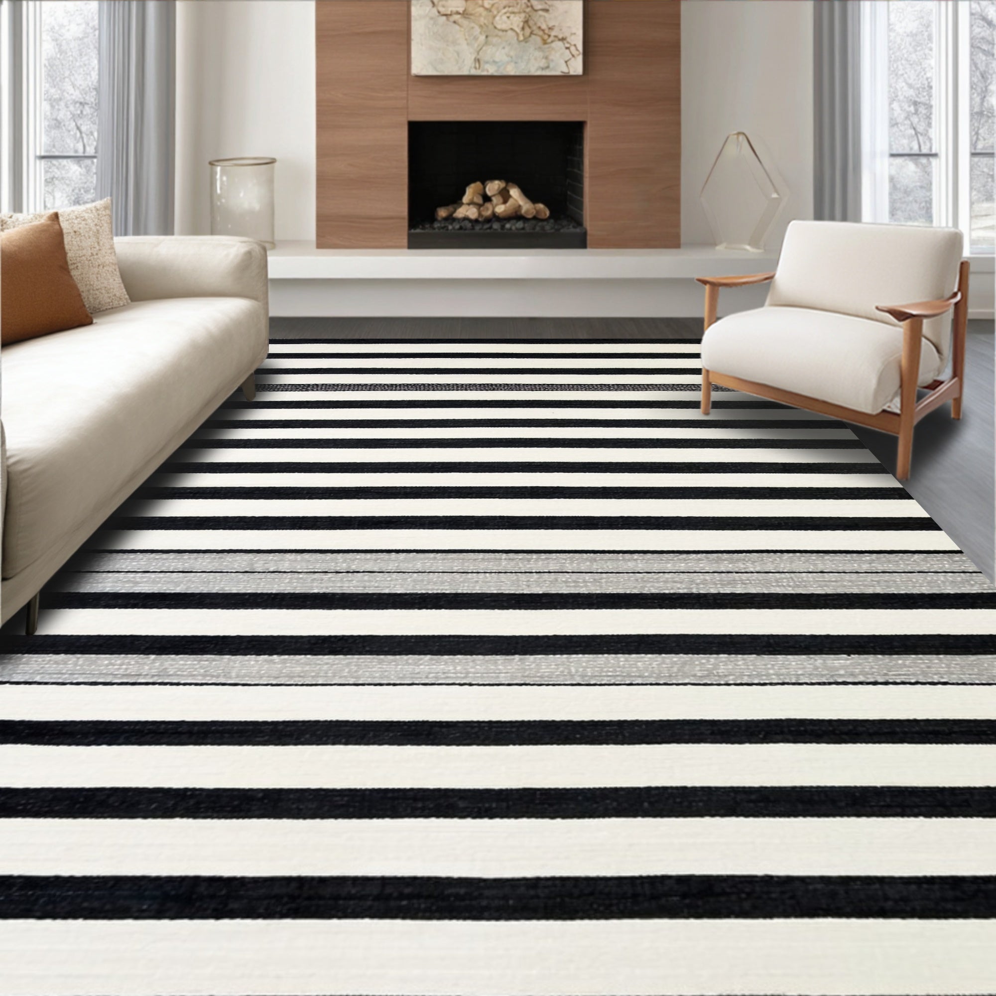 Ultra Soft Area Rug, Non Slip, Stain Resistant, Washable Area Rugs for Living Room, Bedroom, Farmhouse Style Striped Carpet for Porch Entry(Black) Overview: