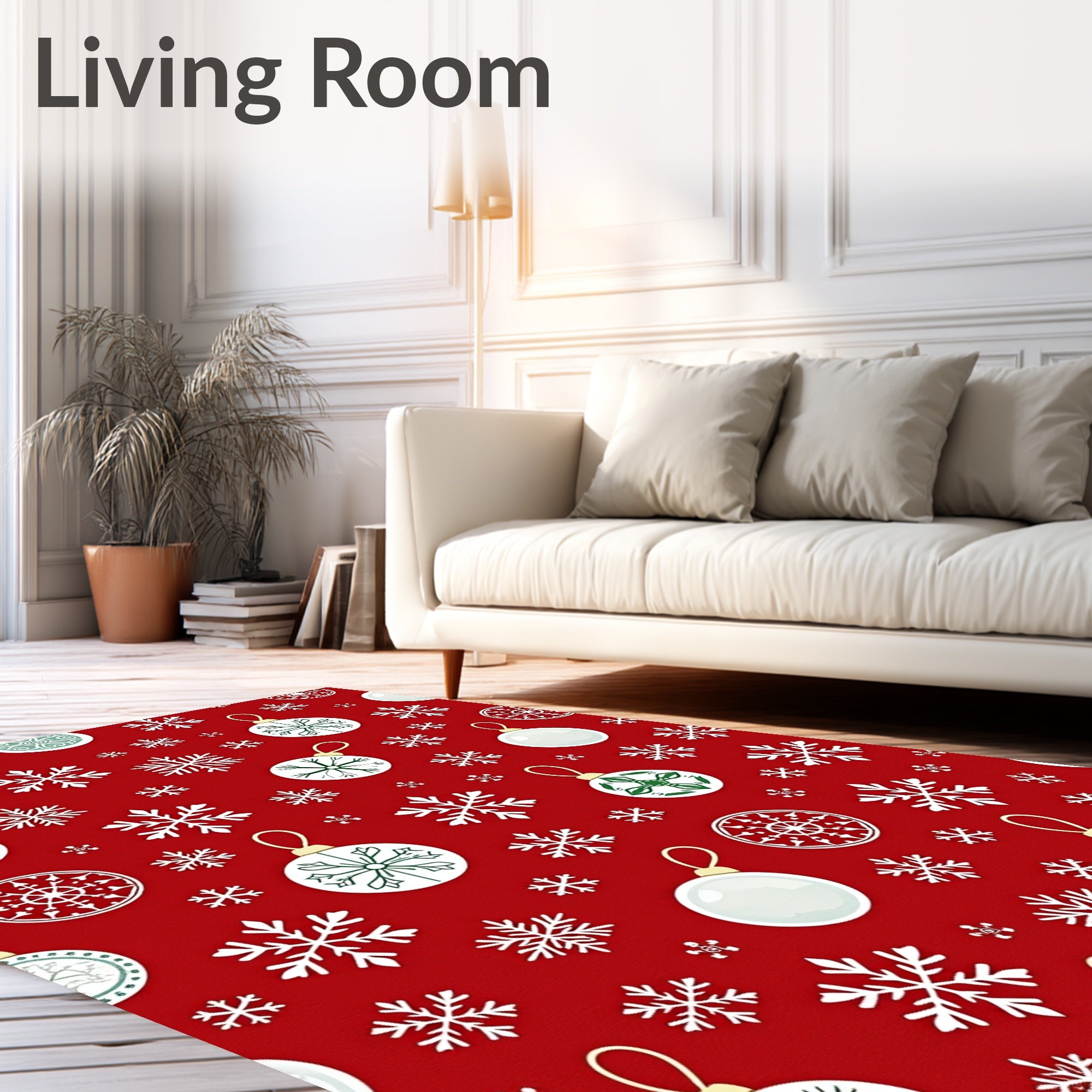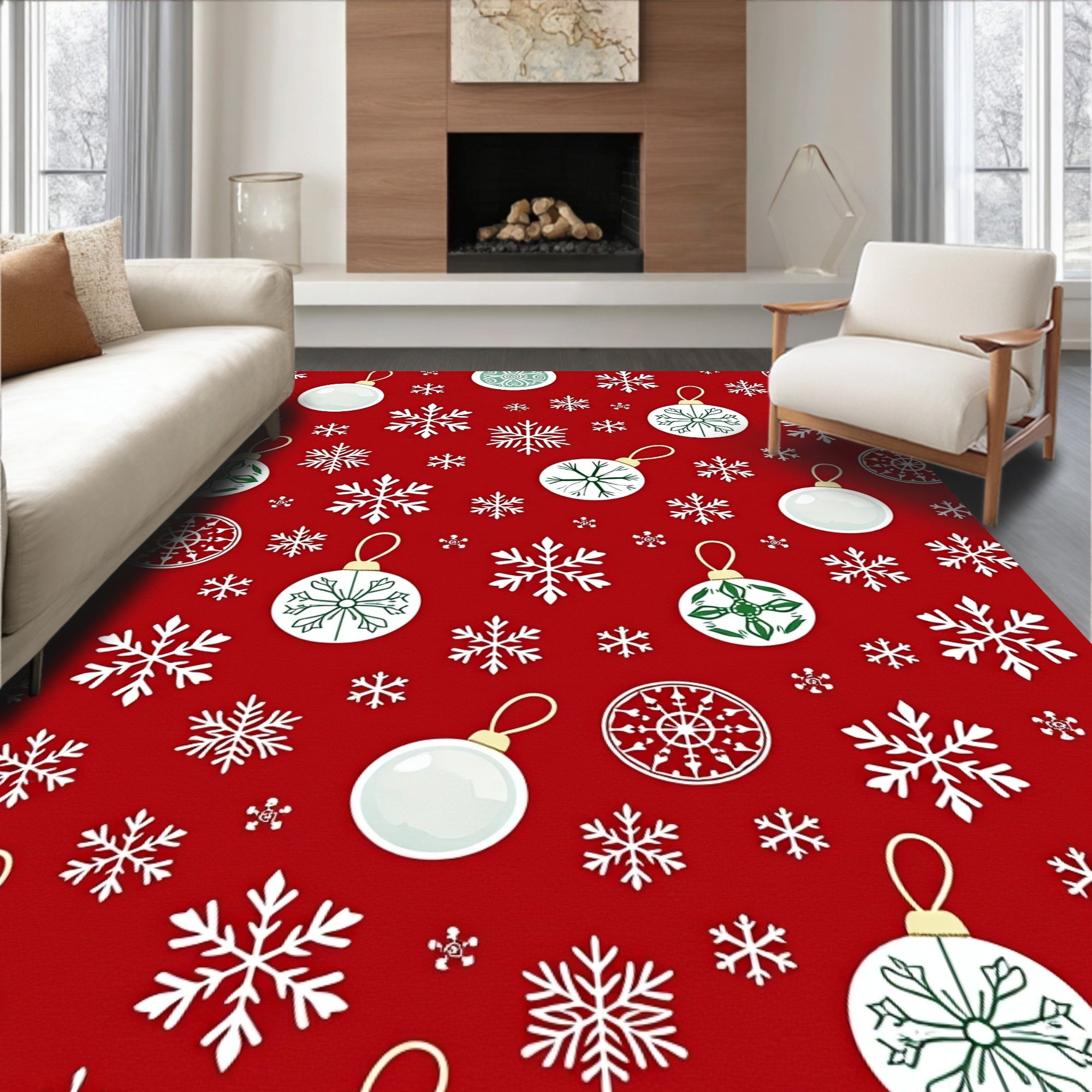 Ultra Soft Area Rug, Non Slip, Stain Resistant, Washable Area Rugs for Living Room, Bedroom, Festive Bauble Cascade with Delicate Snow Crystal Overlay Art(Red) Overview:
