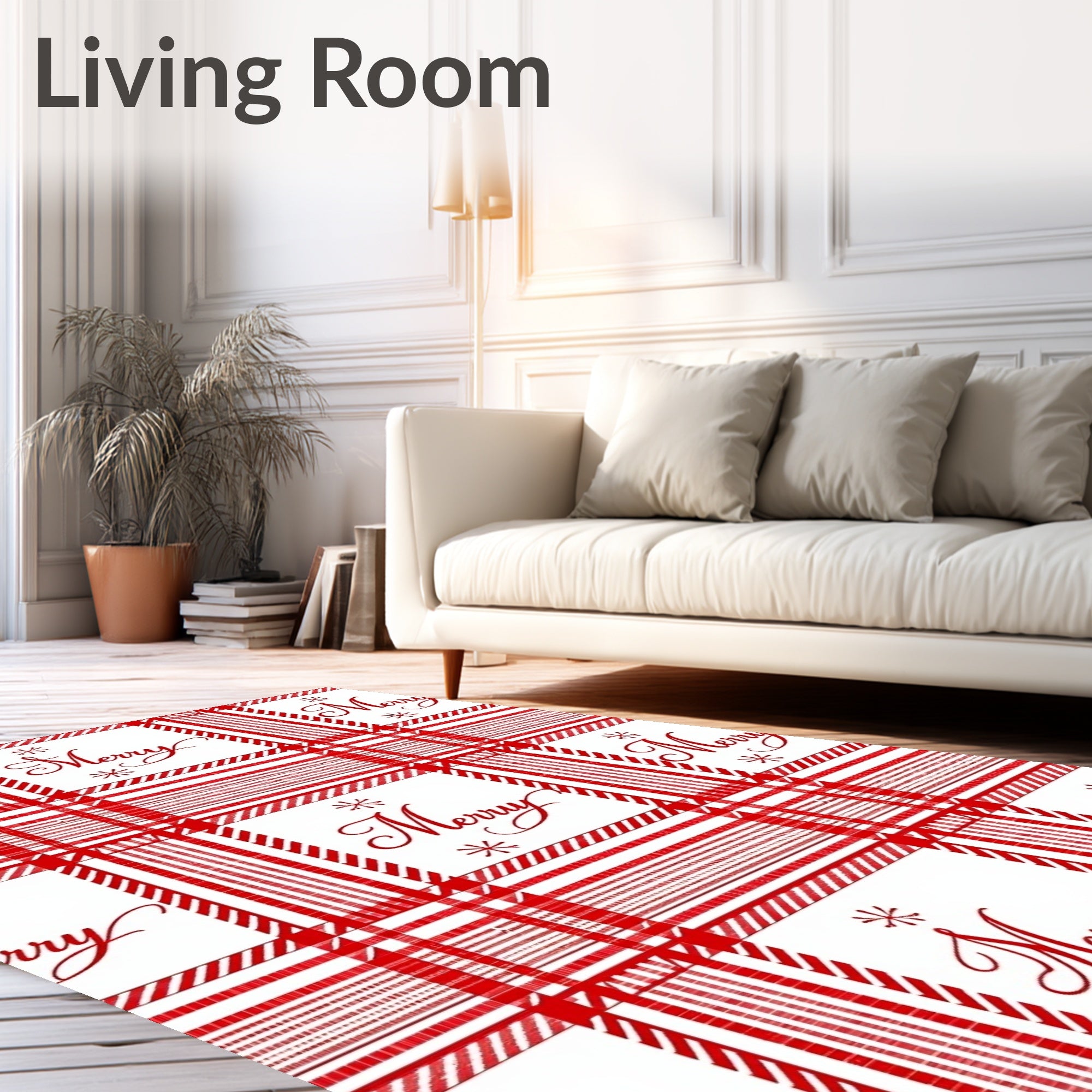 Ultra Soft Area Rug, Non Slip, Stain Resistant, Washable Area Rugs for Living Room, Bedroom, Festive Buffalo Plaid With Classic Merry Script Snowflake(Red) Overview:
