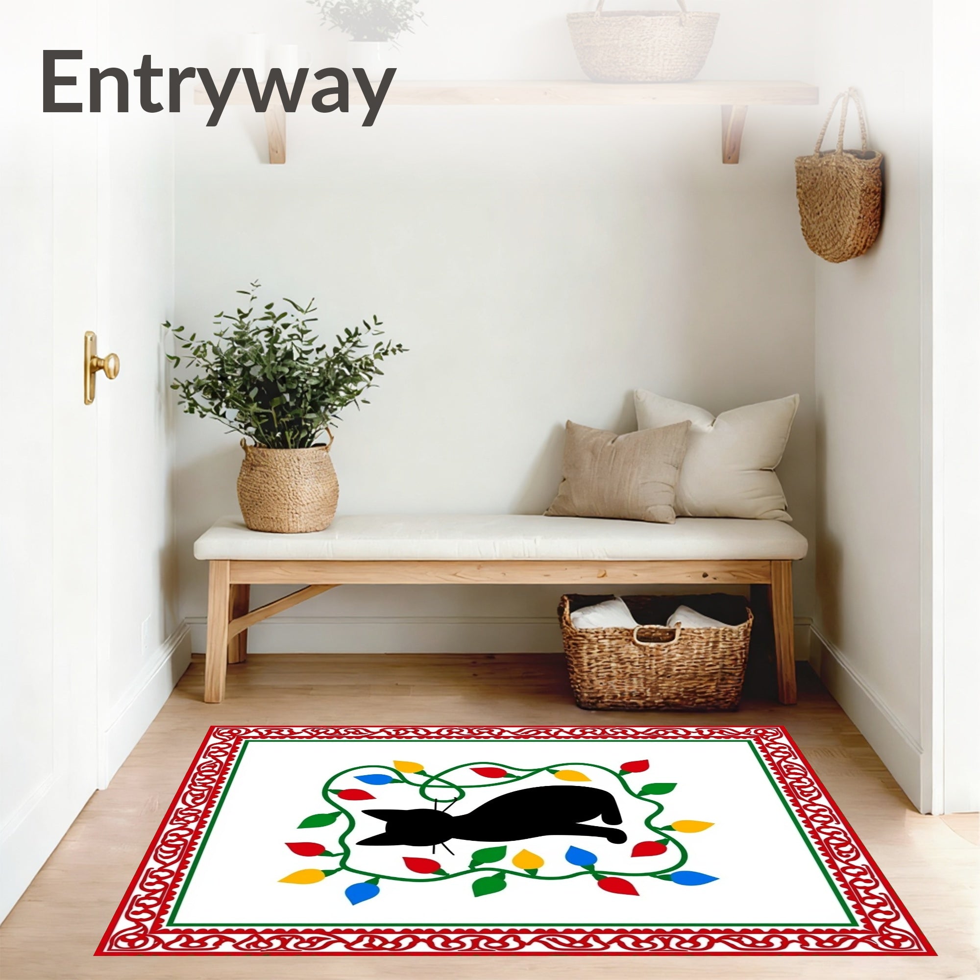 Ultra Soft Area Rug, Non Slip, Stain Resistant, Washable Area Rugs for Living Room, Bedroom, Festive Cat Lights Tangle Holiday Whimsy Design(Red) Overview: