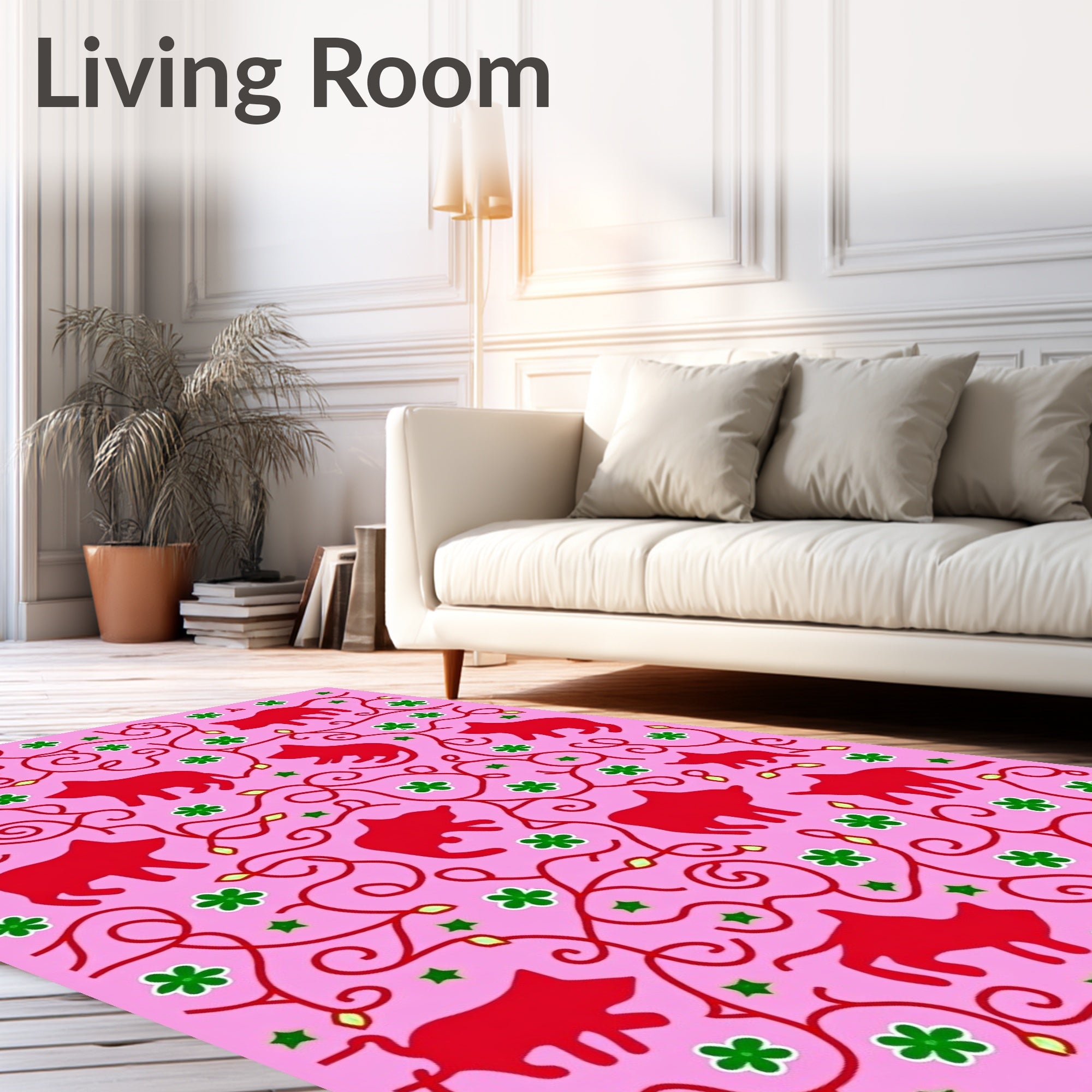 Ultra Soft Area Rug, Non Slip, Stain Resistant, Washable Area Rugs for Living Room, Bedroom, Festive Cat Silhouettes Featuring Twinkling Holiday Lights(Pink) Overview: