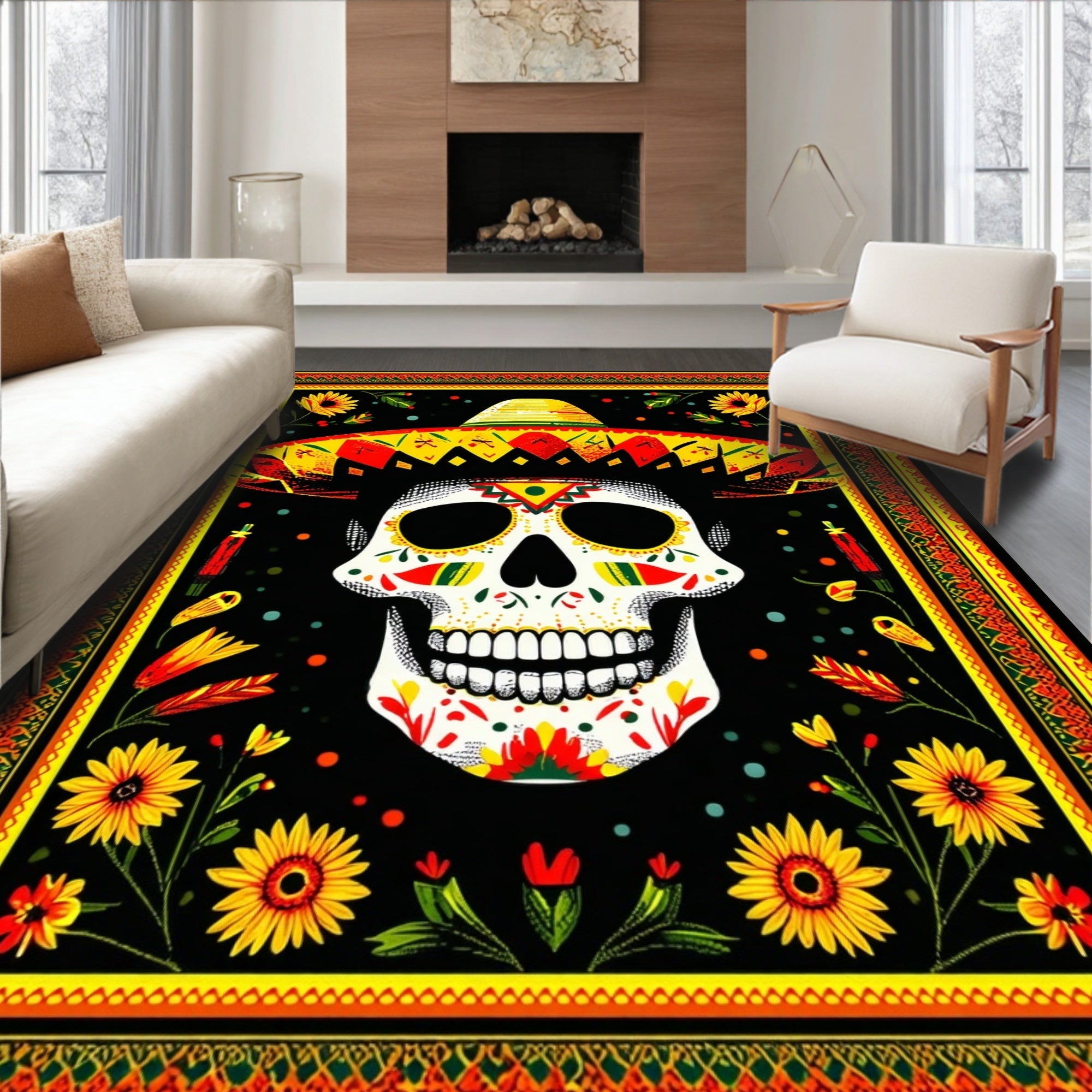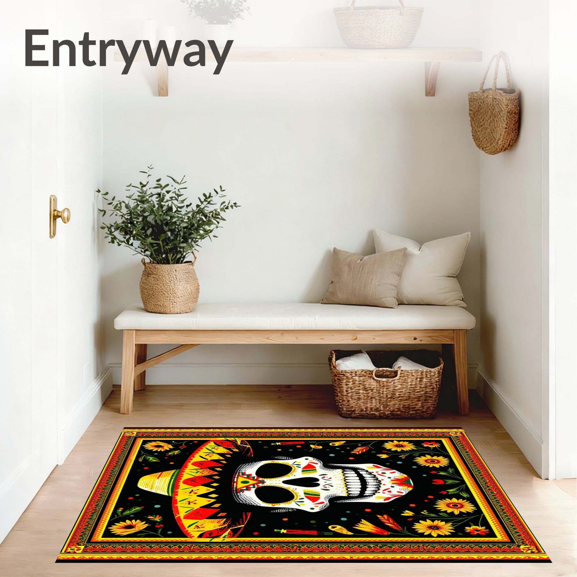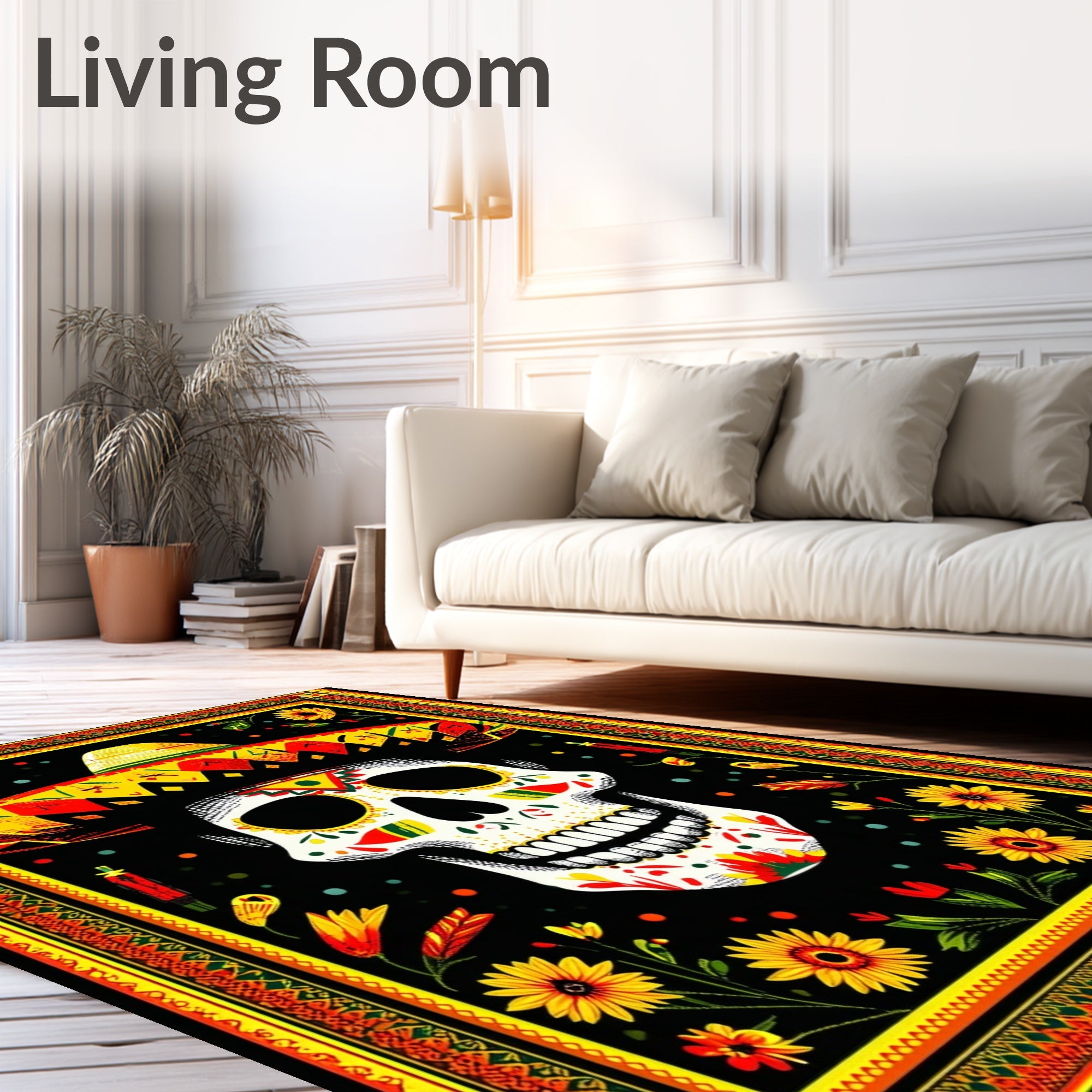 Ultra Soft Area Rug, Non Slip, Stain Resistant, Washable Area Rugs for Living Room, Bedroom, Festive Colorful Dia de los Muertos(Black) Overview: