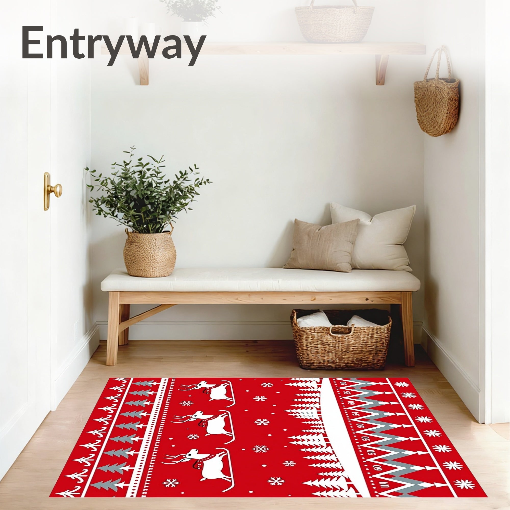 Ultra Soft Area Rug, Non Slip, Stain Resistant, Washable Area Rugs for Living Room, Bedroom, Festive Elk Toboggan Holiday Semicircle Welcome Entrance(Red) Overview: