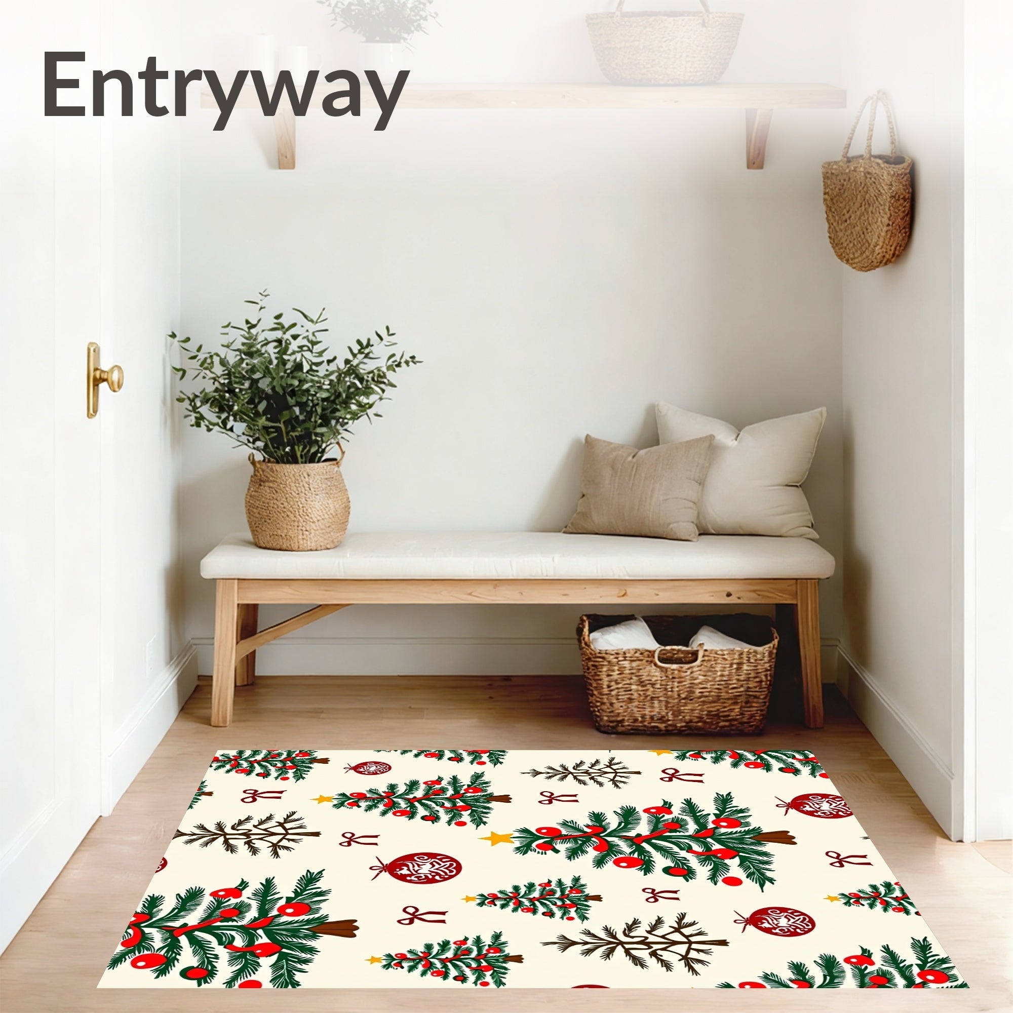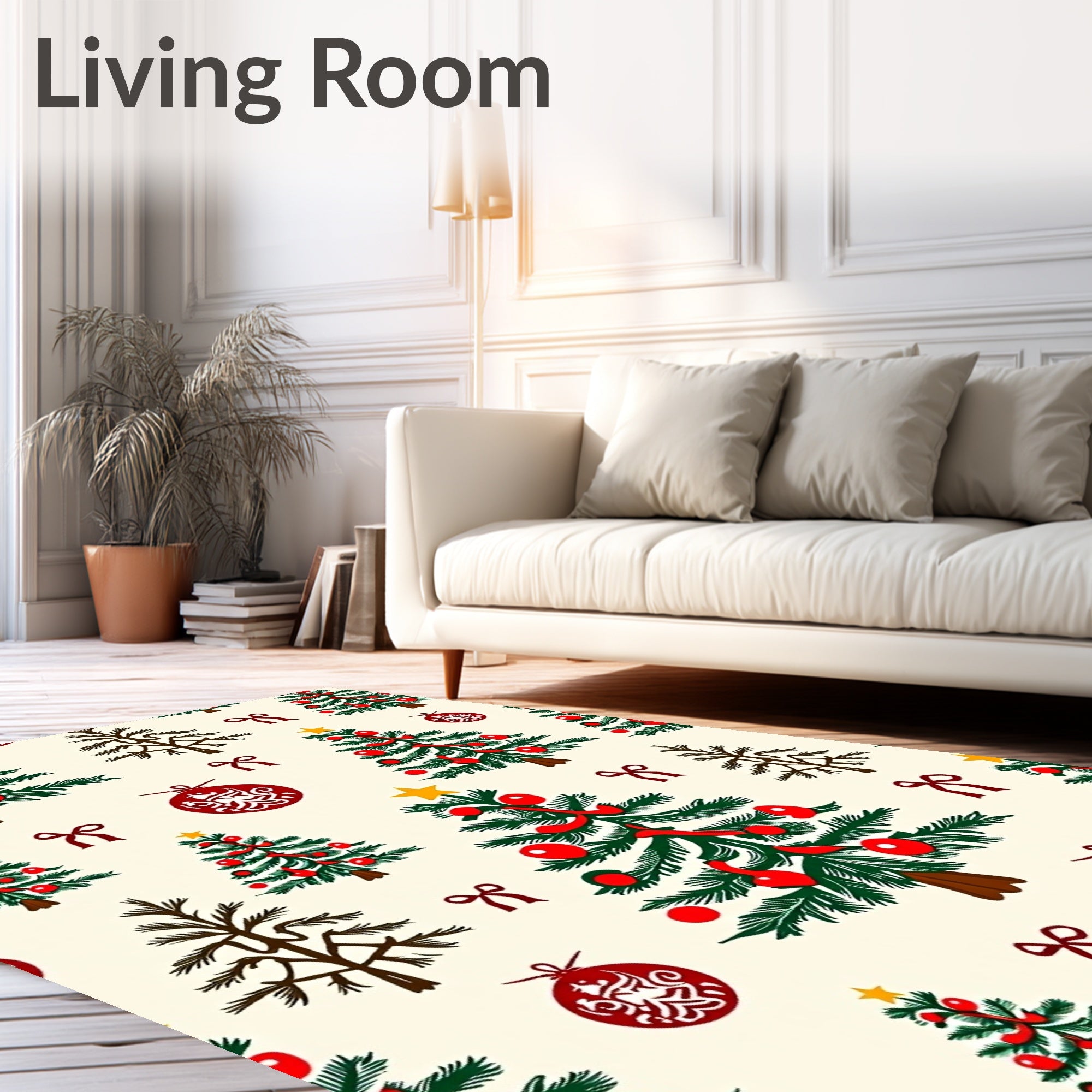 Ultra Soft Area Rug, Non Slip, Stain Resistant, Washable Area Rugs for Living Room, Bedroom, Festive Evergreen Holiday Tapestry With Ornamental Decorations(Cream) Overview: