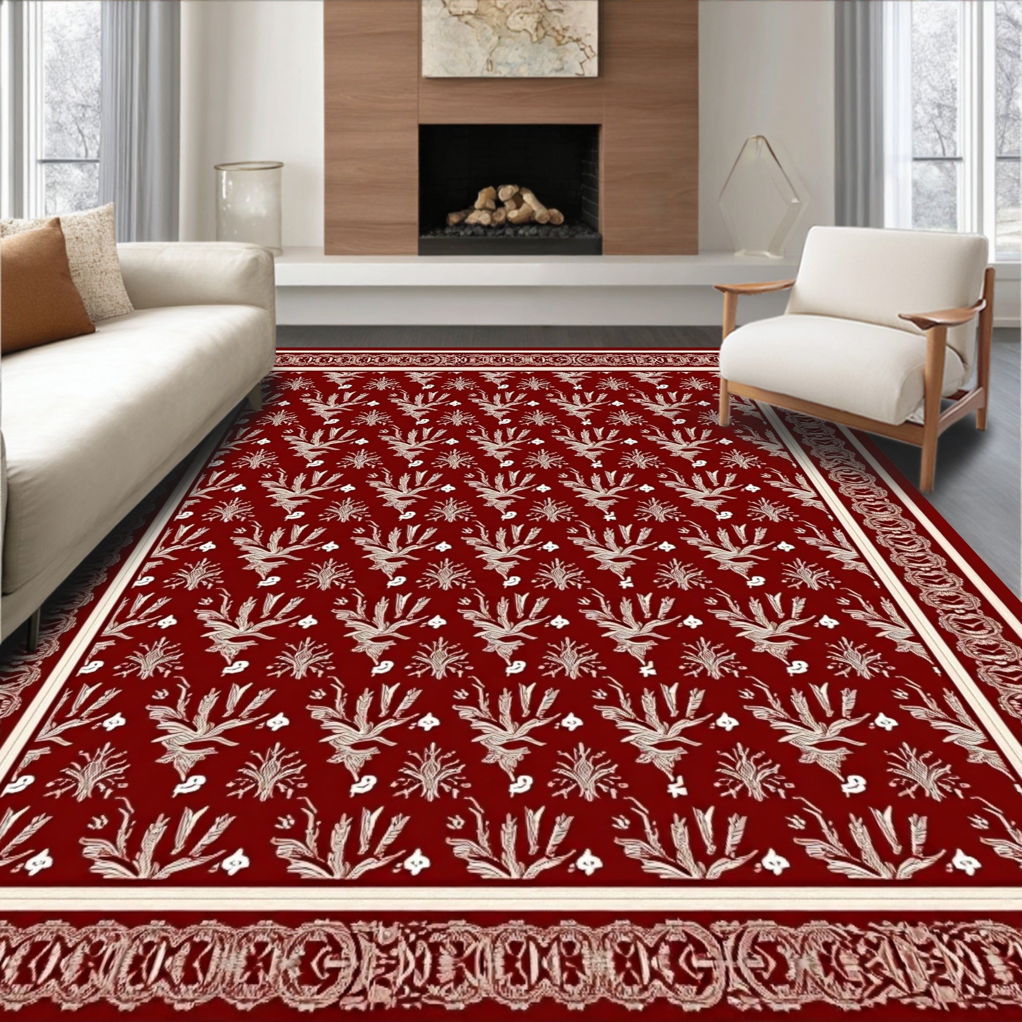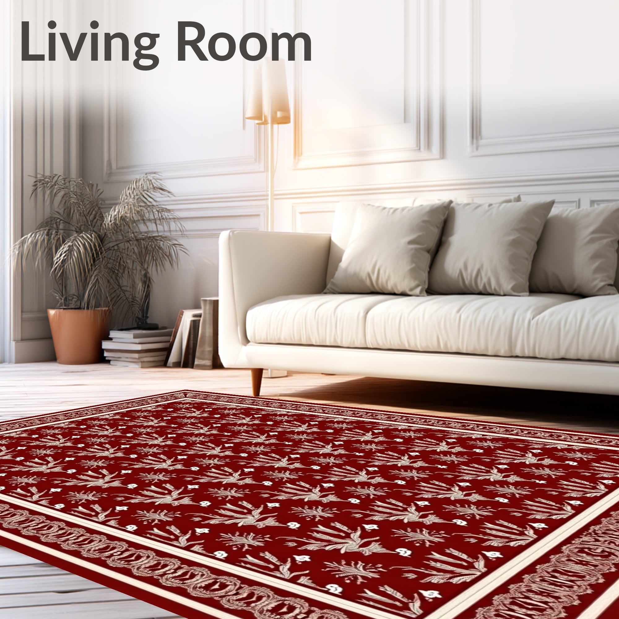 Ultra Soft Area Rug, Non Slip, Stain Resistant, Washable Area Rugs for Living Room, Bedroom, Festive Evergreen Tapestry With Snowy Branch Motif(Red) Overview: