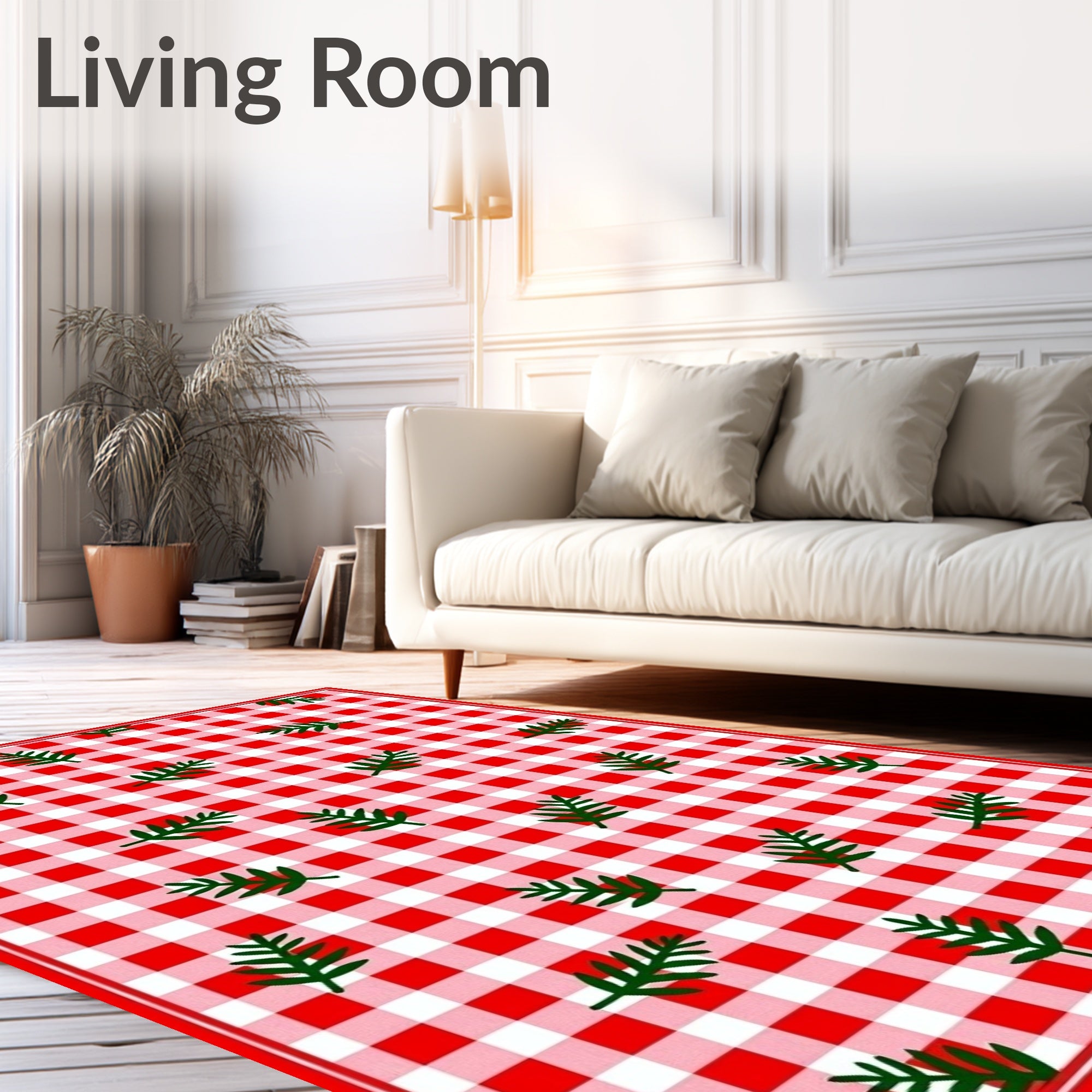 Ultra Soft Area Rug, Non Slip, Stain Resistant, Washable Area Rugs for Living Room, Bedroom, Festive Gingham Patchwork with Evergreen Sprig Accents(Red) Overview: