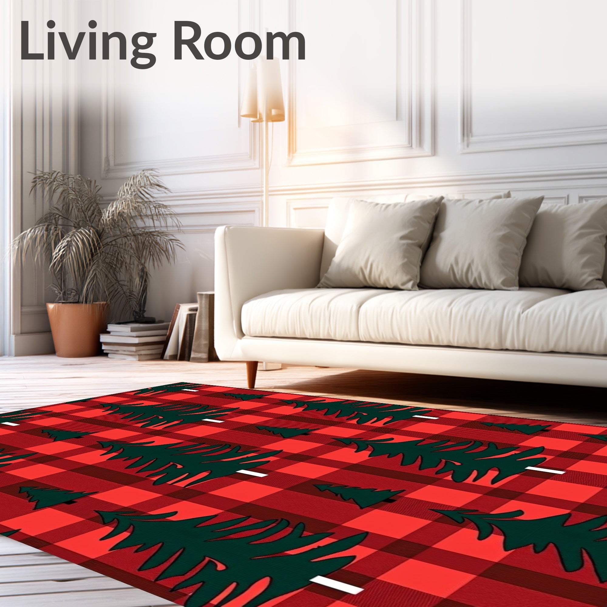 Ultra Soft Area Rug, Non Slip, Stain Resistant, Washable Area Rugs for Living Room, Bedroom, Festive Pine Tree with Checkered Border Holiday(Red) Overview: