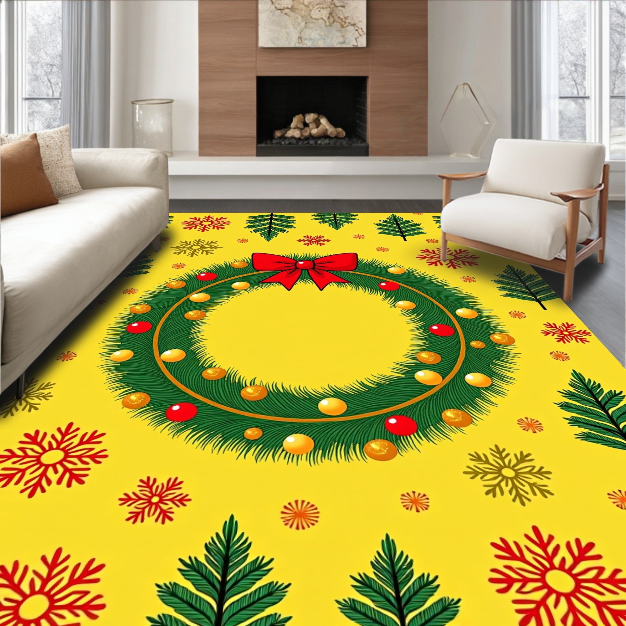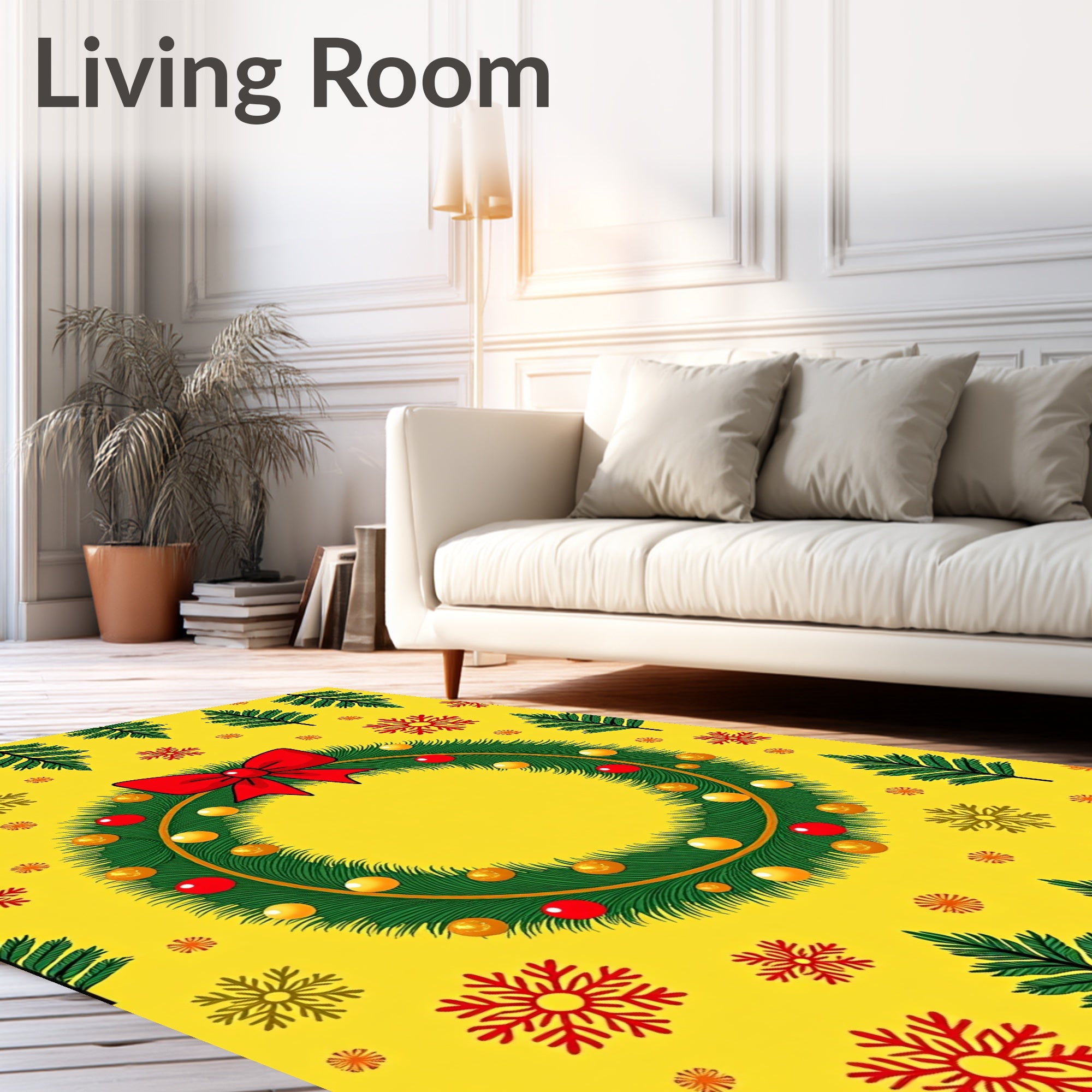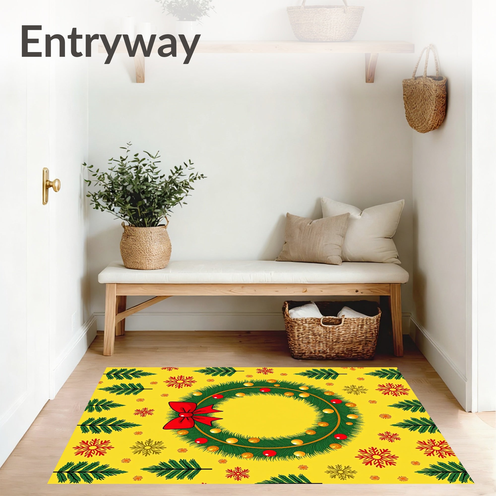 Flatwoven High Traffic Area Rug, Festive Pine Wreath Motif with Holly Berries and Twinkling Lights, Non Slip, Stain Resistant, Washable Area Rugs for Living Room, Bedroom (Yellow) Overview: