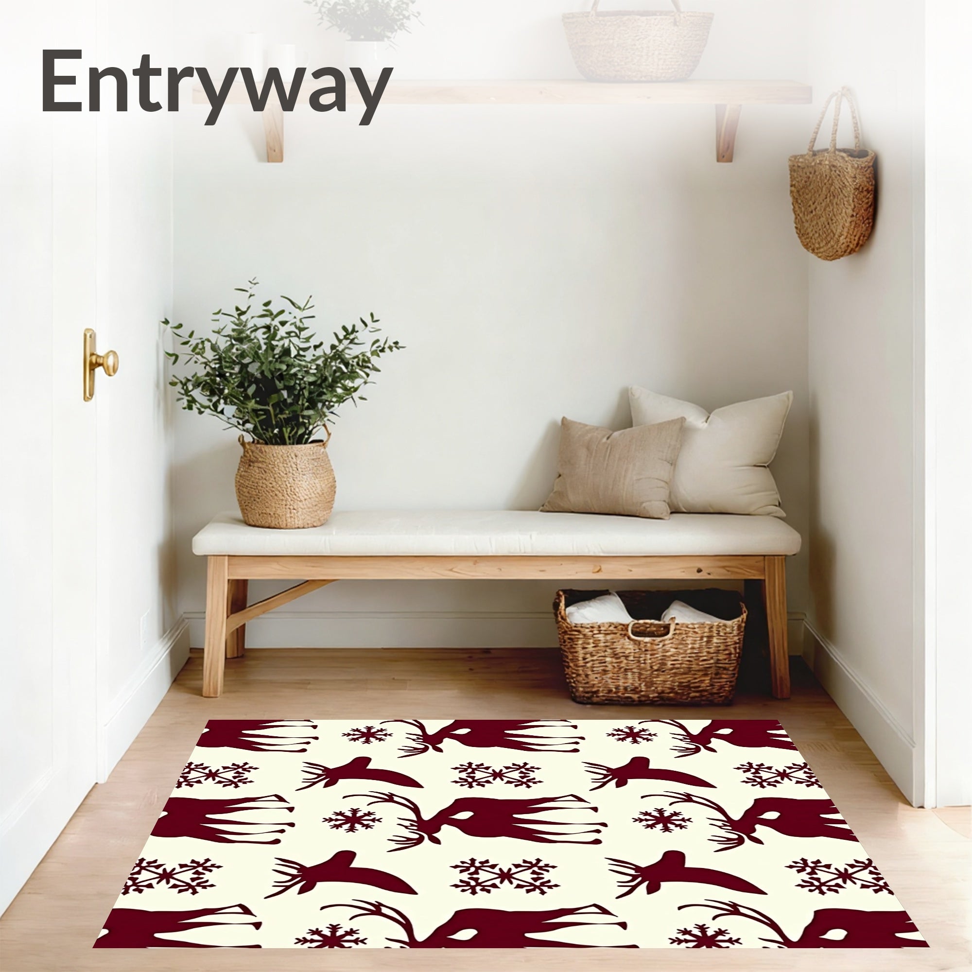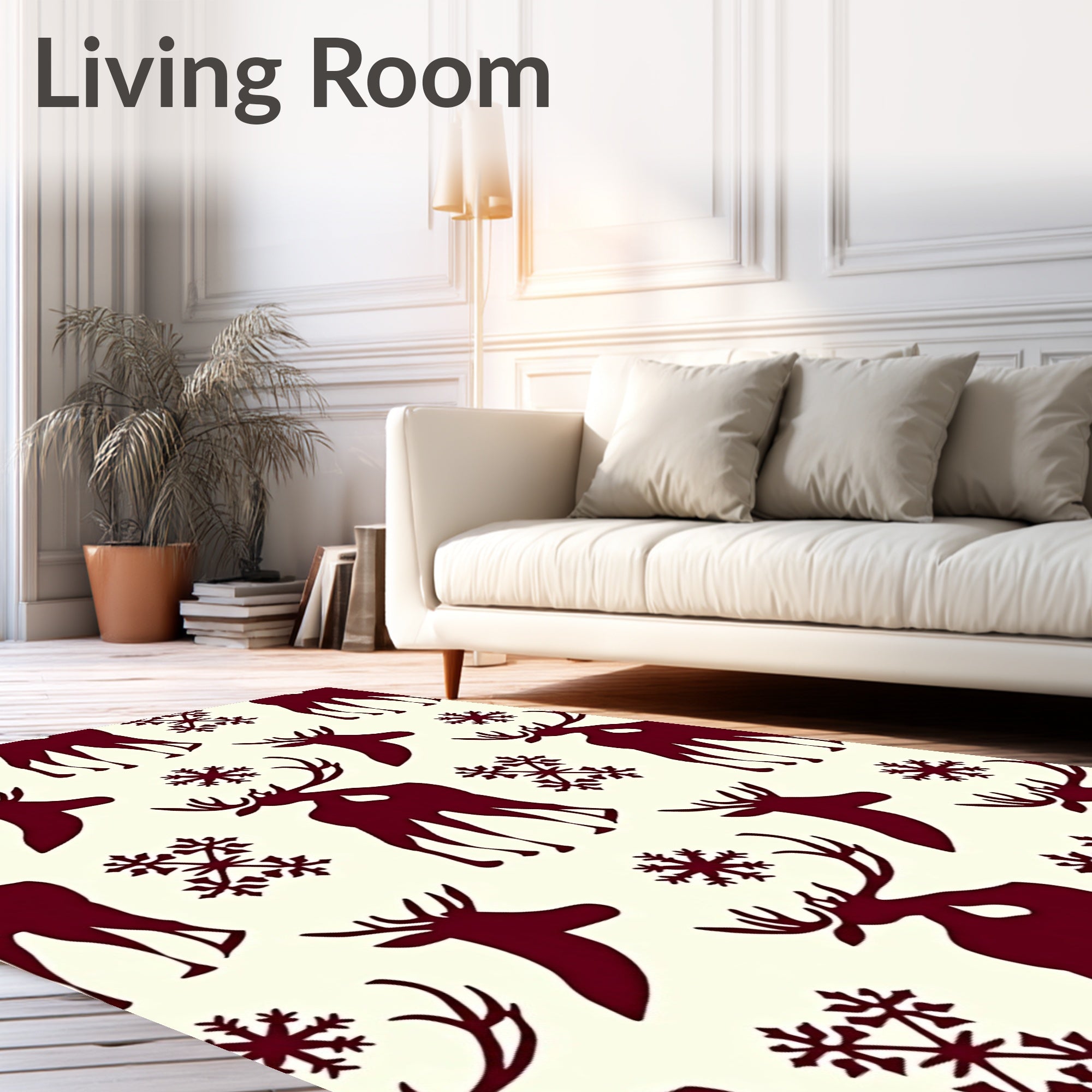 Ultra Soft Area Rug, Non Slip, Stain Resistant, Washable Area Rugs for Living Room, Bedroom, Festive Reindeer Area with Snowflake Motifs(Red) Overview: