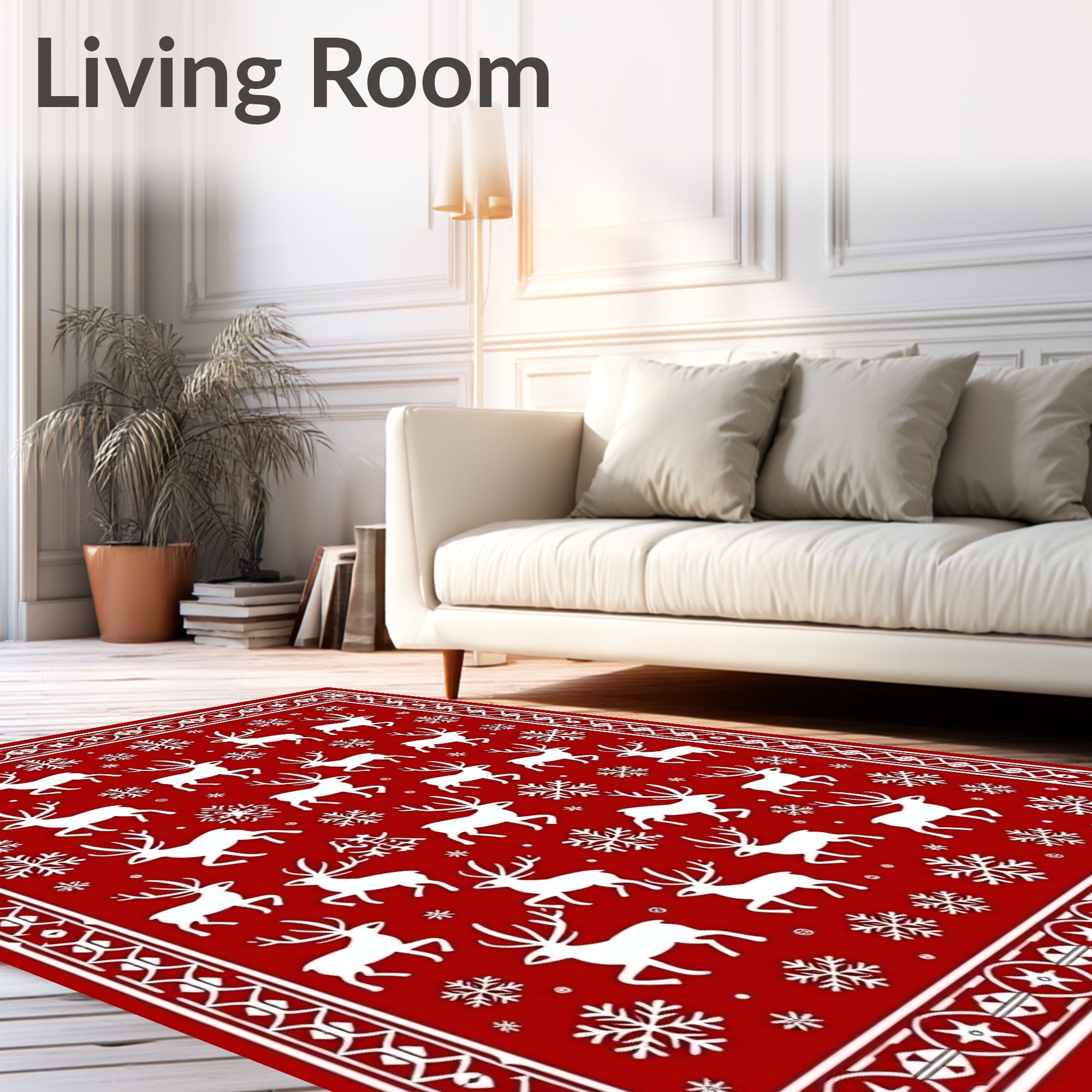 Ultra Soft Area Rug, Non Slip, Stain Resistant, Washable Area Rugs for Living Room, Bedroom, Festive Reindeer Holiday Decorative Floor With Snowflake(Red) Overview: