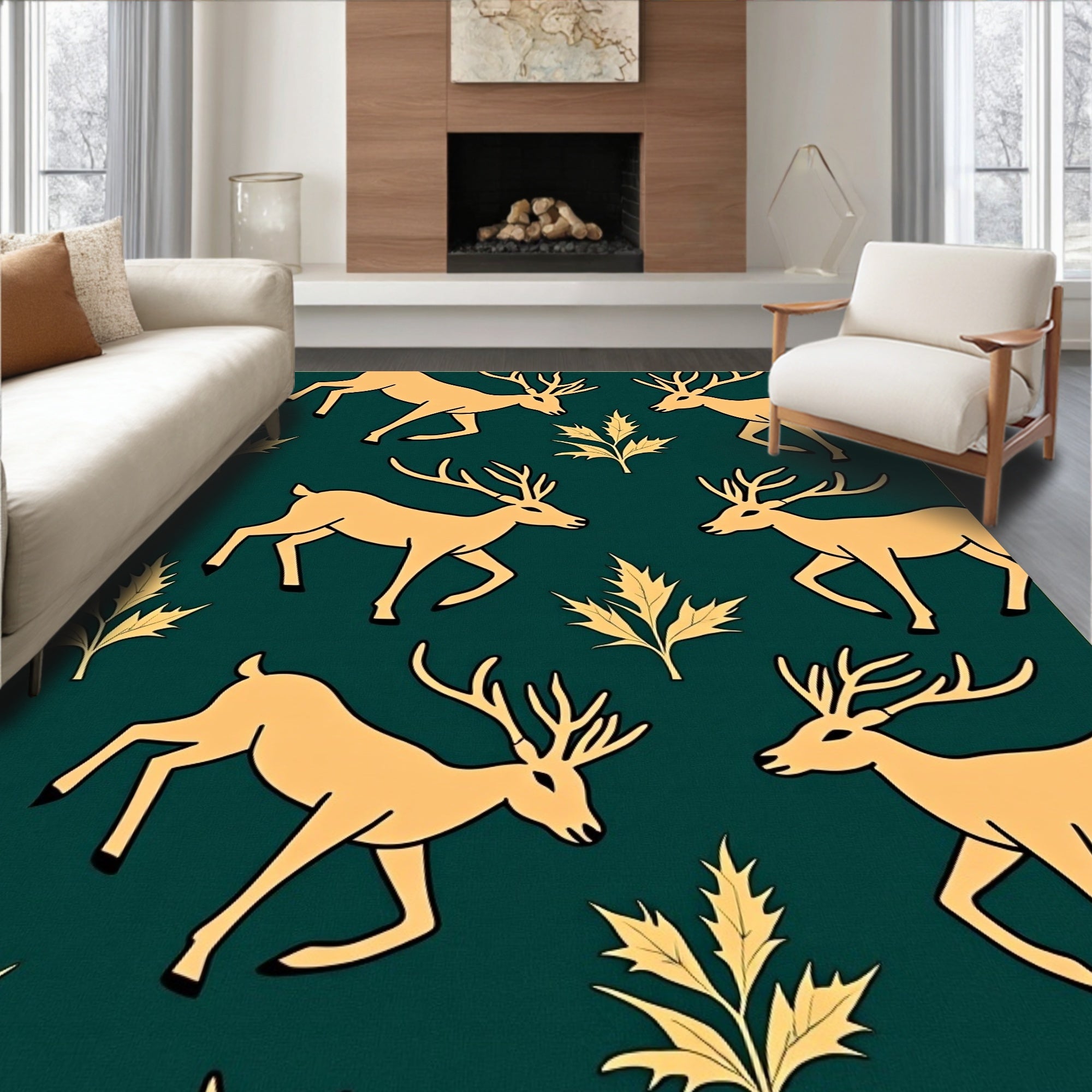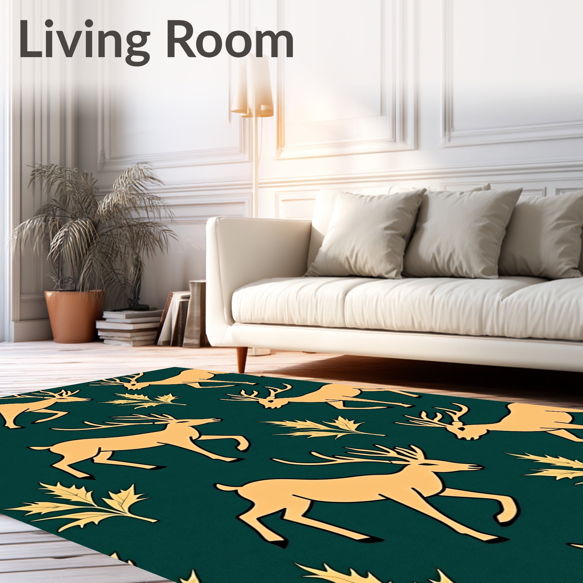 Ultra Soft Area Rug, Non Slip, Stain Resistant, Washable Area Rugs for Living Room, Bedroom, Festive Reindeer Silhouettes with Holly and Pine Needle Motifs(Green) Overview: