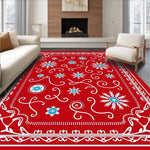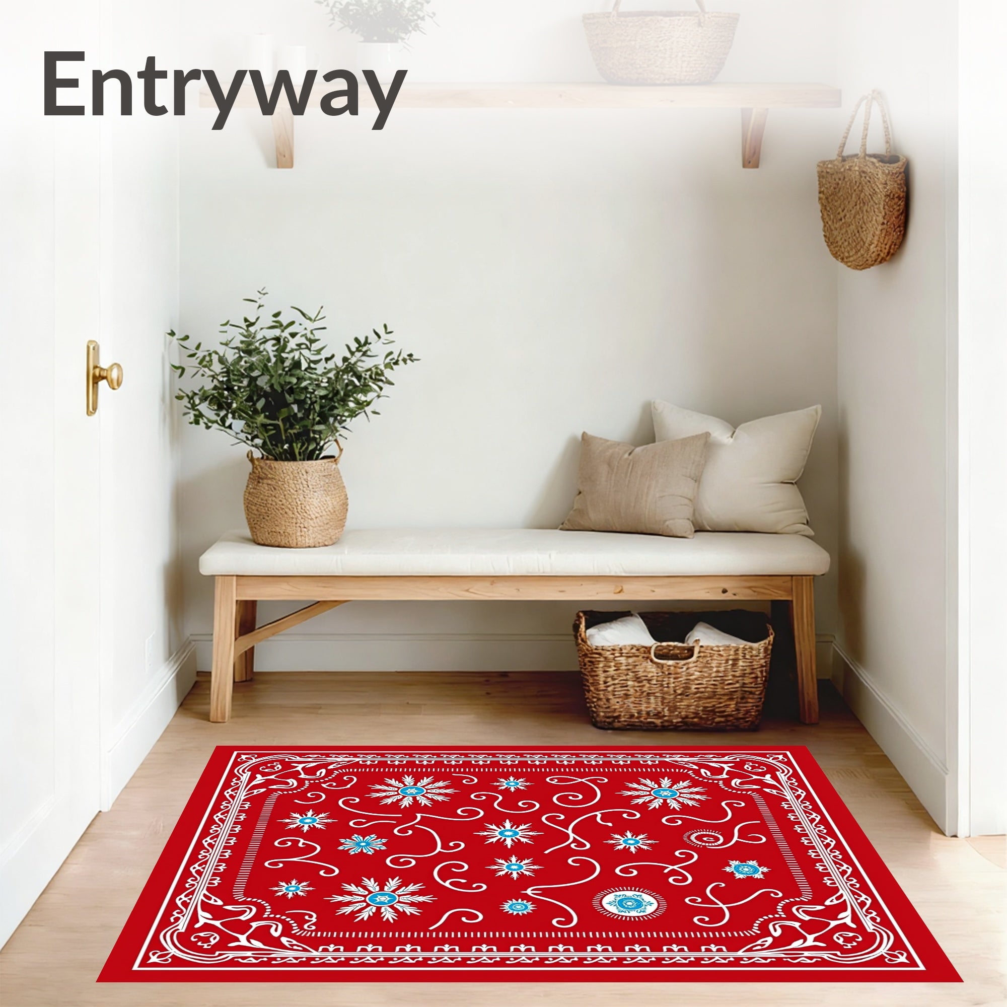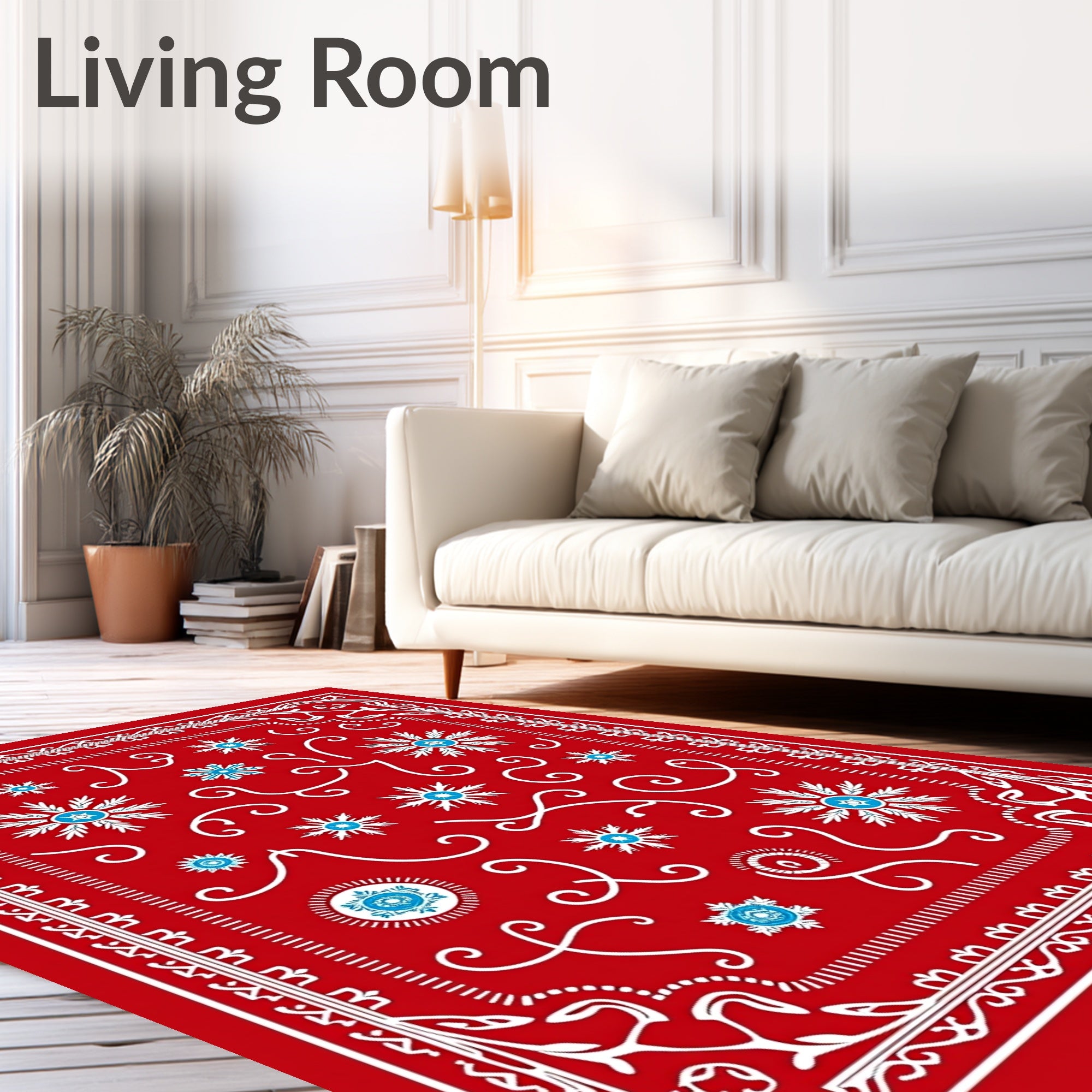 Ultra Soft Area Rug, Non Slip, Stain Resistant, Washable Area Rugs for Living Room, Bedroom, Festive Scrollwork with Interlocking Snow Crystal Details(Red) Overview: