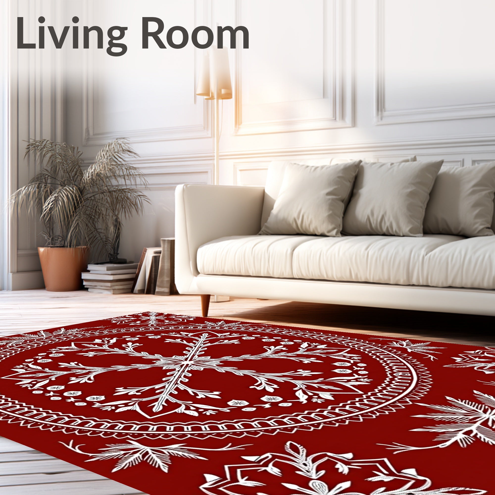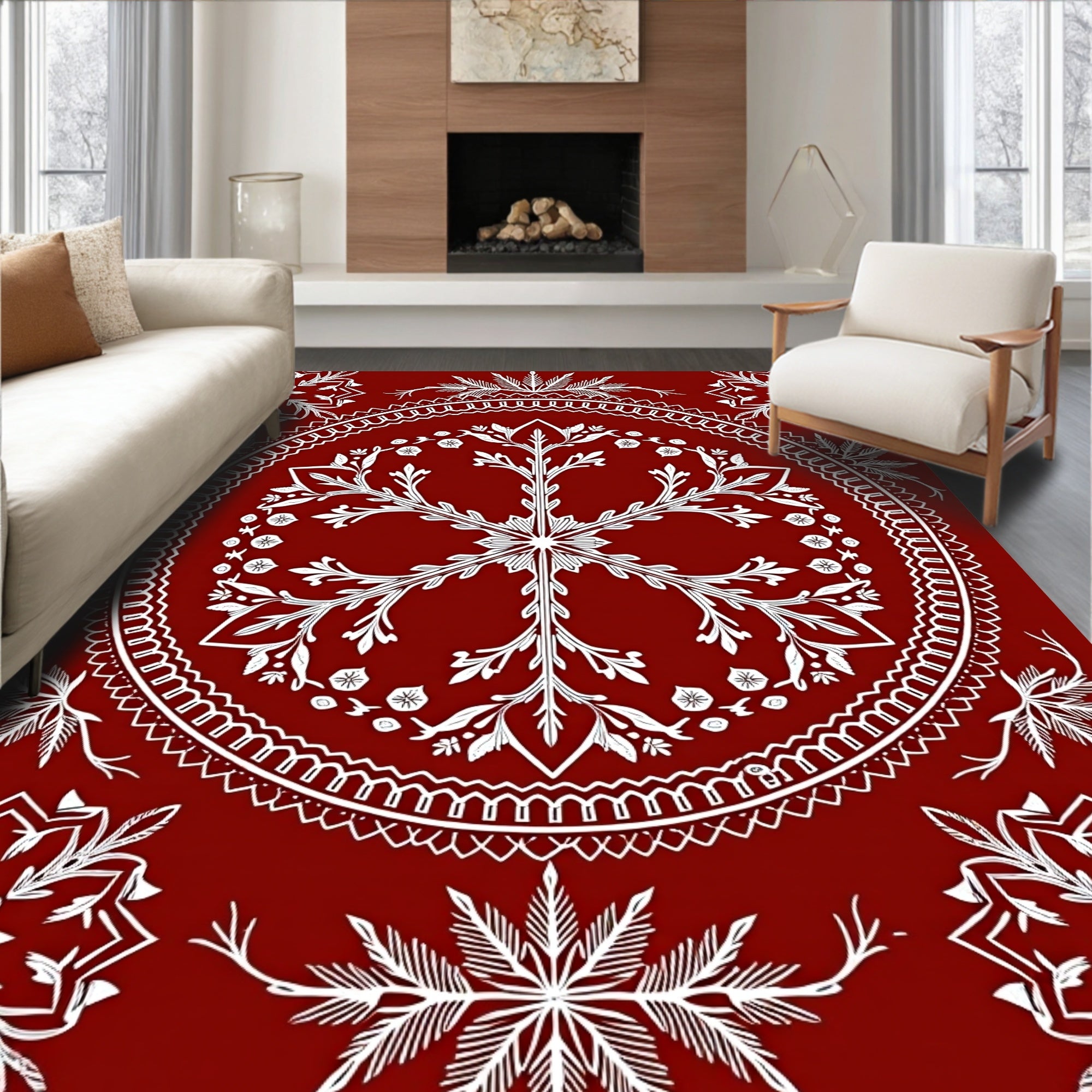 Ultra Soft Area Rug, Non Slip, Stain Resistant, Washable Area Rugs for Living Room, Bedroom, Festive Snowflake Circular Play Holiday Winter Wonderland(Red) Overview: