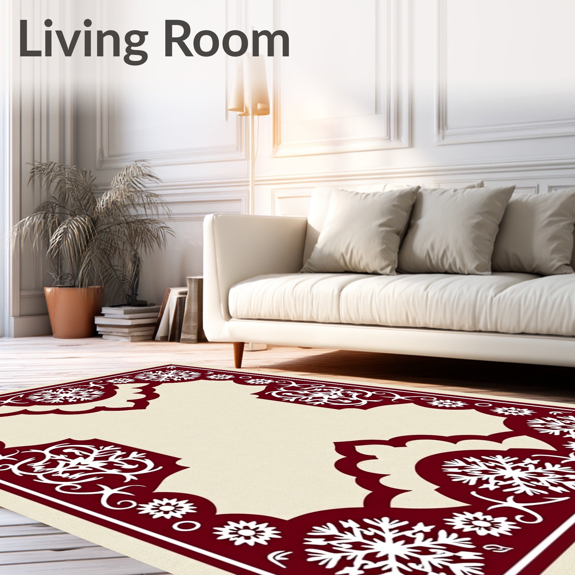 Ultra Soft Area Rug, Non Slip, Stain Resistant, Washable Area Rugs for Living Room, Bedroom, Festive Snowflake Medallion Accent With Interlocking Chevron Borders(Red) Overview: