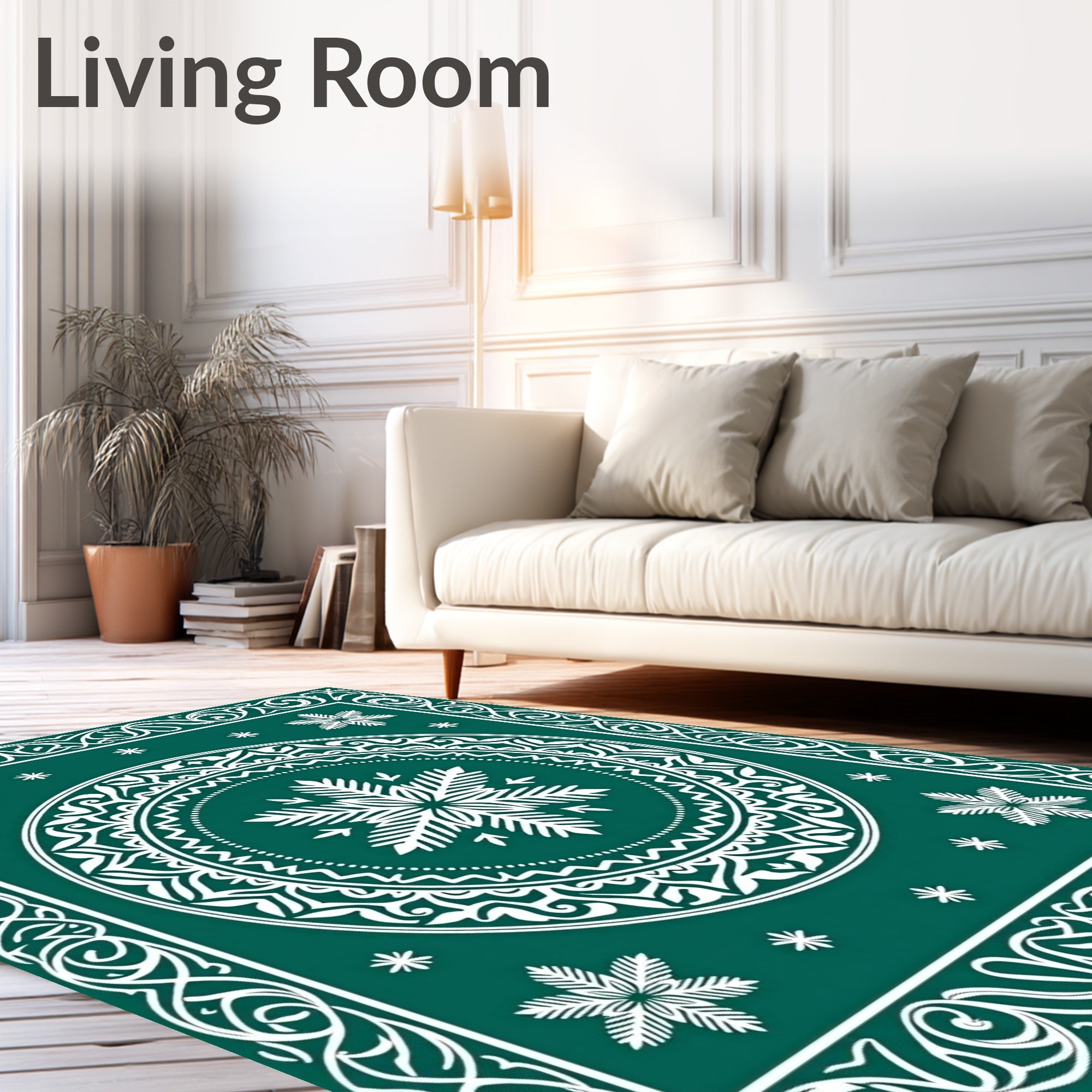 Ultra Soft Area Rug, Non Slip, Stain Resistant, Washable Area Rugs for Living Room, Bedroom, Festive Snowflake Medallion Holiday Decorative(Green) Overview: